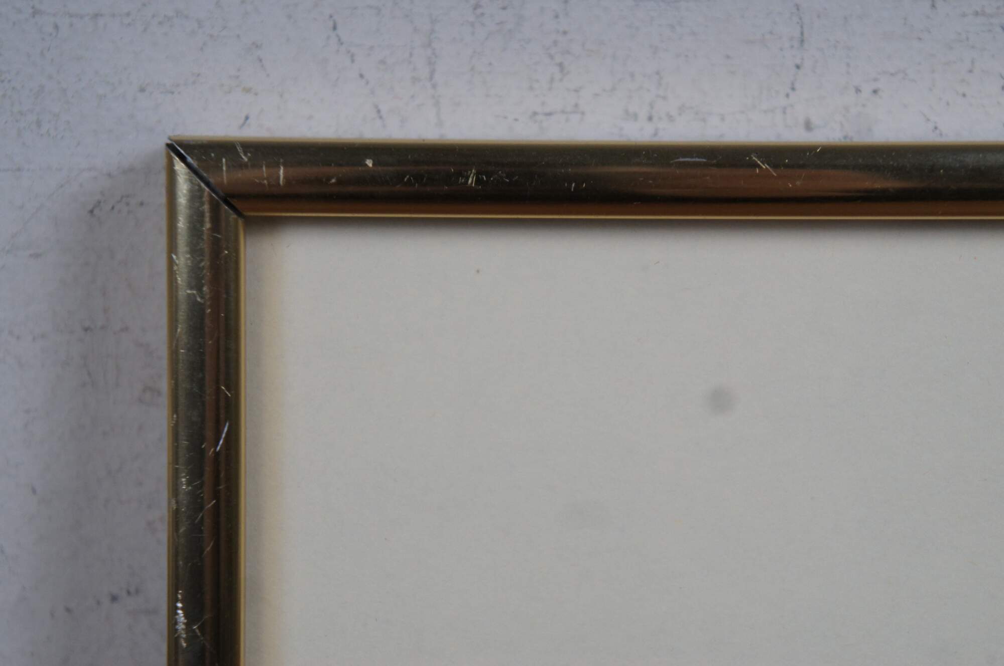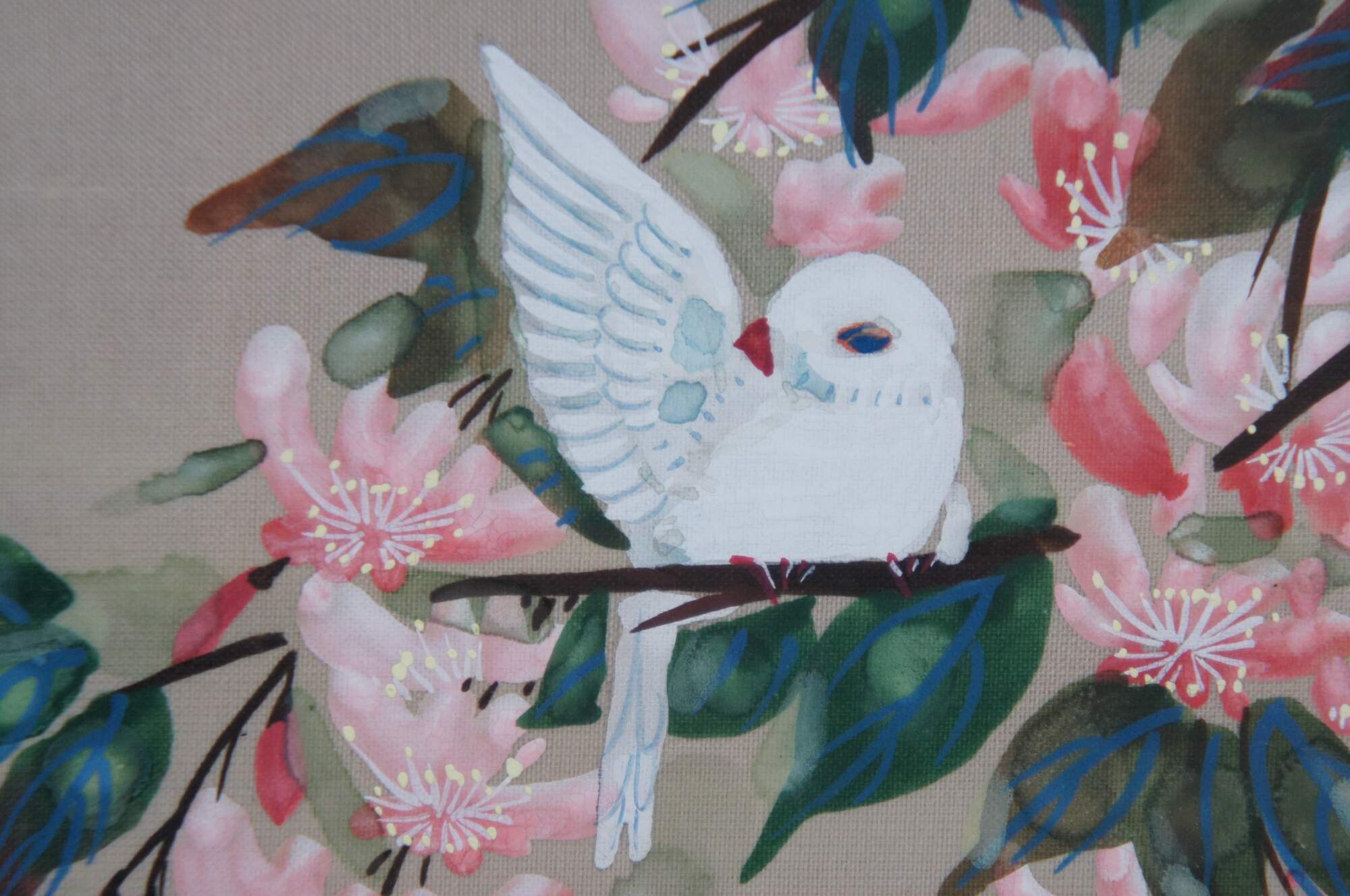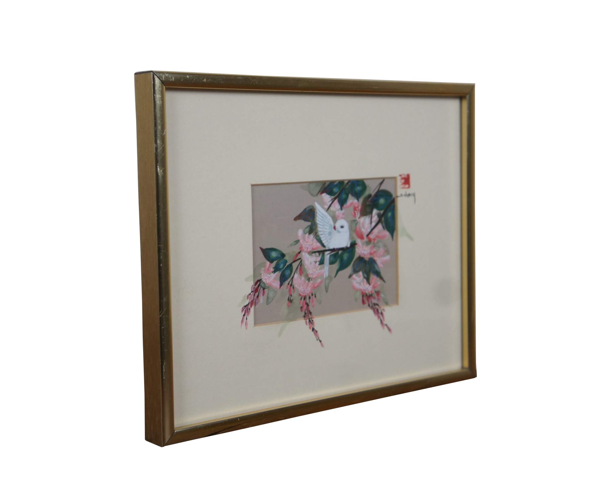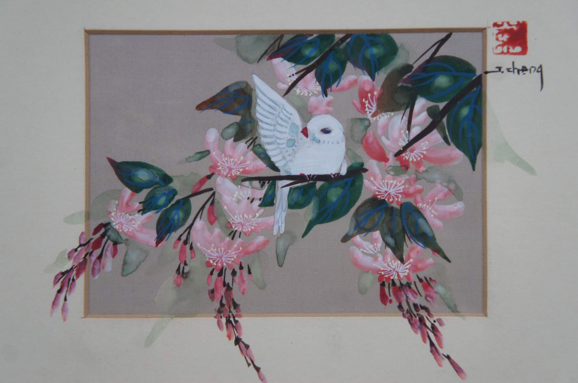 Vintage Chinese / Taiwanese John Cheng gouache / watercolor painting on silk, showing a small white bird / dove on a branch of cherry blossoms that spills off the canvas and onto the mat. Signed J. Cheng / sealed in upper right. Gold metal frame; off white mat.