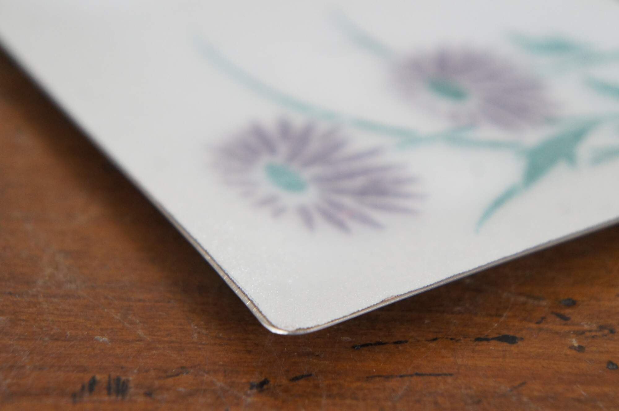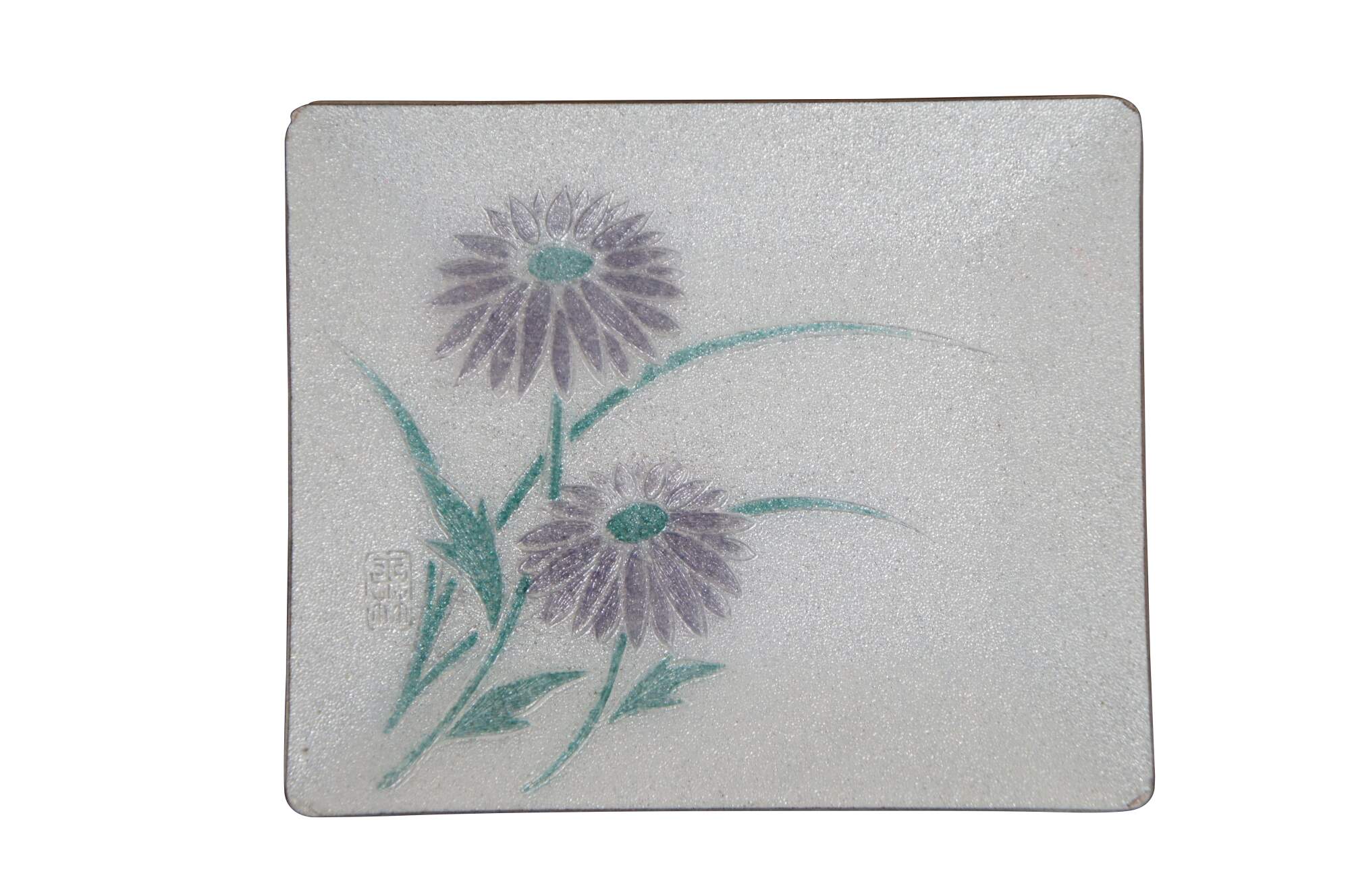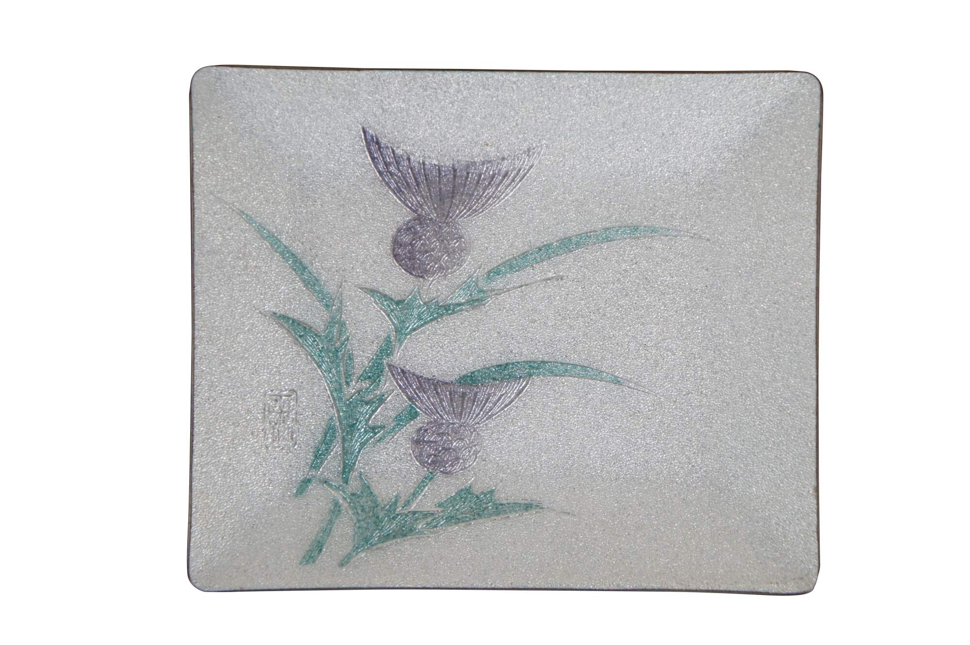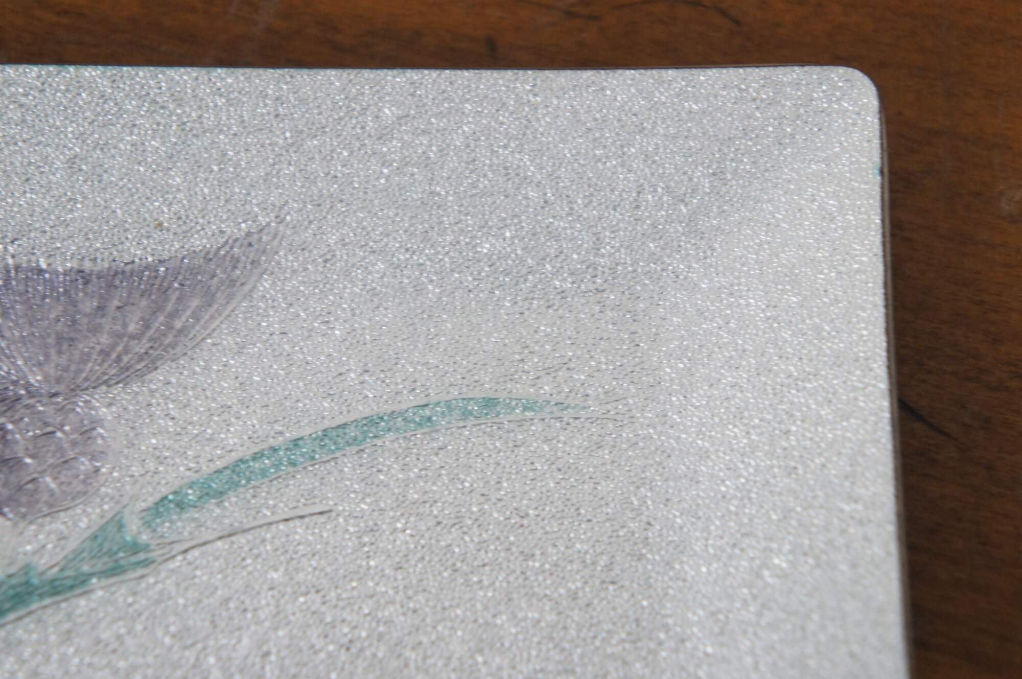 Pair of Tutanka enamel, Japanese wireless cloisonne trinket dishes / sushi trays, featuring a glittering white-silver background with pairs of thistles and daisies in green and purple. Black speckled backs/bases.
