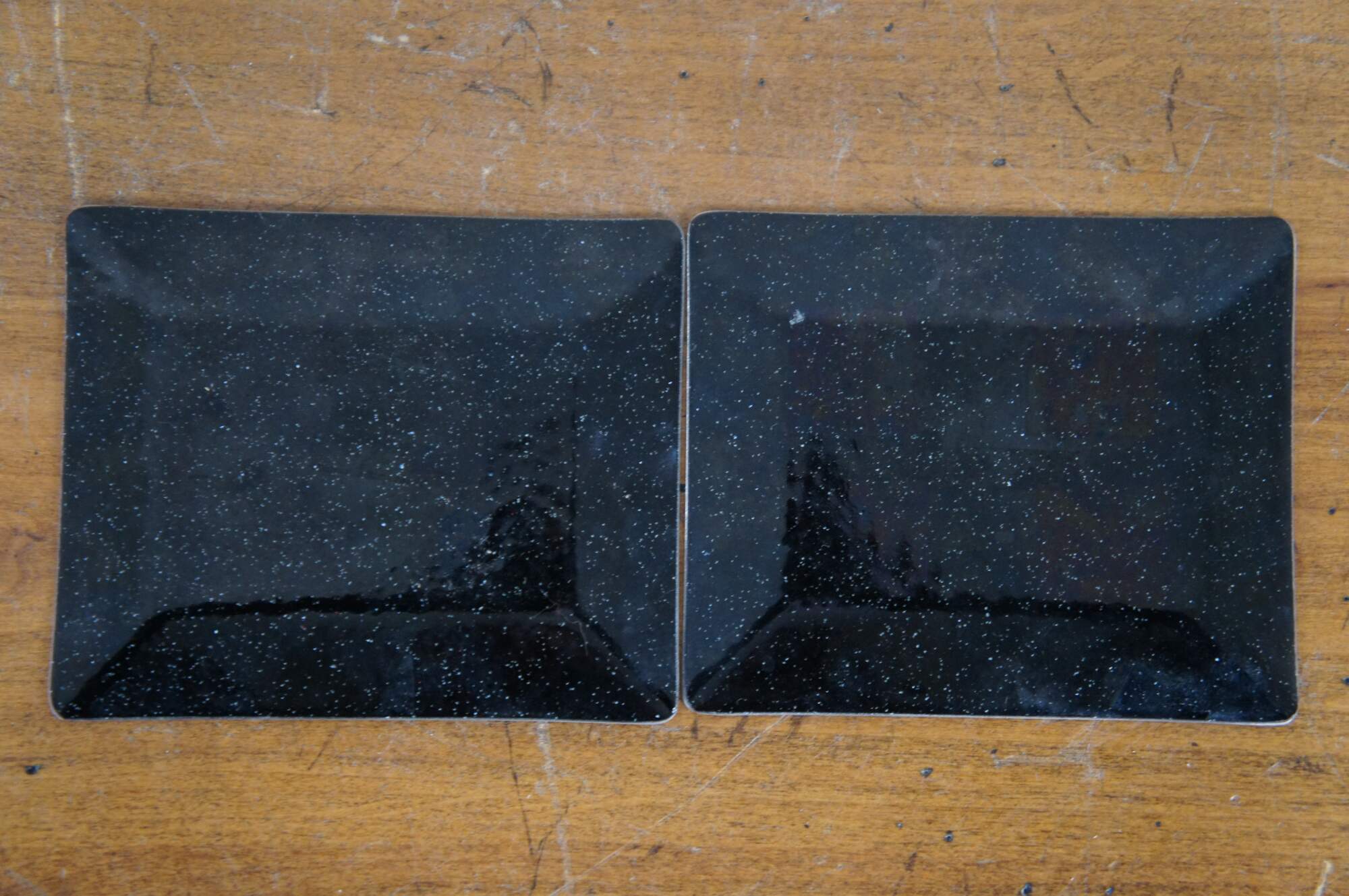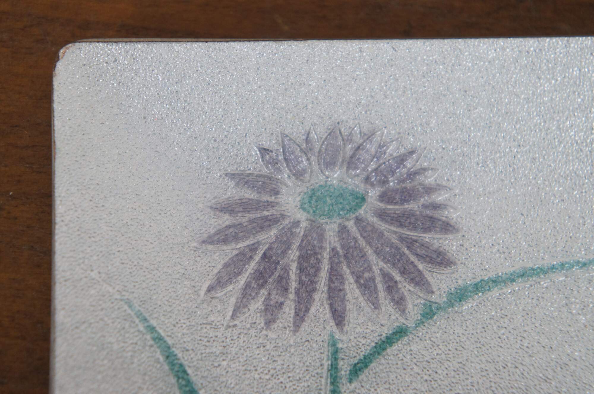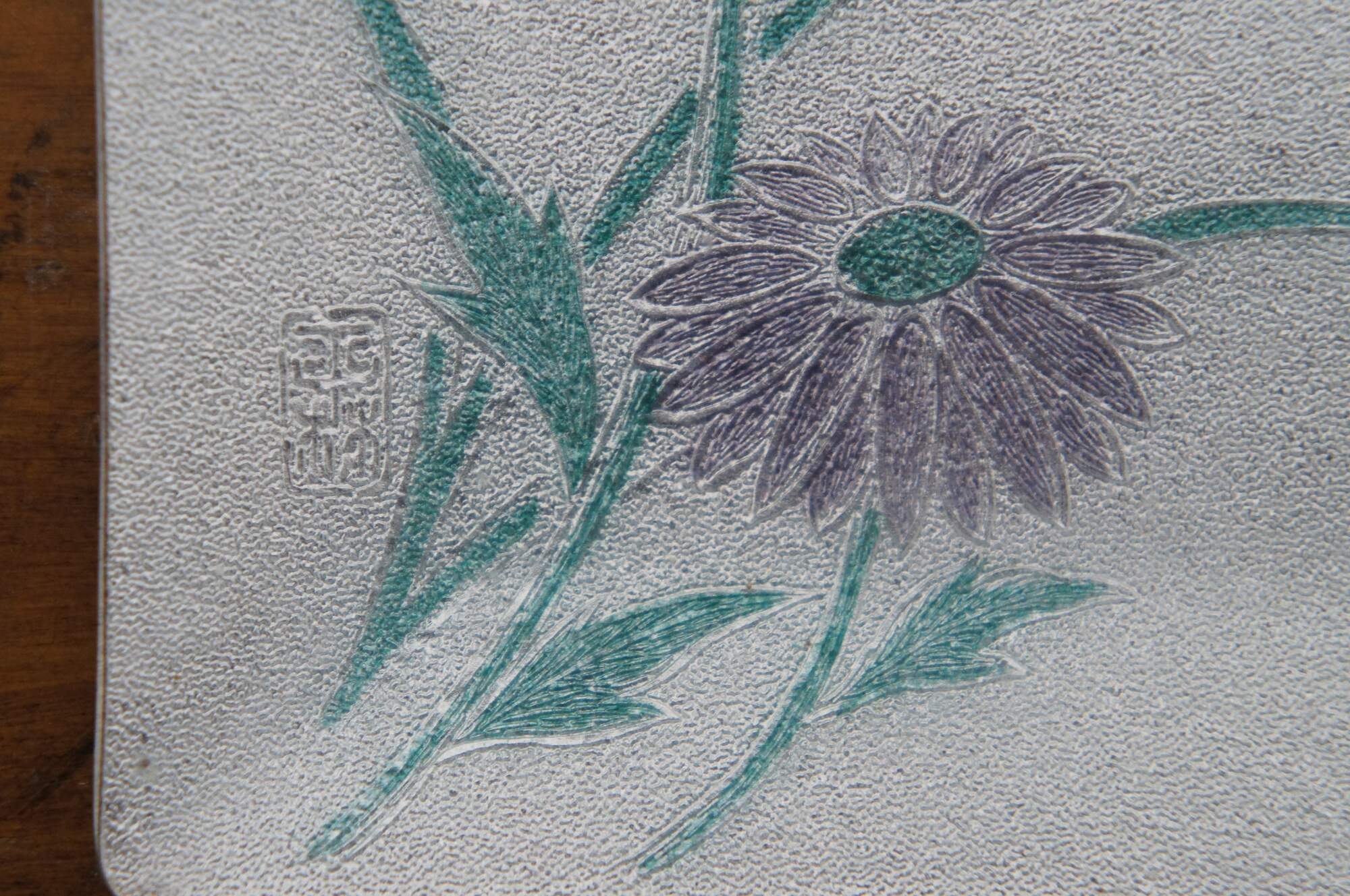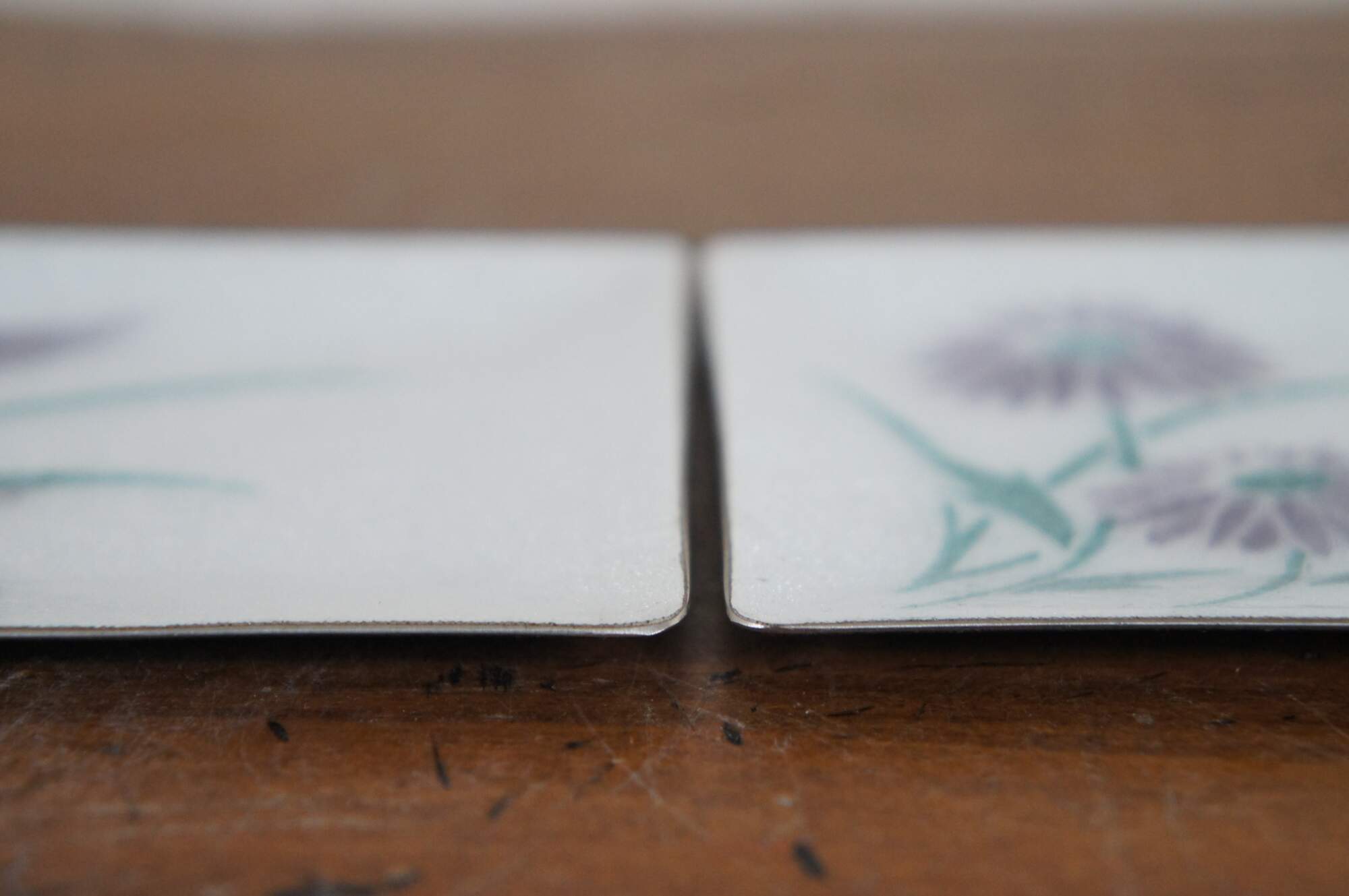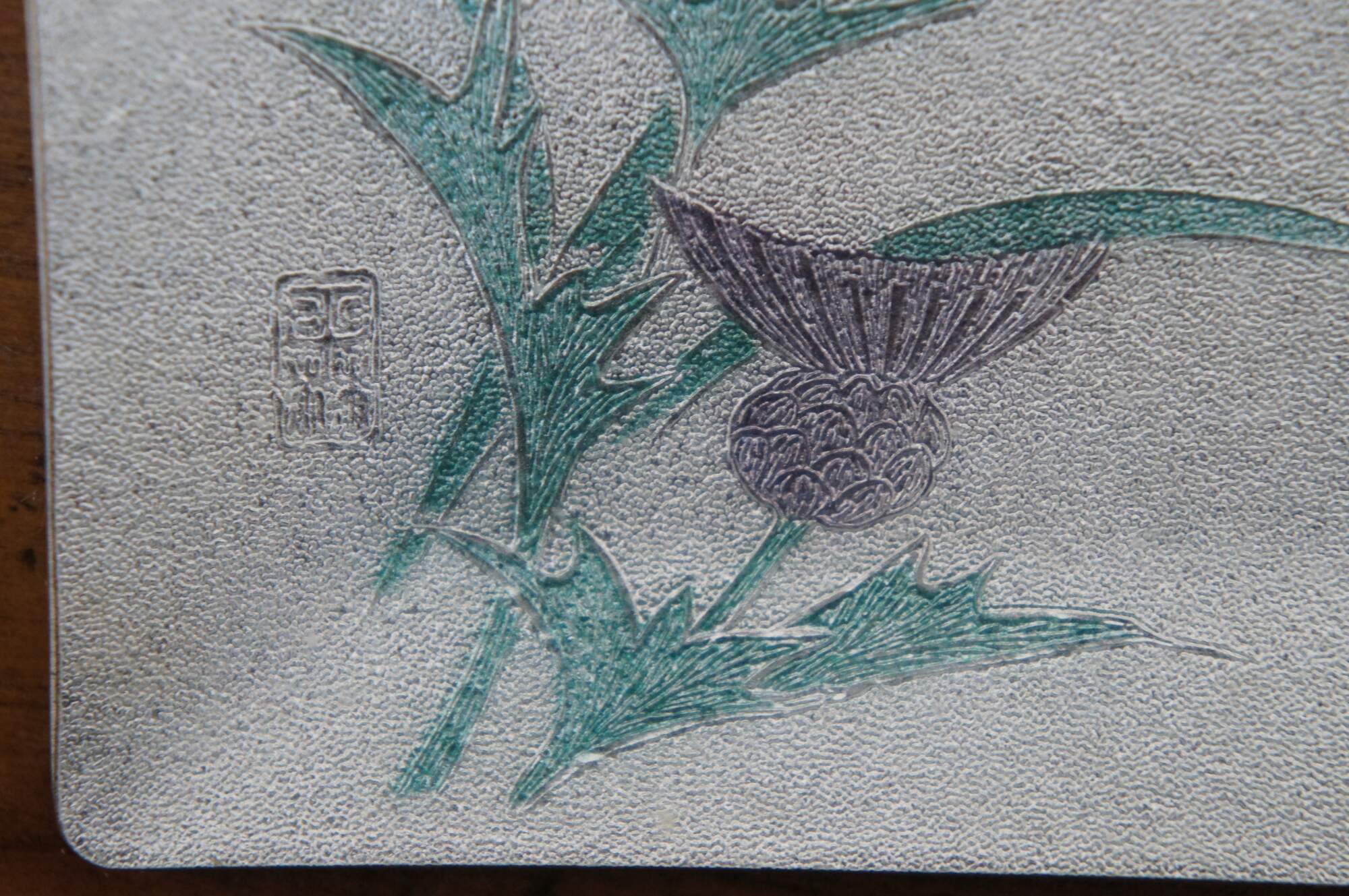 Pair of Tutanka enamel, Japanese wireless cloisonne trinket dishes / sushi trays, featuring a glittering white-silver background with pairs of thistles and daisies in green and purple. Black speckled backs/bases.