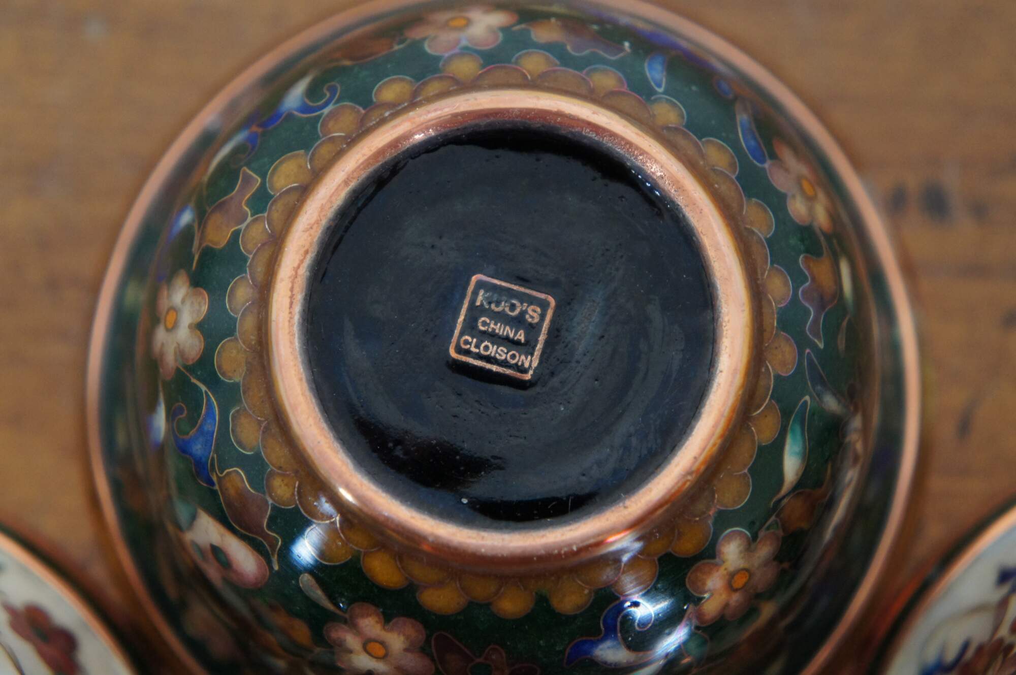 Three vintage Robert Kuo's Chinese copper enameled tea / coffee / saki cups or bowls feautring floral and butterfly motif.