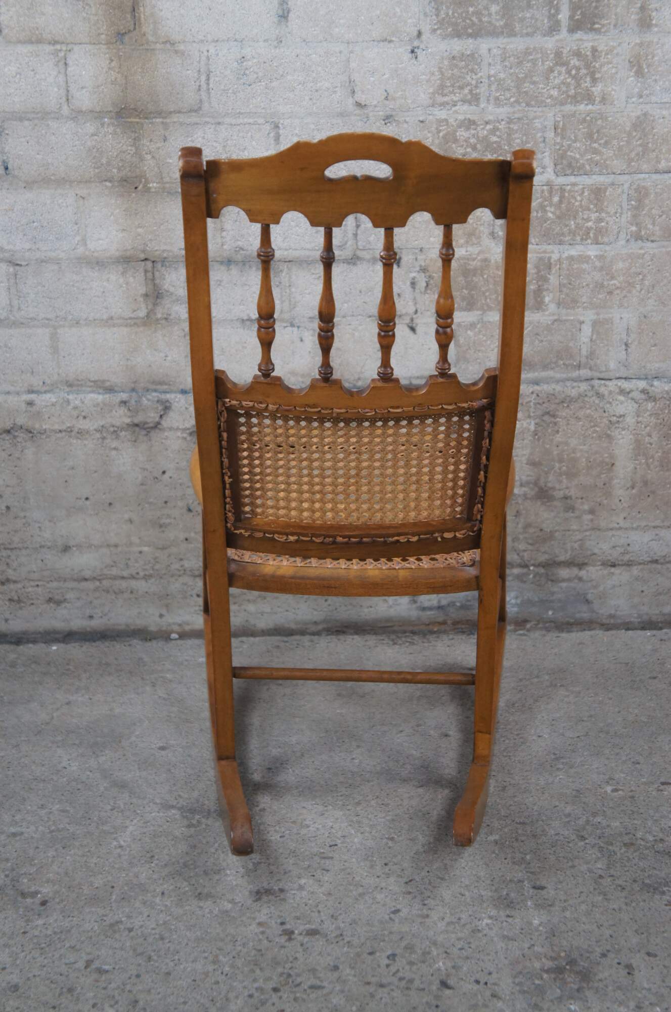 A quaint early American rocking chair, circa 1900s. Made from maple with a spindle back centered between arcade like trim. The chair features a cane seat and back.
