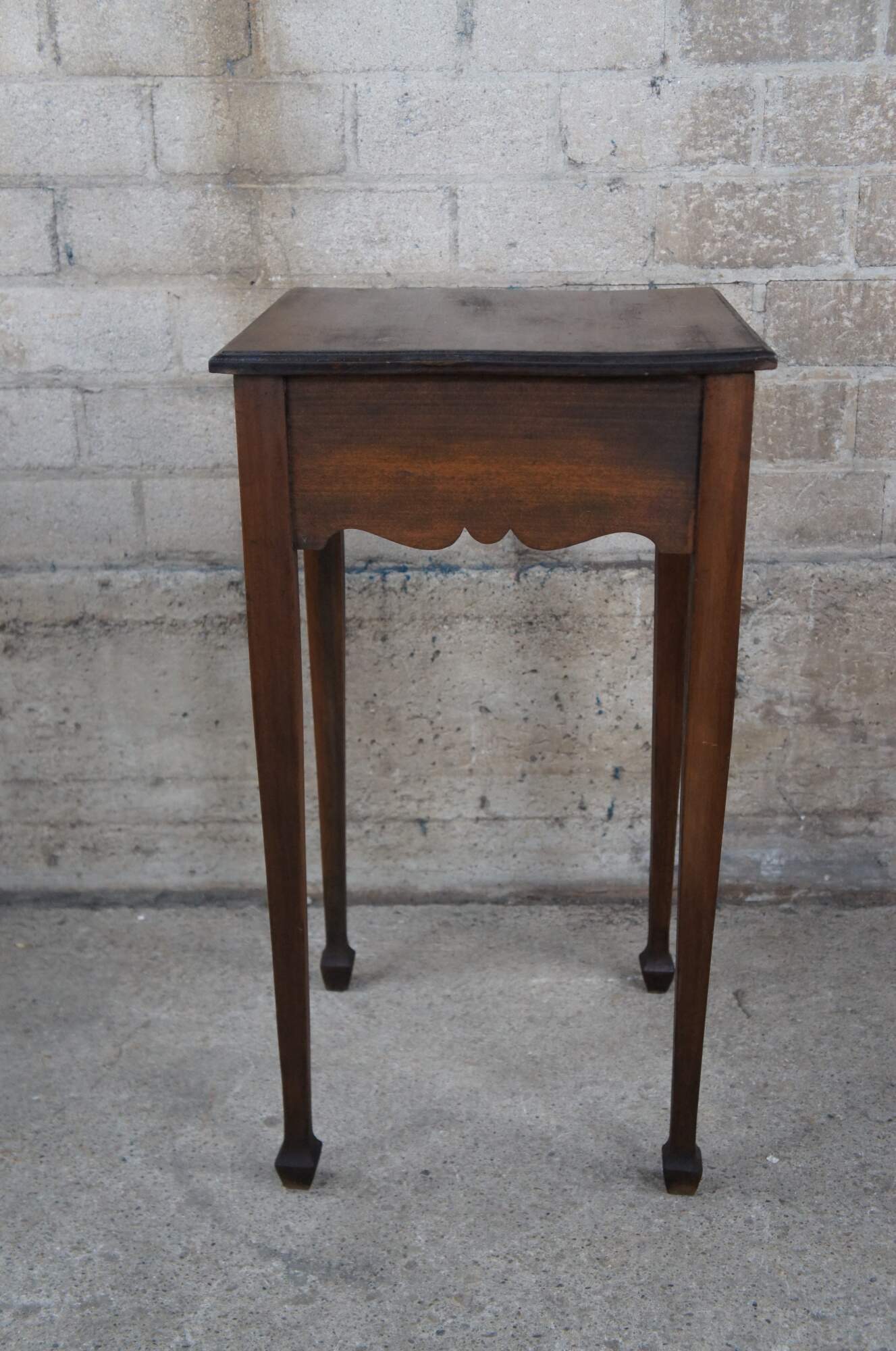20th Century early American style end table with drawer. Features a square form made from pine with central drawer, acorn pull, serpentine cut aprons and federal inspired legs with spade foot.