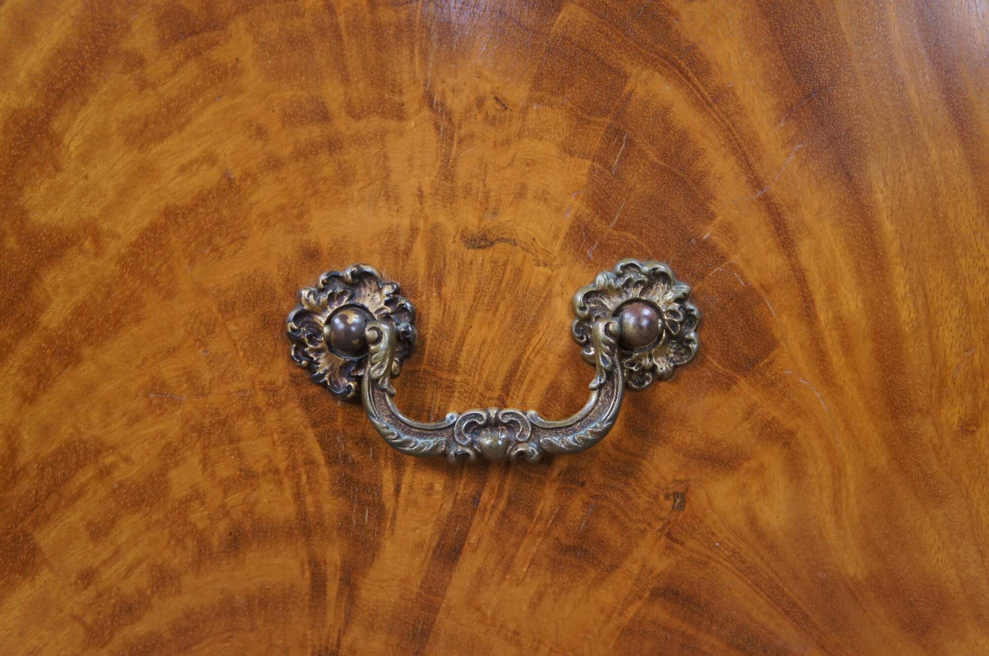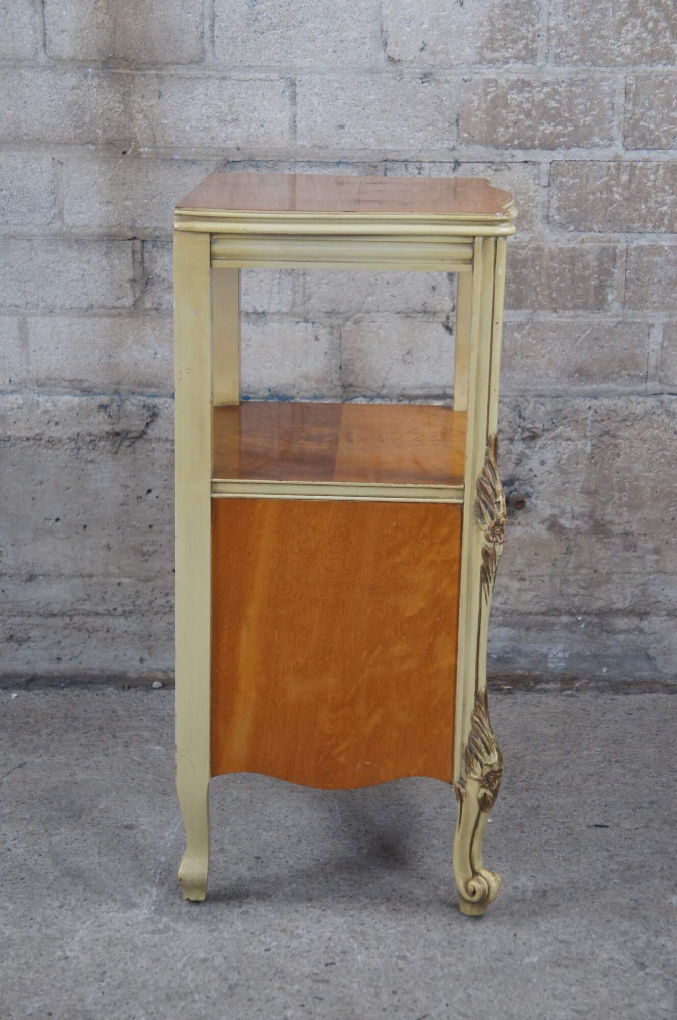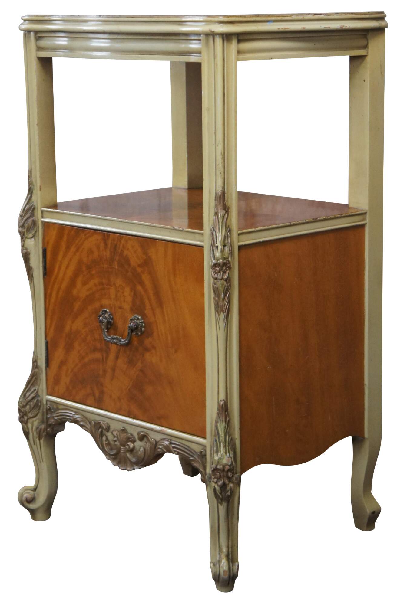 Elegant satinwood nightstand with ornate hand painted gold trim by J.B. Van Sciver Co. A Serpentine form with tiered design allowing for two surfaces for display. Lower Door opens with a cast bronze pull for storage. Made by the J. B. Van Sciver Co. of Camden, New Jersey, which was in business from 1881-1984. The company produced a wide variety of furniture in contemporary and previous era styles as well as western and eastern styles, and including everything from bed and dining sets to lamps, clocks, rugs, curtains and custom-made draperies. Styles ranged from ornate and oriental to the more simplistic mission and colonial furniture. They even produced their own brand of furniture polish which sold for 45 cents in the 1920s.