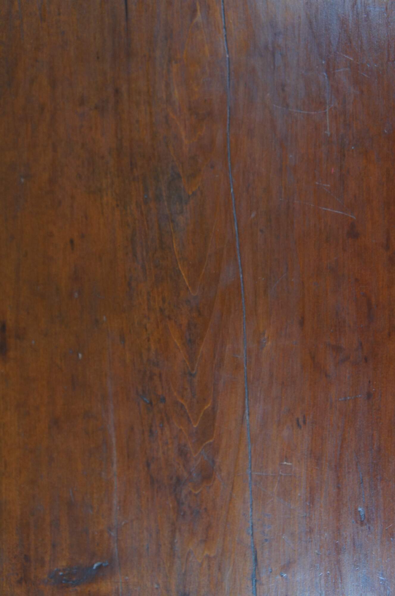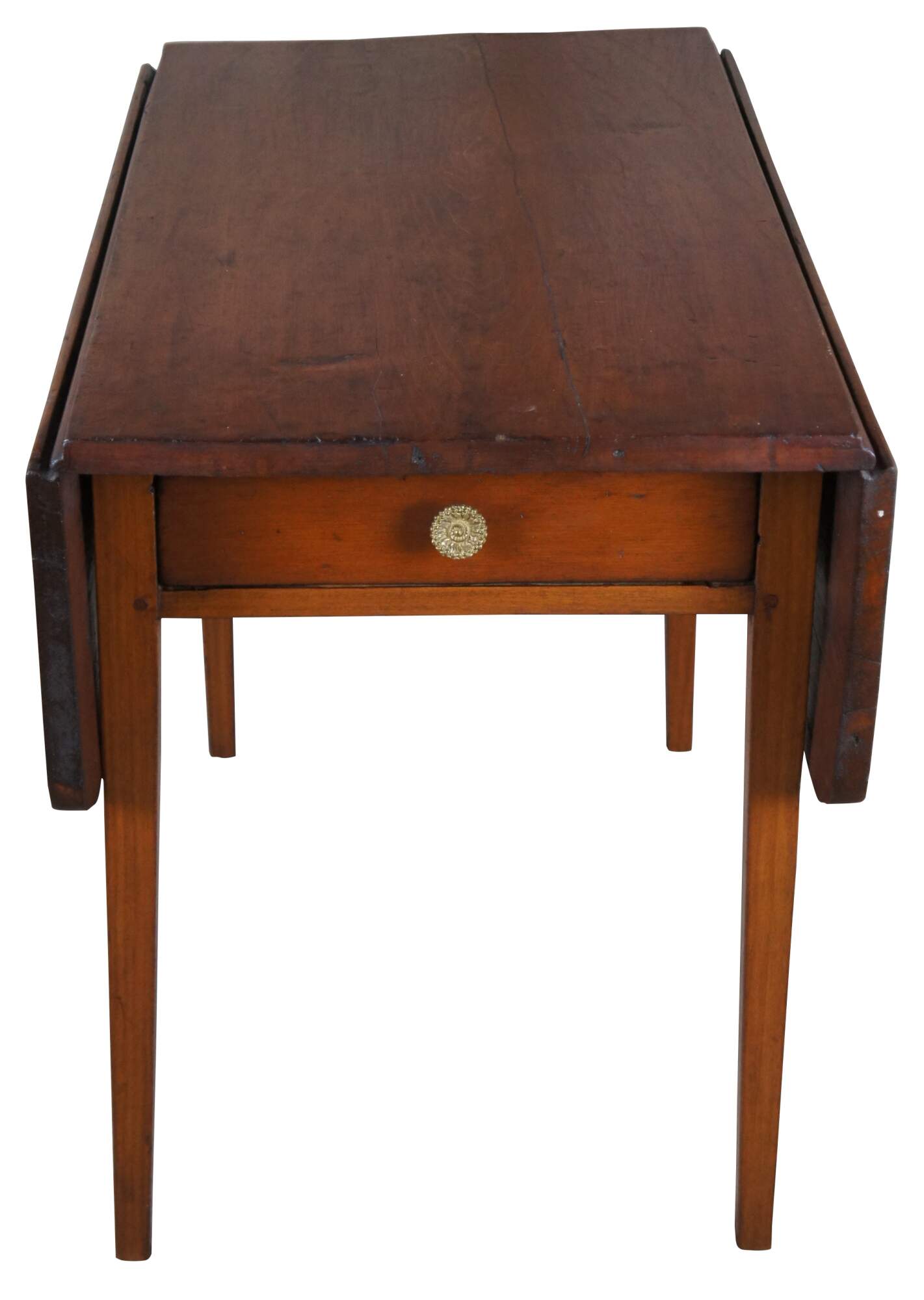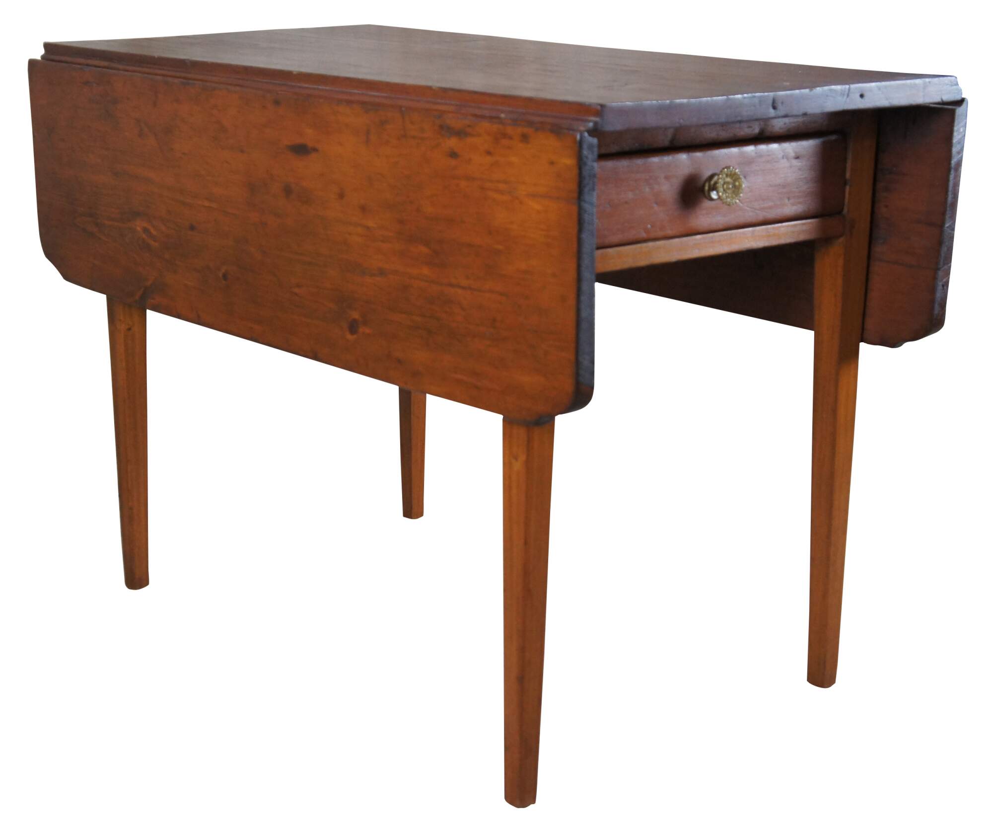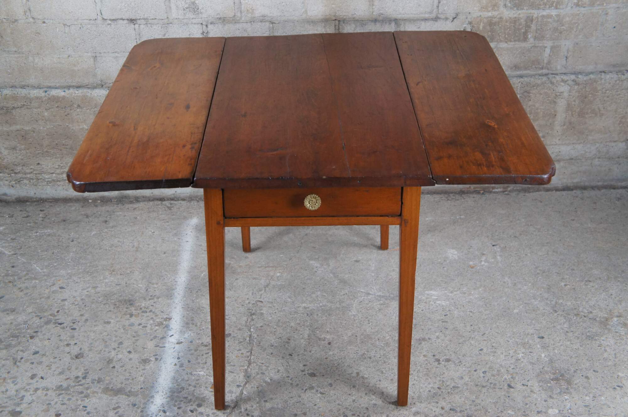A quaint early 20th century farmhouse drop leaf breakfast table or console. A rectangular form made from pine with cut corners along the leaves. Features a long central drawer with decorative brass pull and square tapered legs.