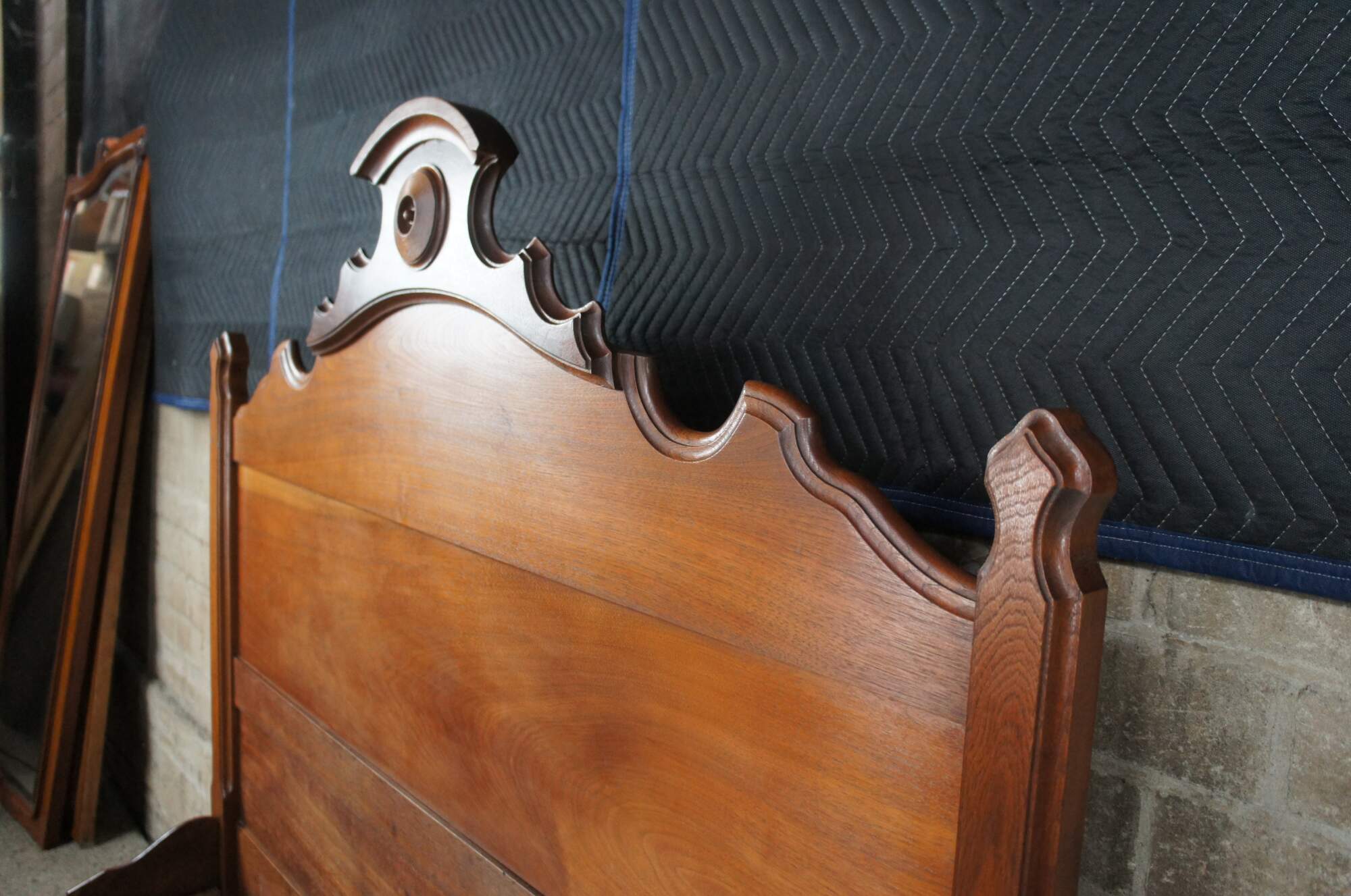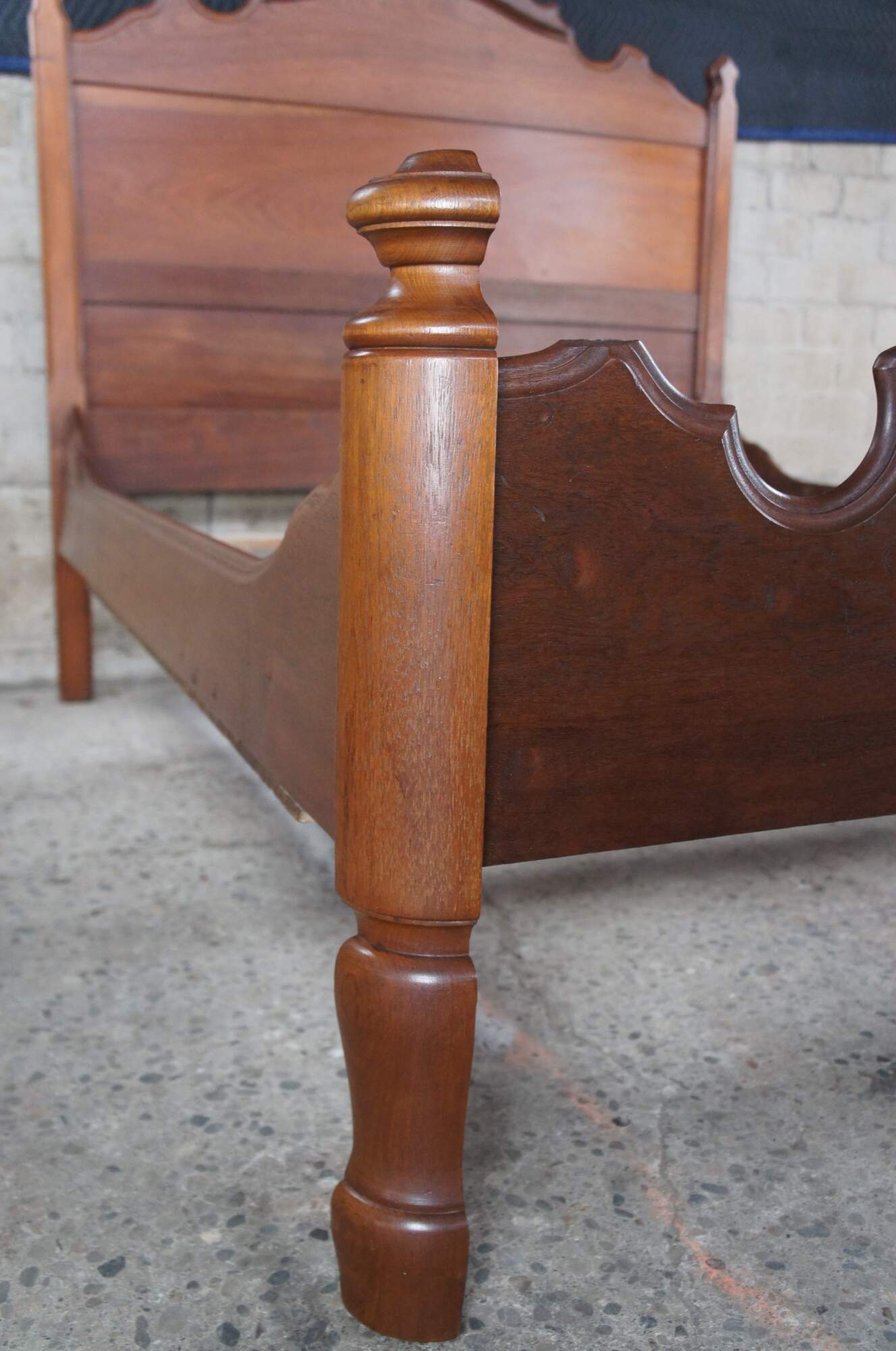 An antique Victorian era bed frame. Made from walnut with carved frame featuring embellishments along the headboard and foot board.
