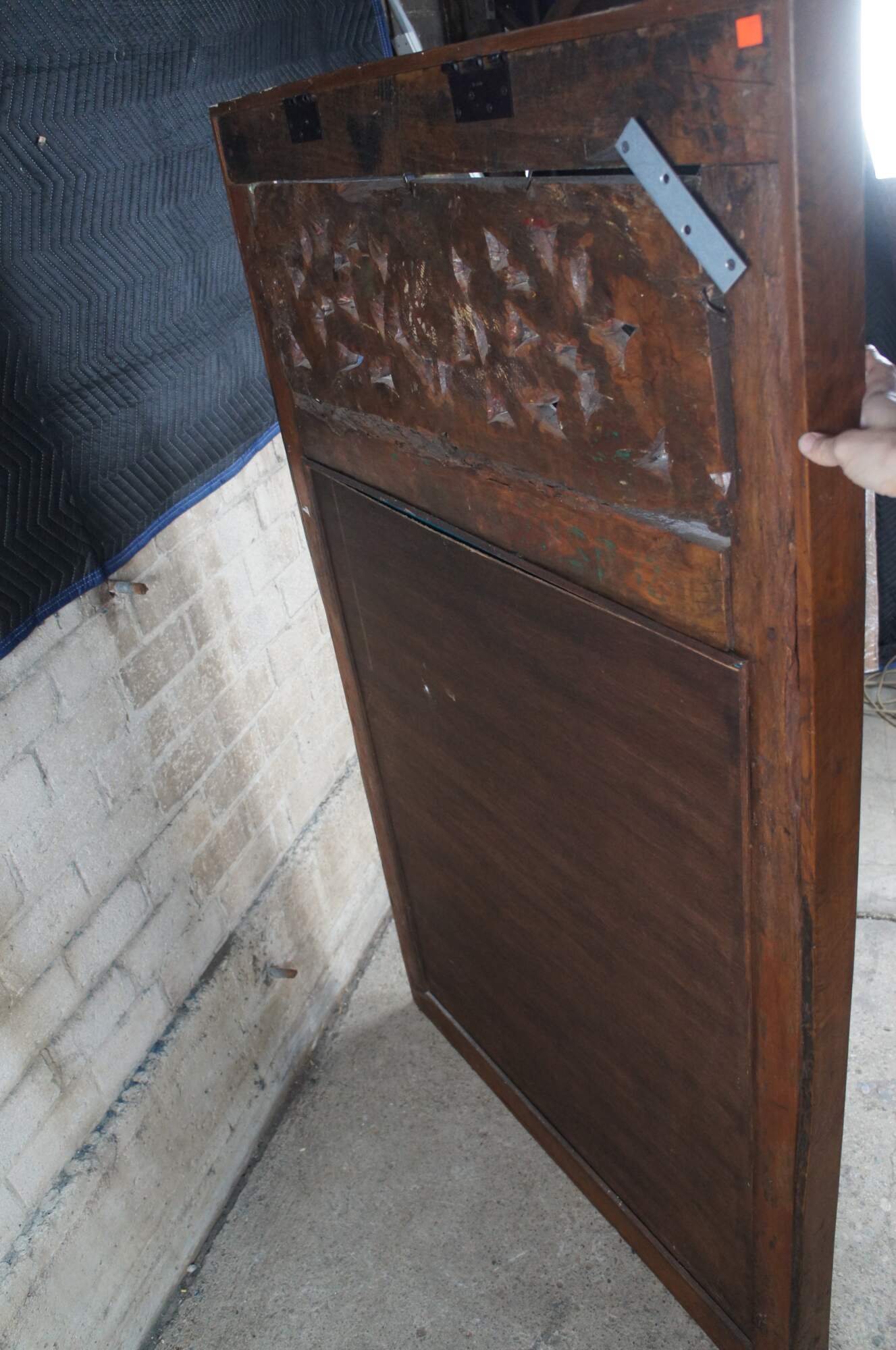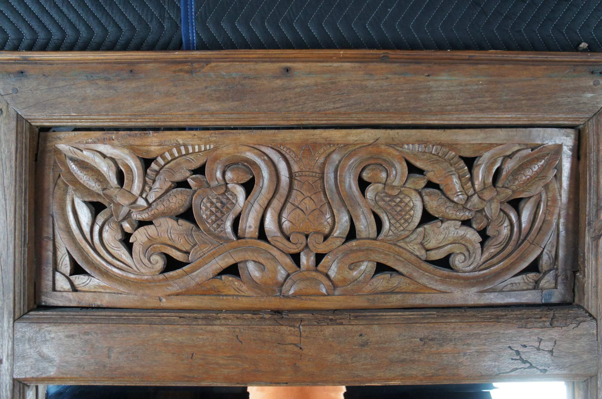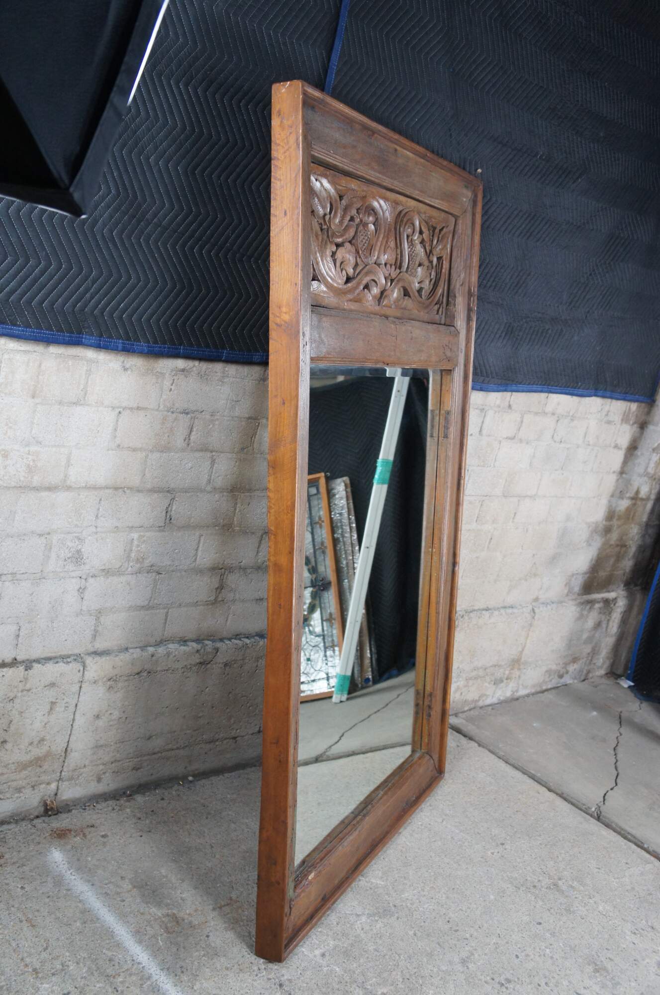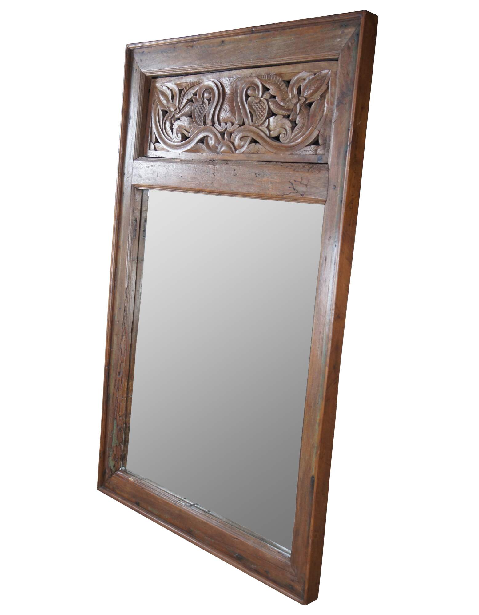 Impressive Indonesian carved mahogany over mantel or wall hanging mirror. Re-claimed or salvaged from a doorway or shutter. Original hinge marks can be seen along the inside of the trim. Features a rectangular frame with pierced foliate crown and large beveled glass