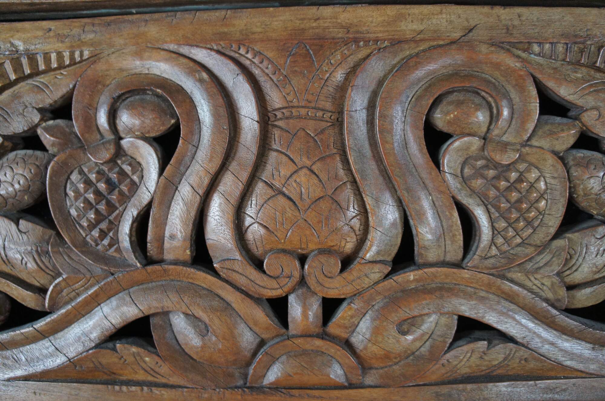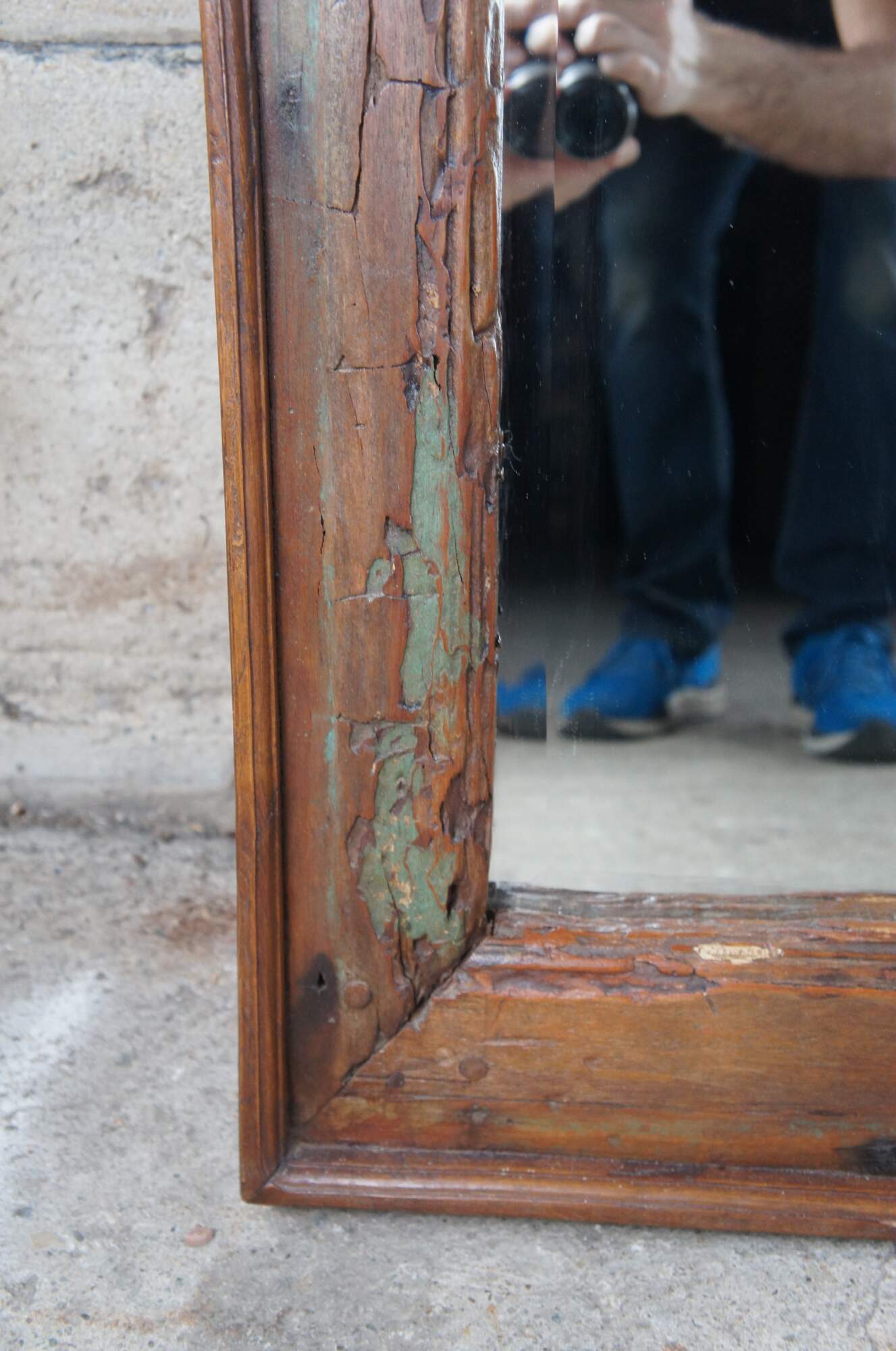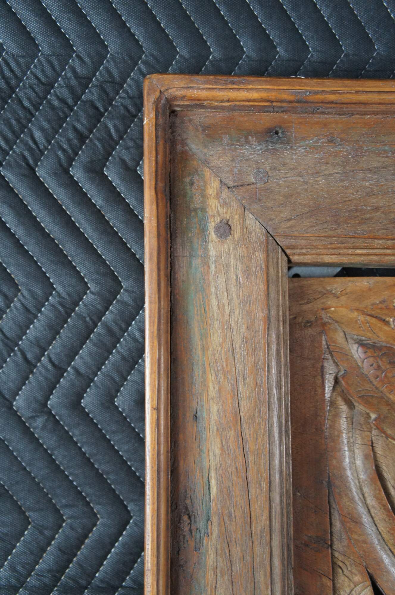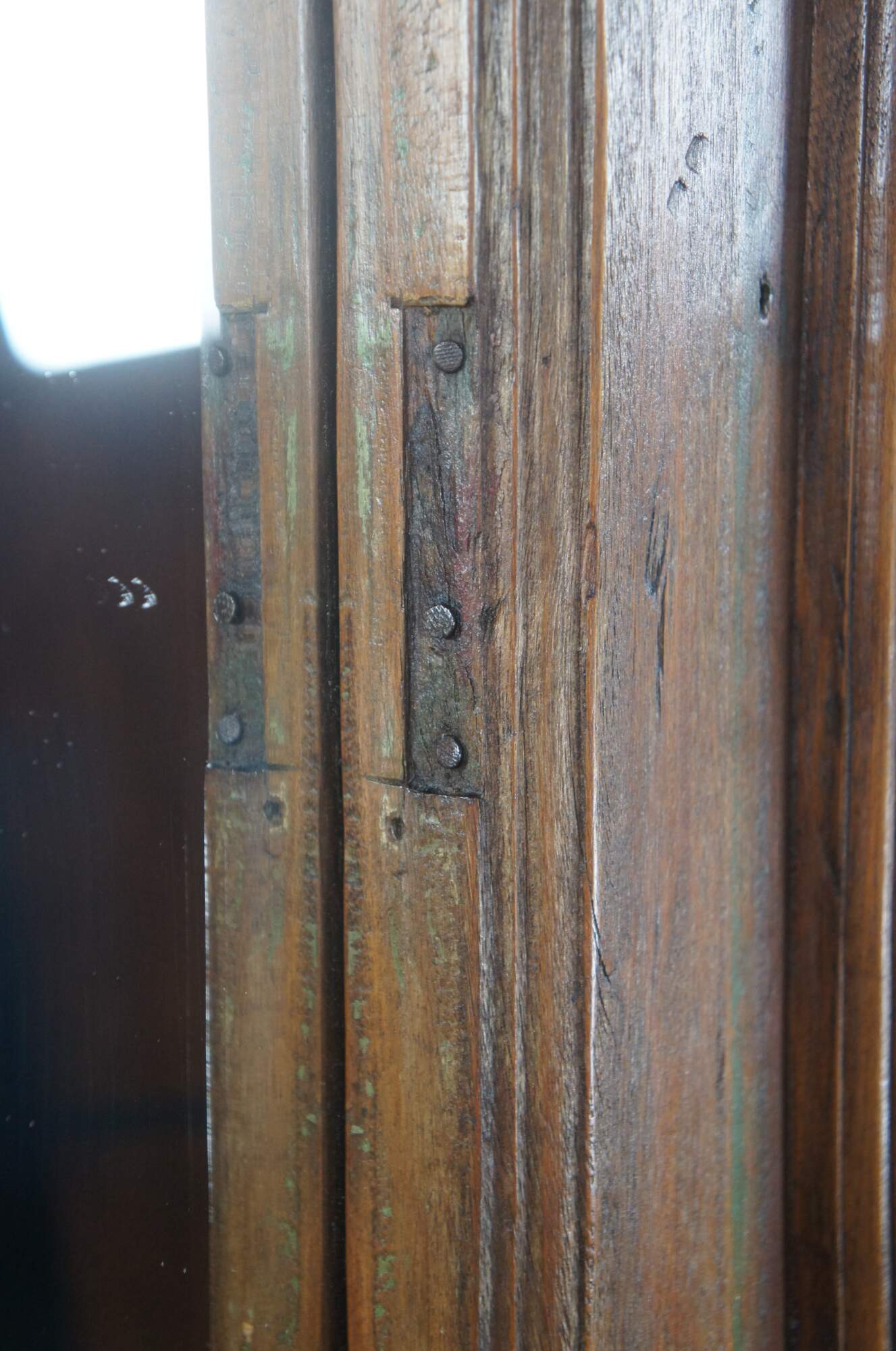 Impressive Indonesian carved mahogany over mantel or wall hanging mirror. Re-claimed or salvaged from a doorway or shutter. Original hinge marks can be seen along the inside of the trim. Features a rectangular frame with pierced foliate crown and large beveled glass