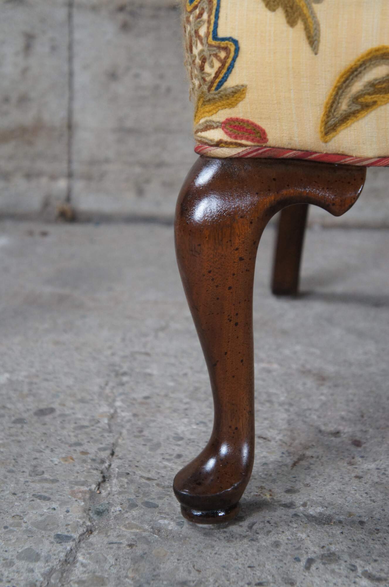 Two vintage Queen Anne library wingback easy armchairs featuring crewel floral upholstery with distressed mahogany cabriole legs leading to pad feet.