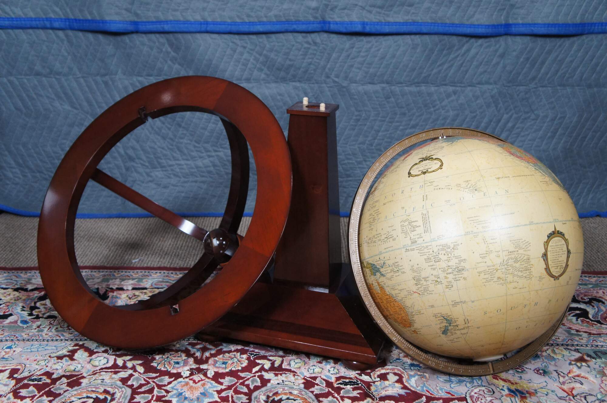 Vintage Replogle 16” floor globe set in an elegant pedestal stand with brass meridian. Batteries can be inserted for illumination.