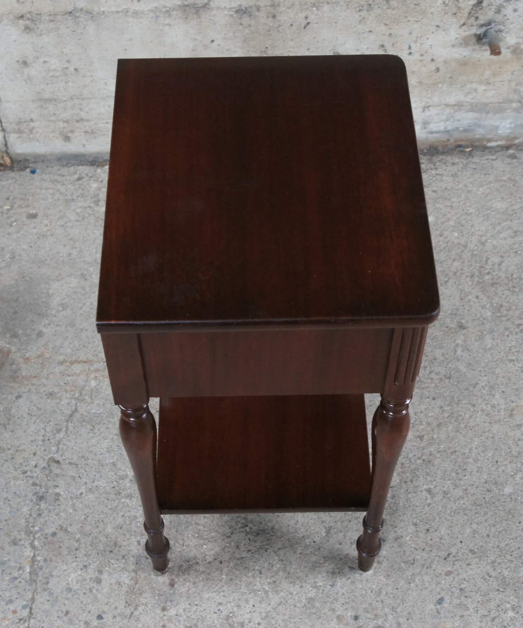 Antique mahogany two tiered nightstand or side table featuring an upper drawer with colonial style hardware and fluted and turned accents. Drawing inspiration from William & Mary and Georgian styling. C. 1940s