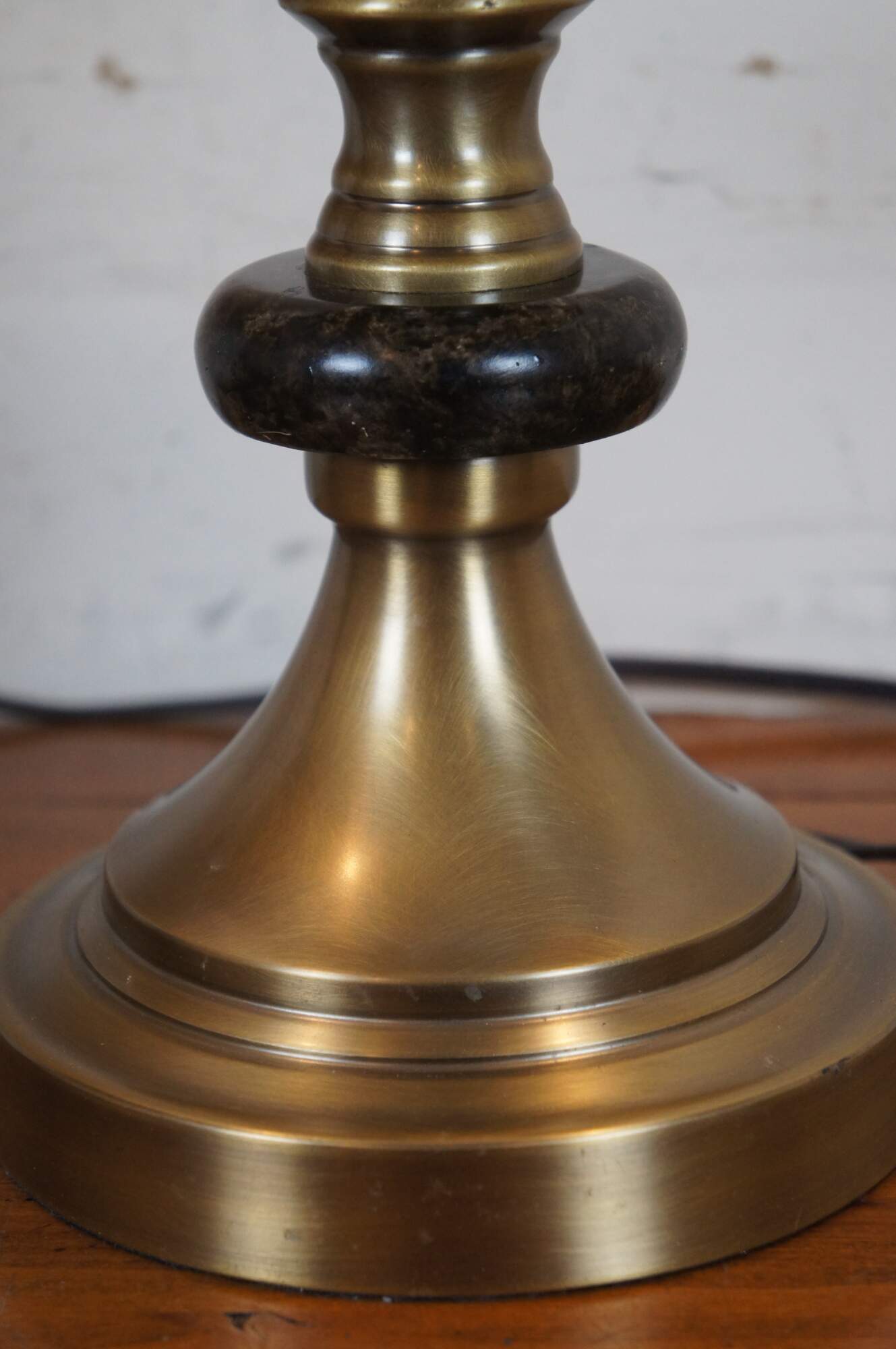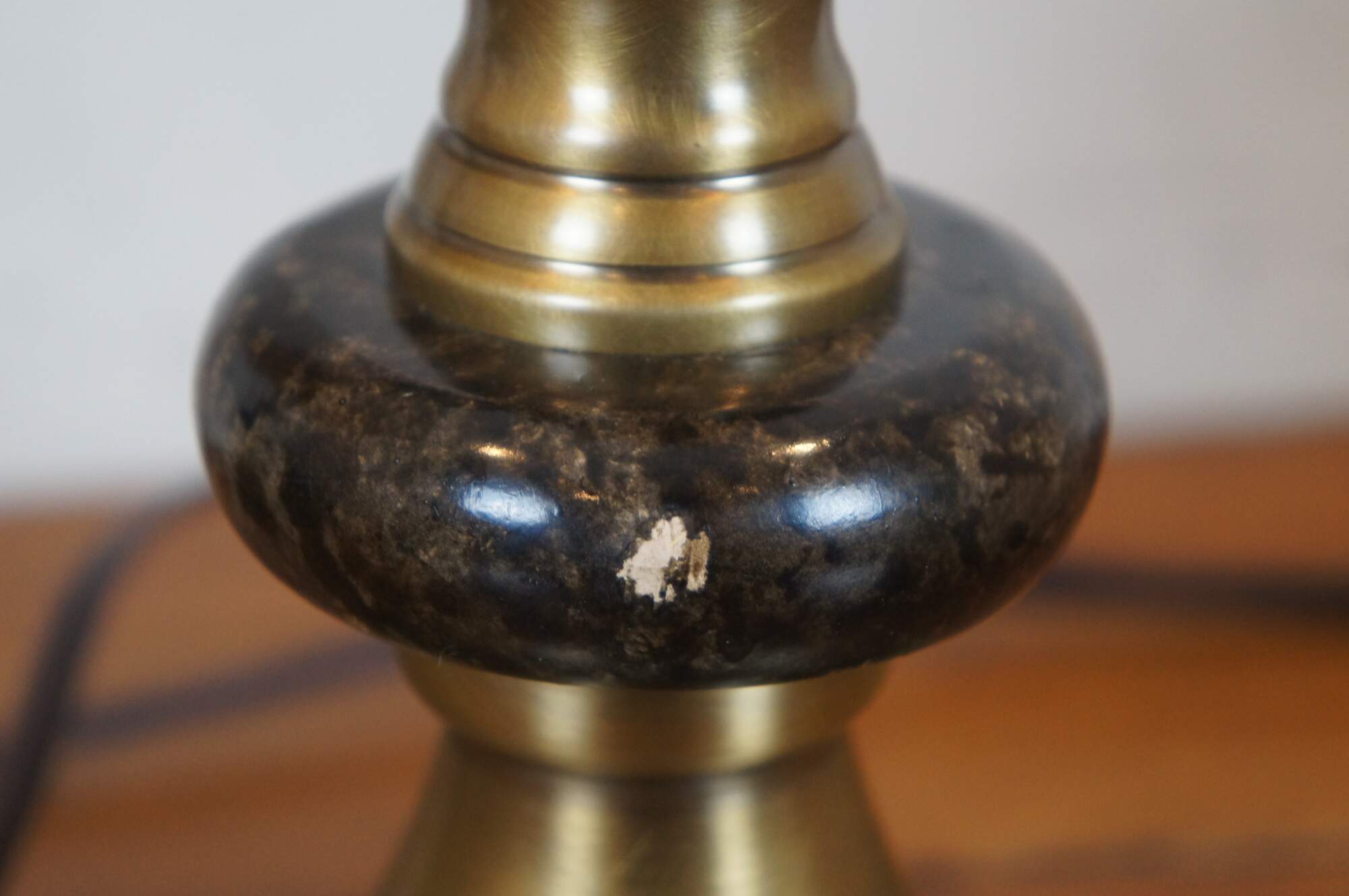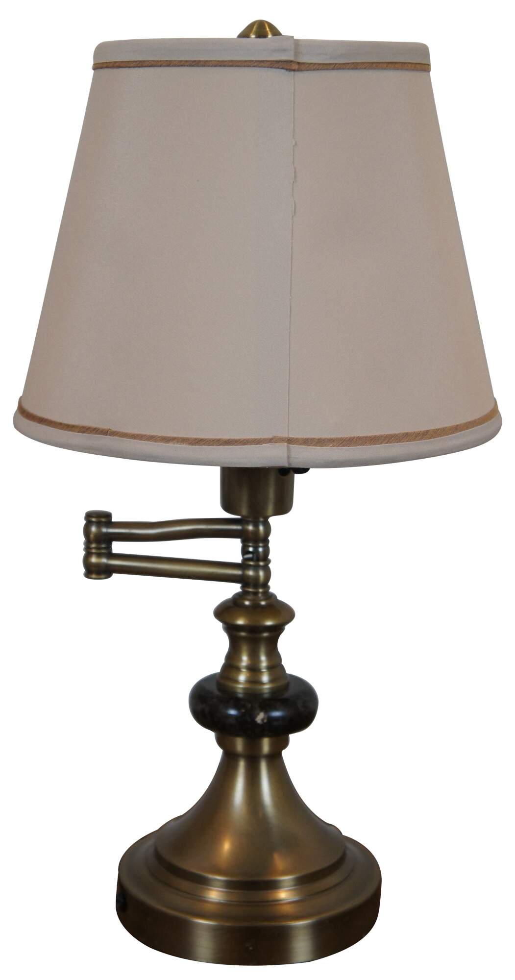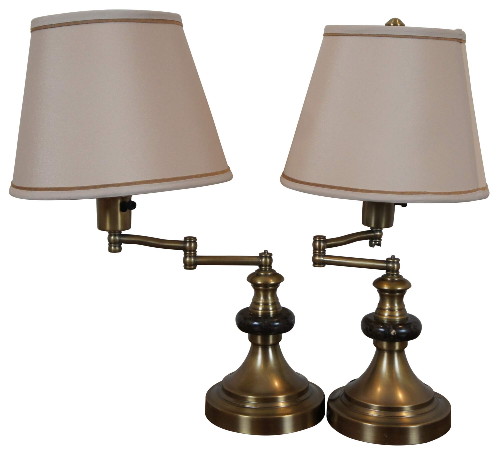 Pair of vintage brass and faux marble swing arm table lamp with off white shades, imported for Fred Meyer.