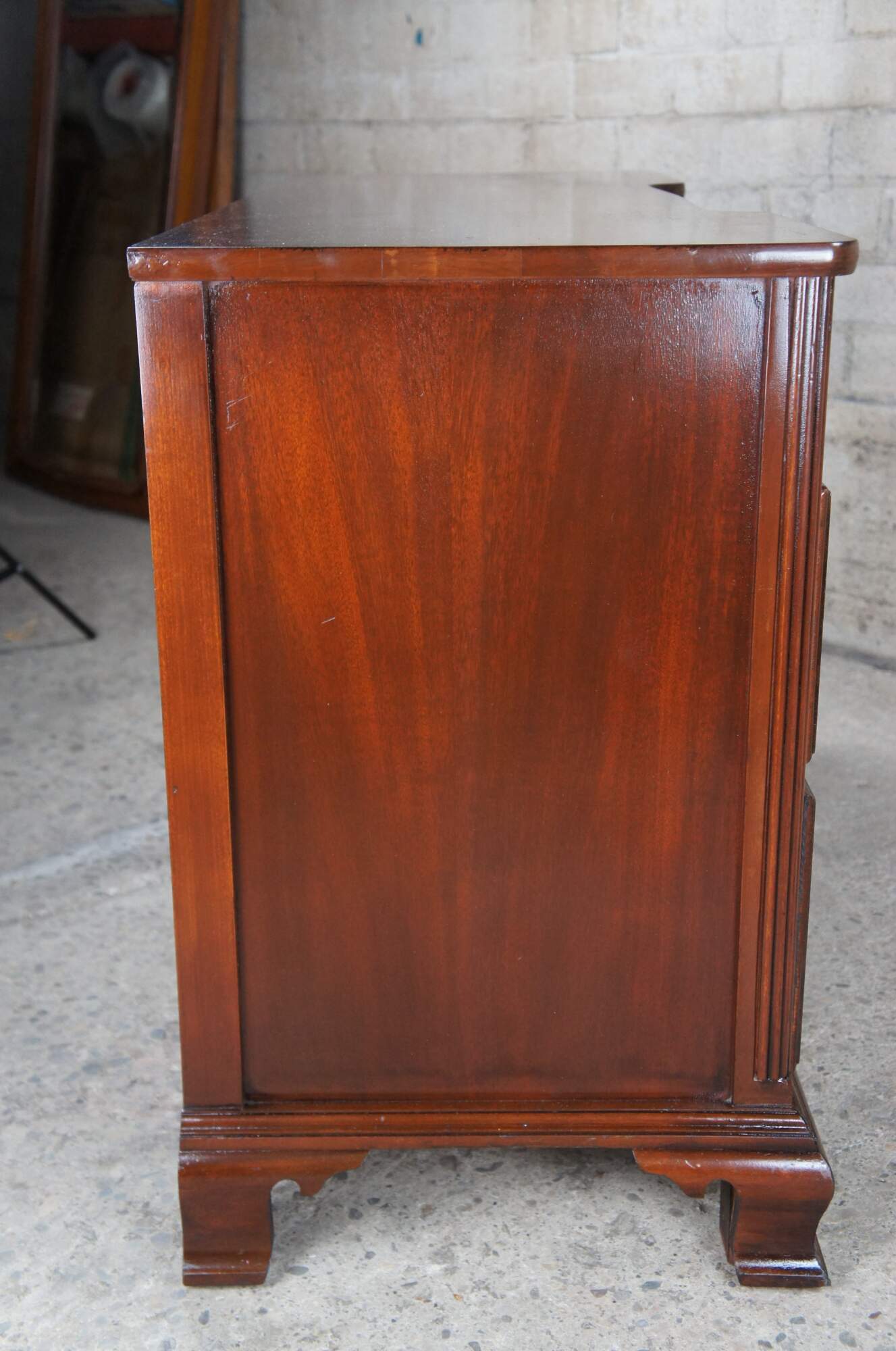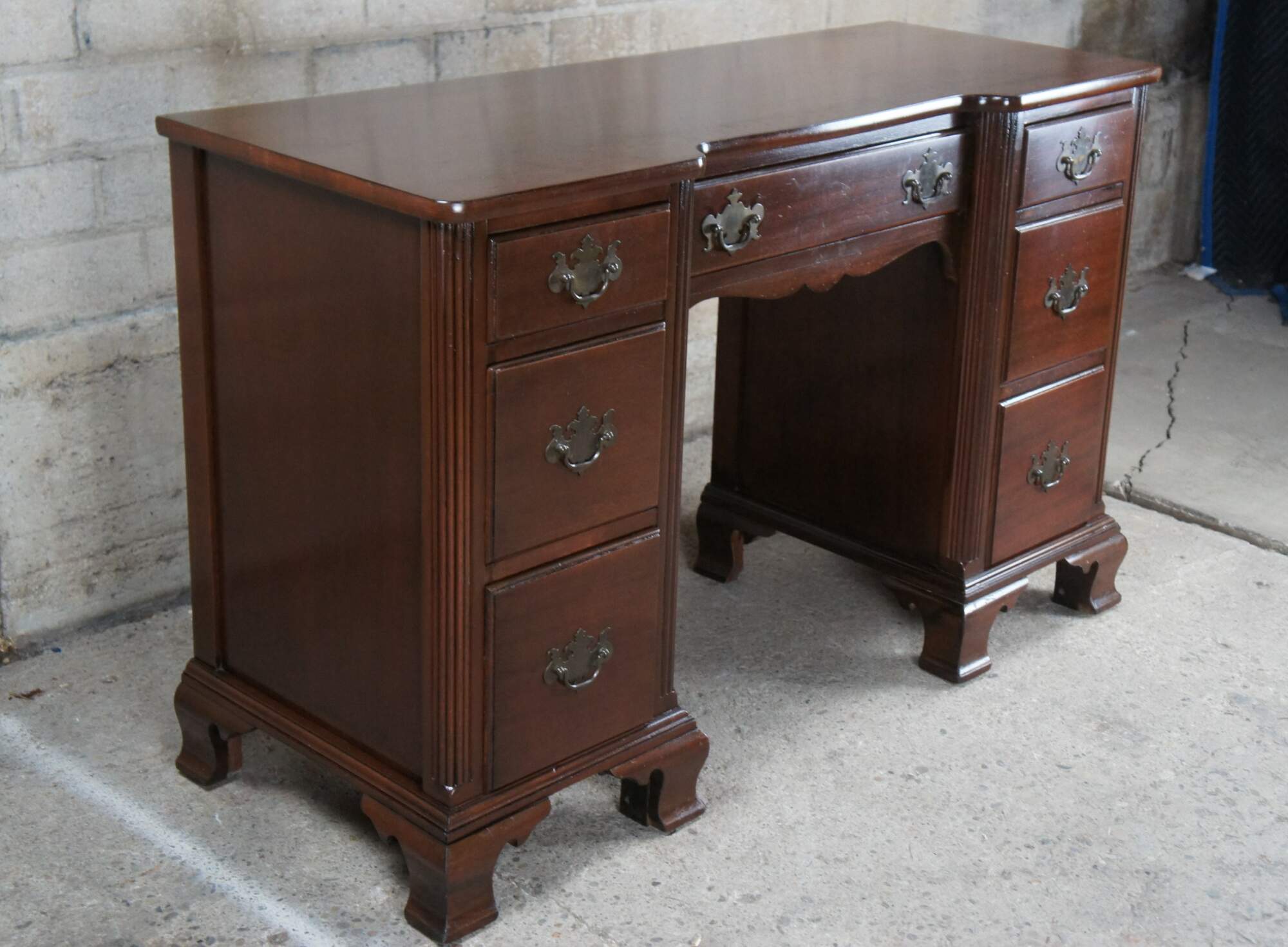 Circa 1940s mahogany knee hole writing or vanity desk featuring seven drawers with colonial brass bat wing hardware and matching serpentine mirror with open pediment and pineapple finial.