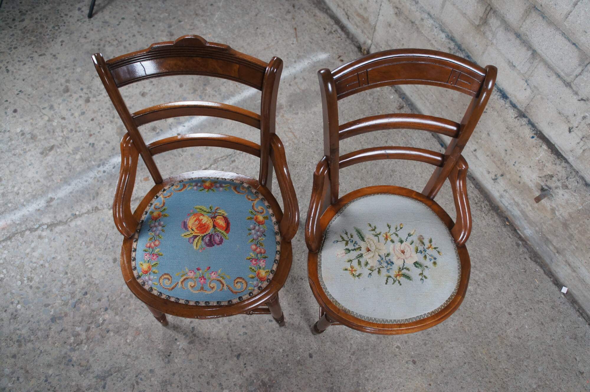 Two antique Victorian Eastlake parlor accent chairs. Made of walnut featuring turned posts, needlepoint seats, one with nail head accents, burl wood panel and cane.