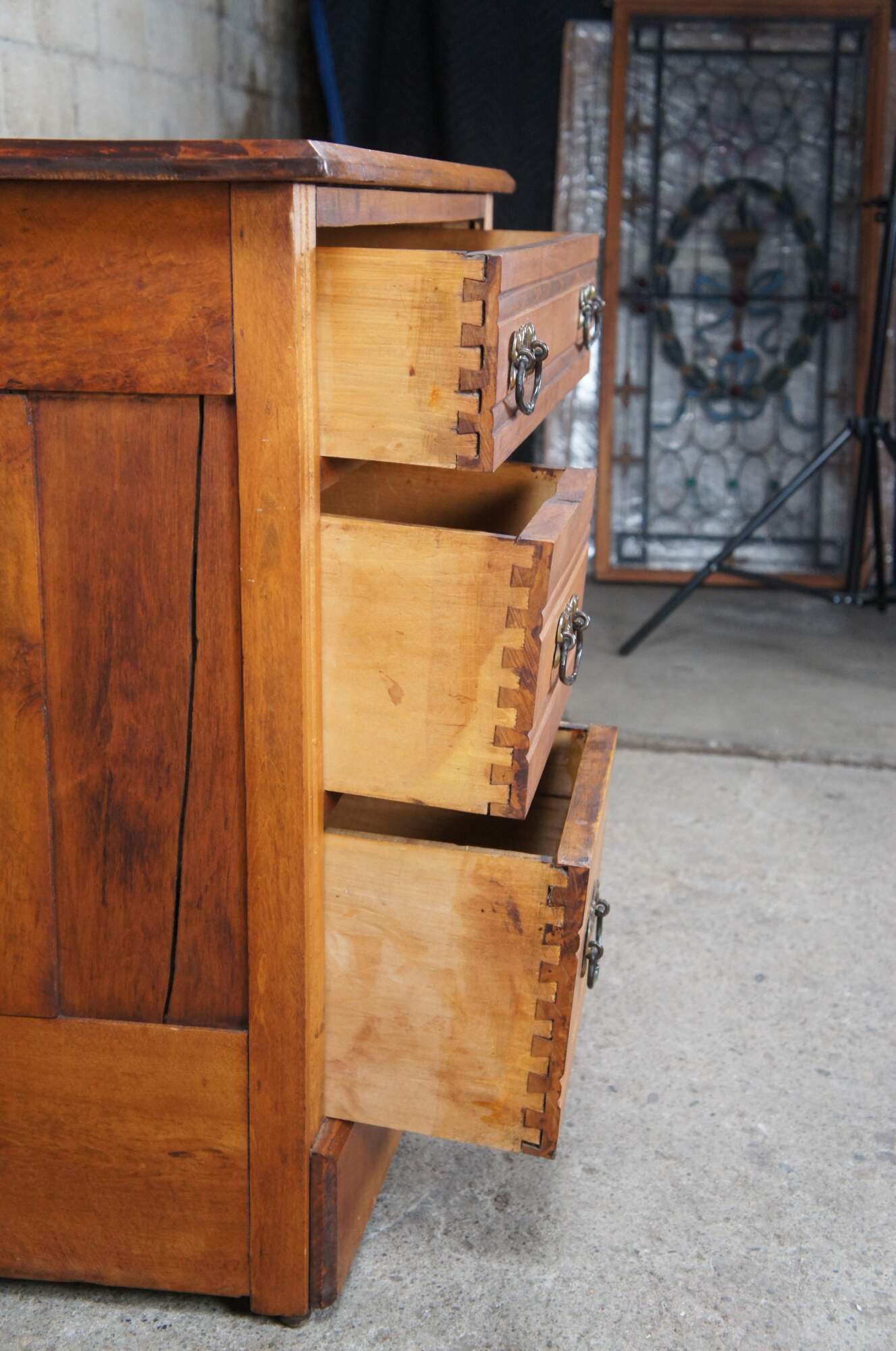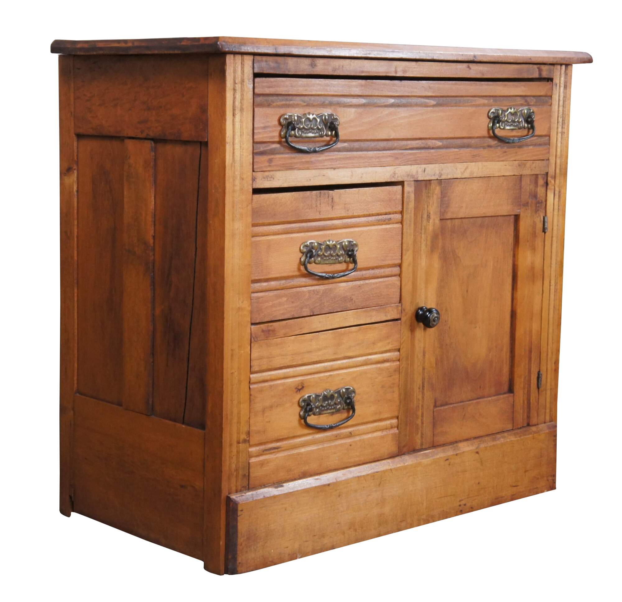 Turn of the century oak washstand featuring three drawers with side cabinet and brass hardware.