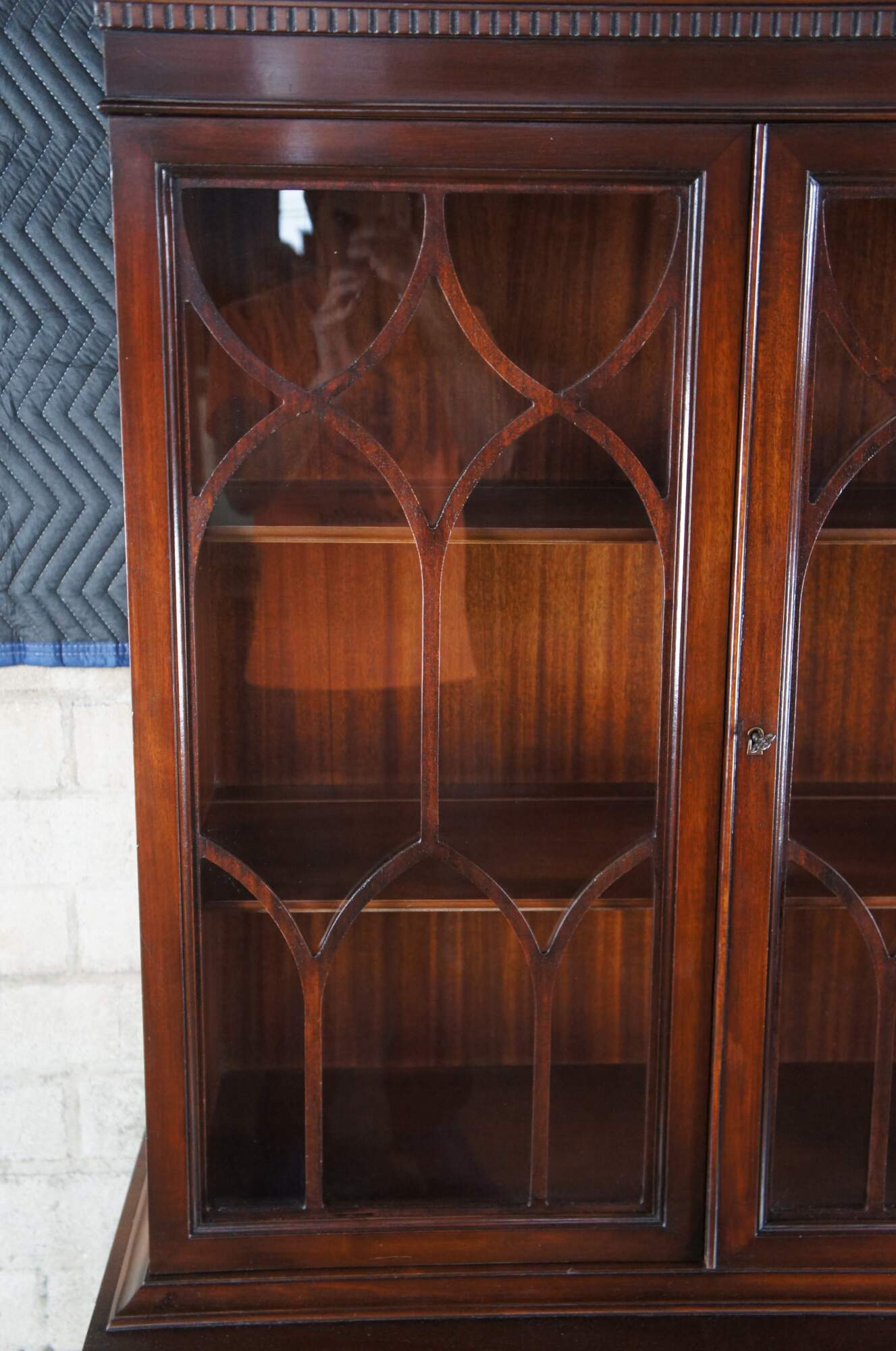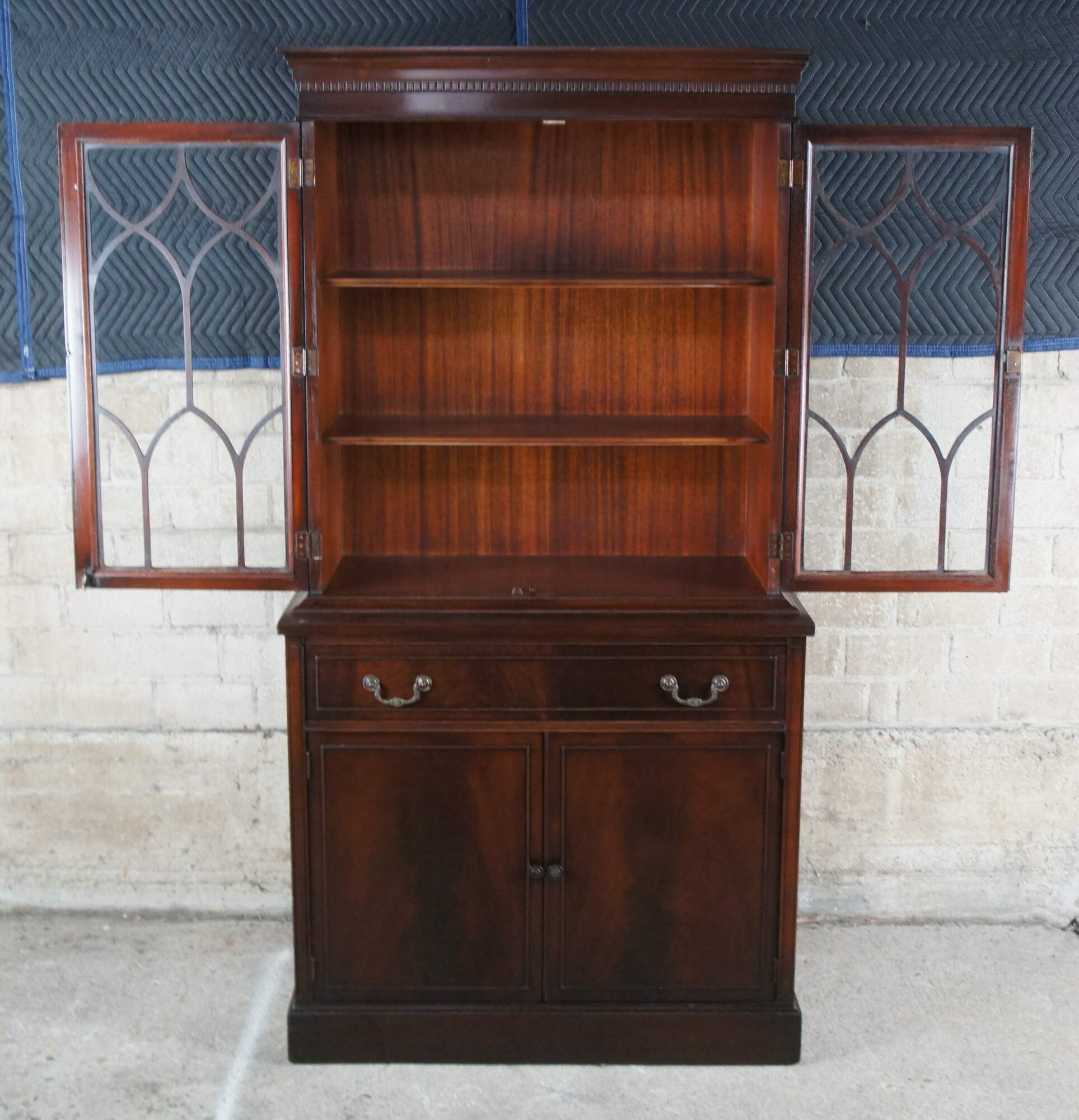 A beautiful Georgian style china hutch or bookcase by Huntley Furniture, circa 1930-40s. Made from mahogany with crotch or flame mahogany front. Features a glass doors along the top with interlaced fretwork that open two two interior shelves with plate grooves. Base houses a large dovetailed drawer and lower cabinet with shelf for accessory storage. Crown features dentil carved molding.