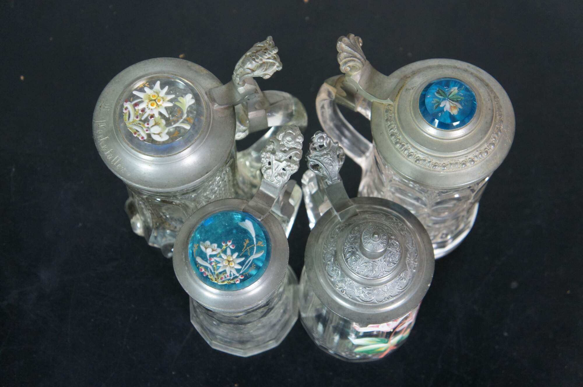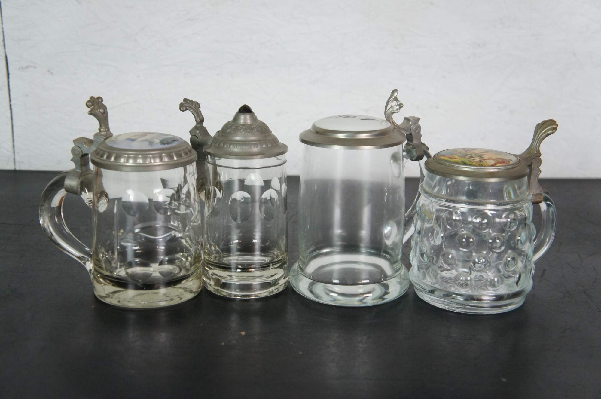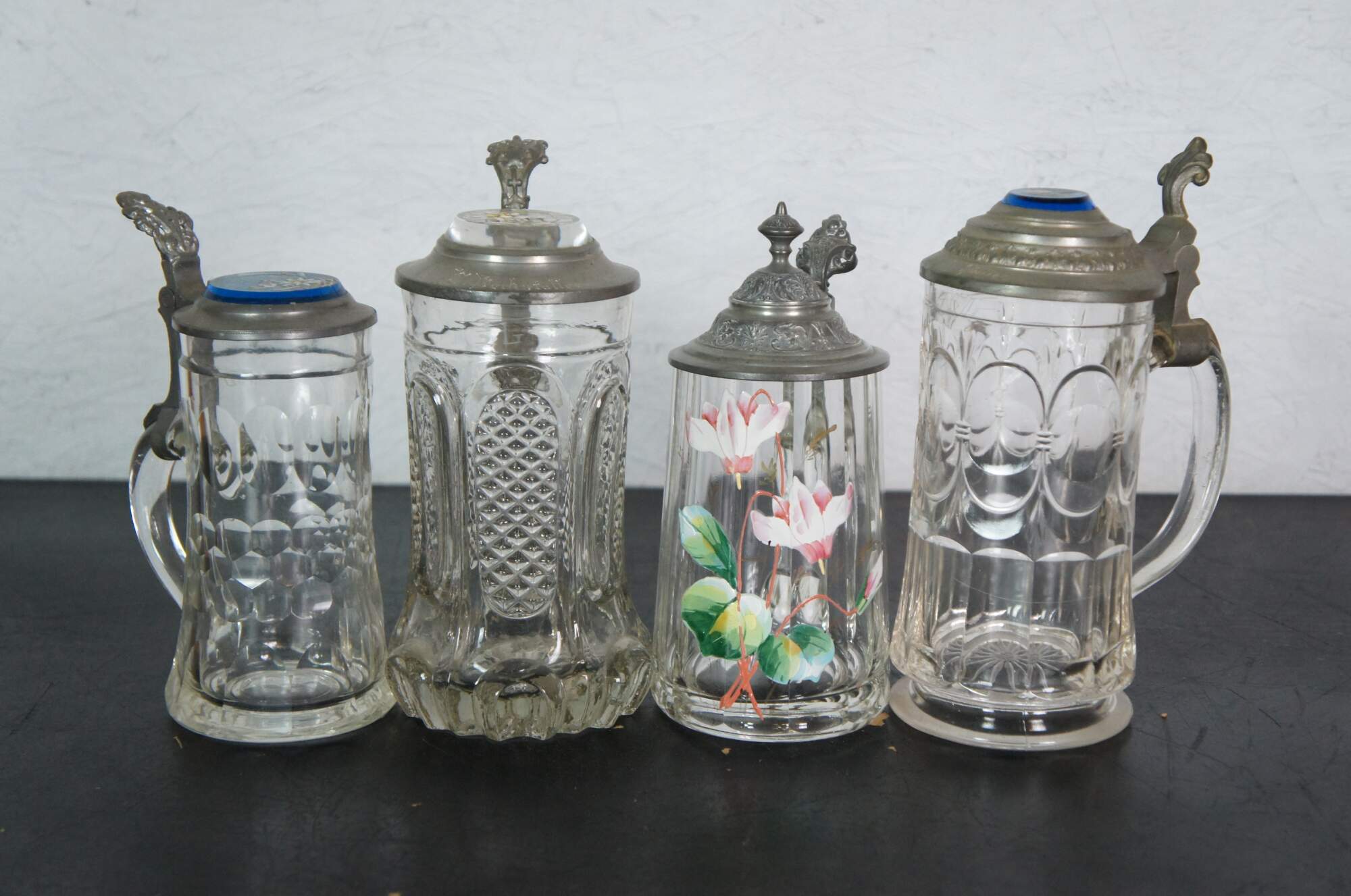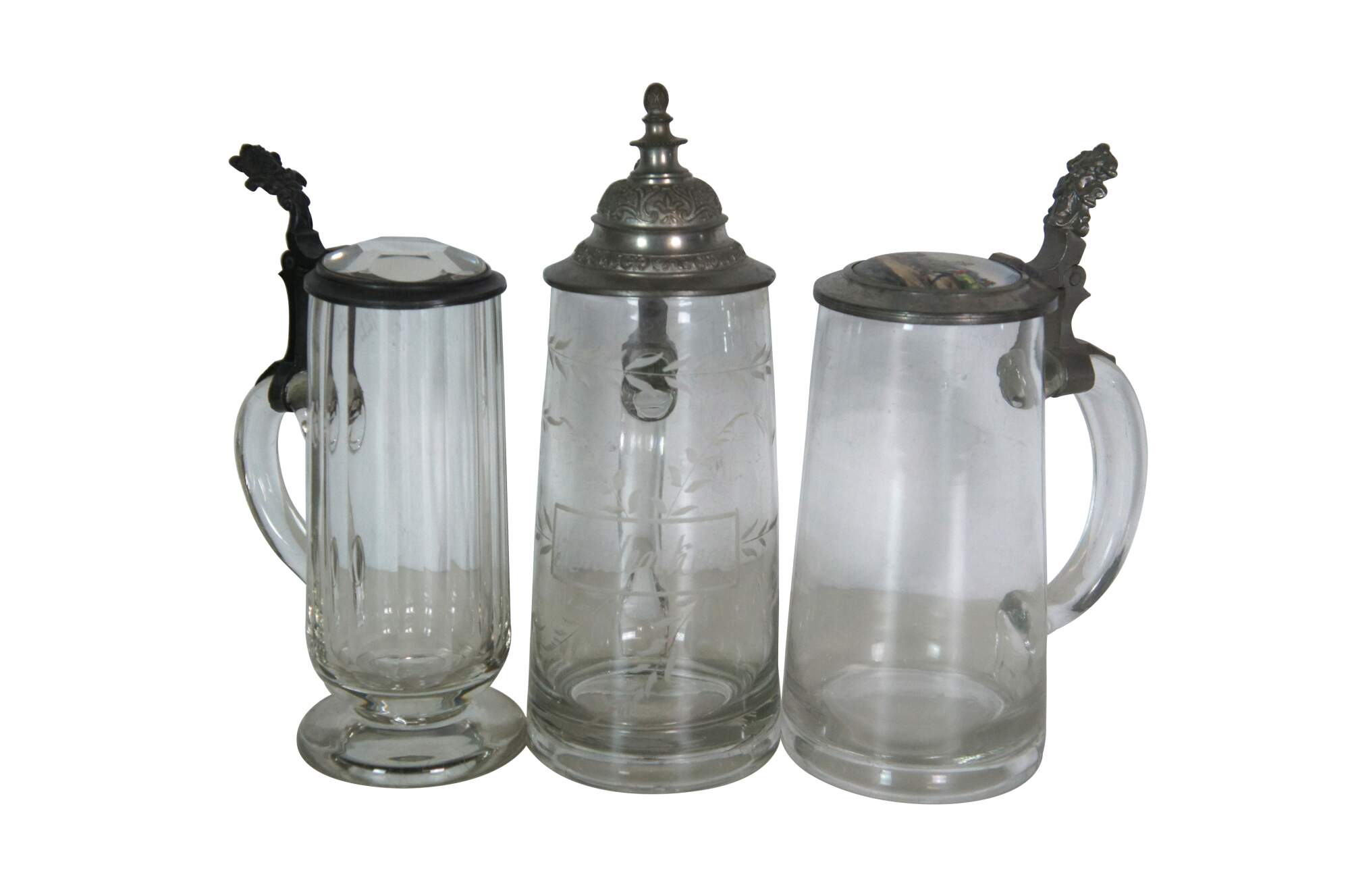 Lot of 19 rare early 20th century antique German cut / etched / faceted glass beer bar steins with metal / pewter flip top lids. Thumbprint, bubble glass, cut, and etched. Lids with painted / enameled glass or rhinestone finials - 8. Lids with painted scenes / ceramic inlays on lids - 4. Repousse floral / plain metal lids - 7. Smallest mug is a pink bohemian glass.