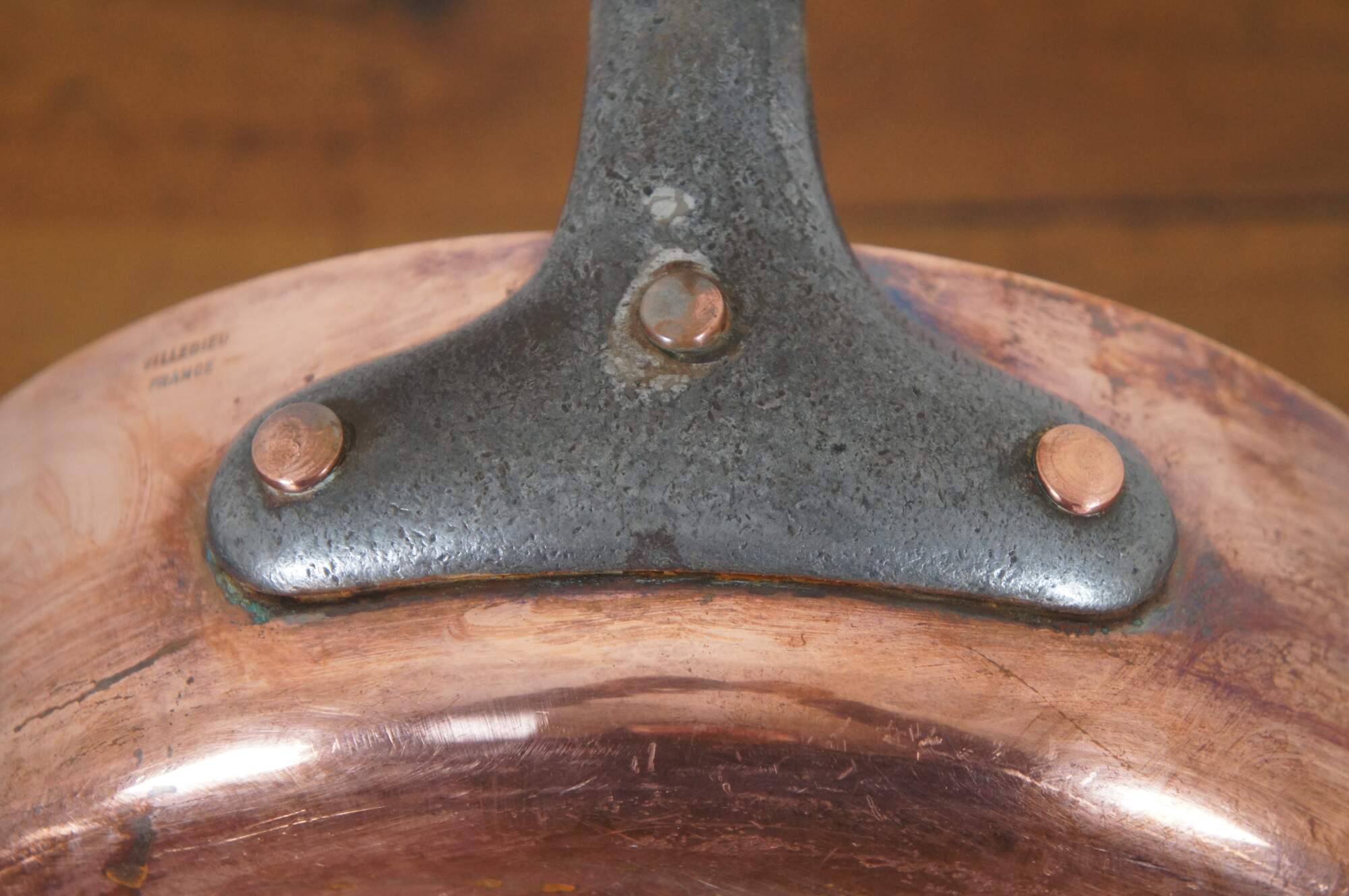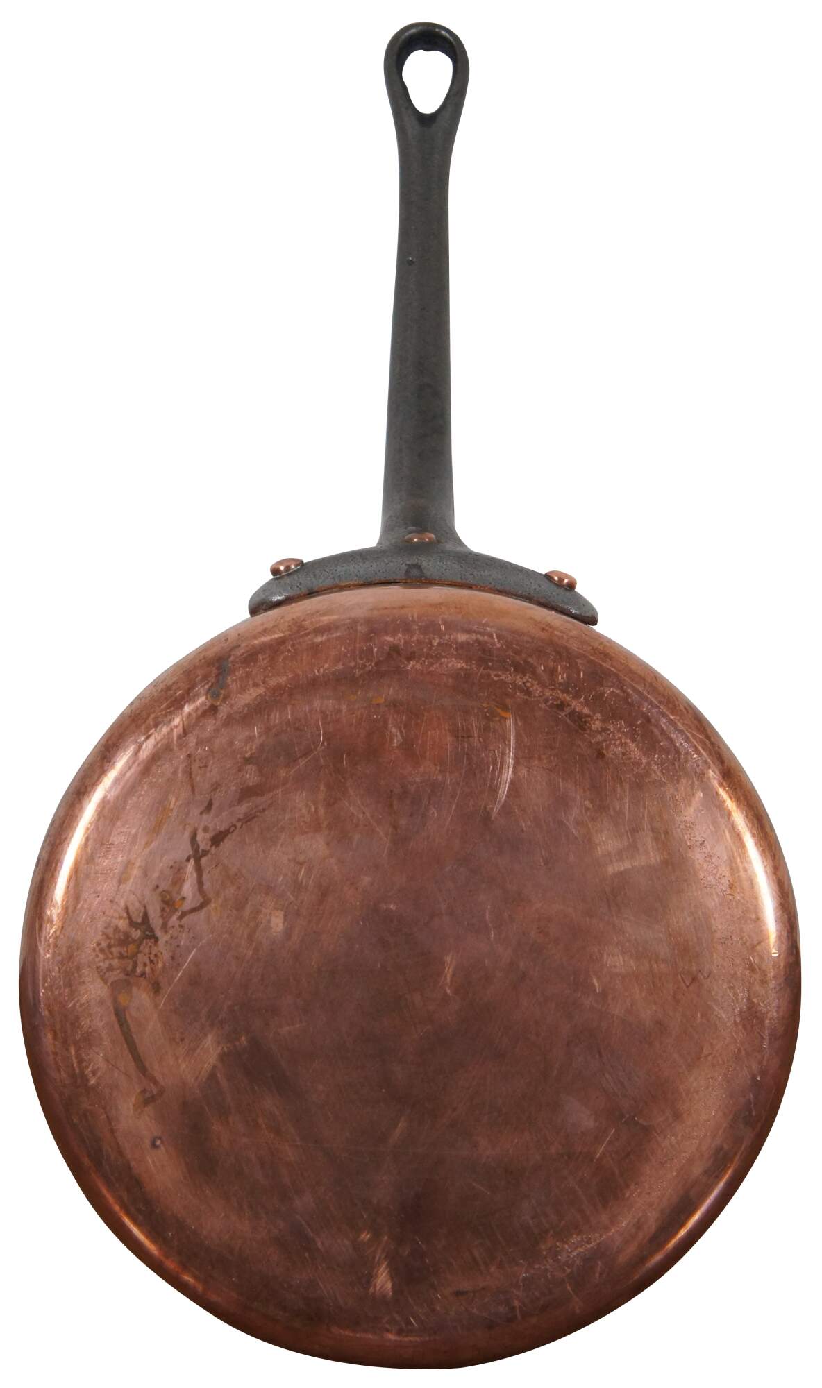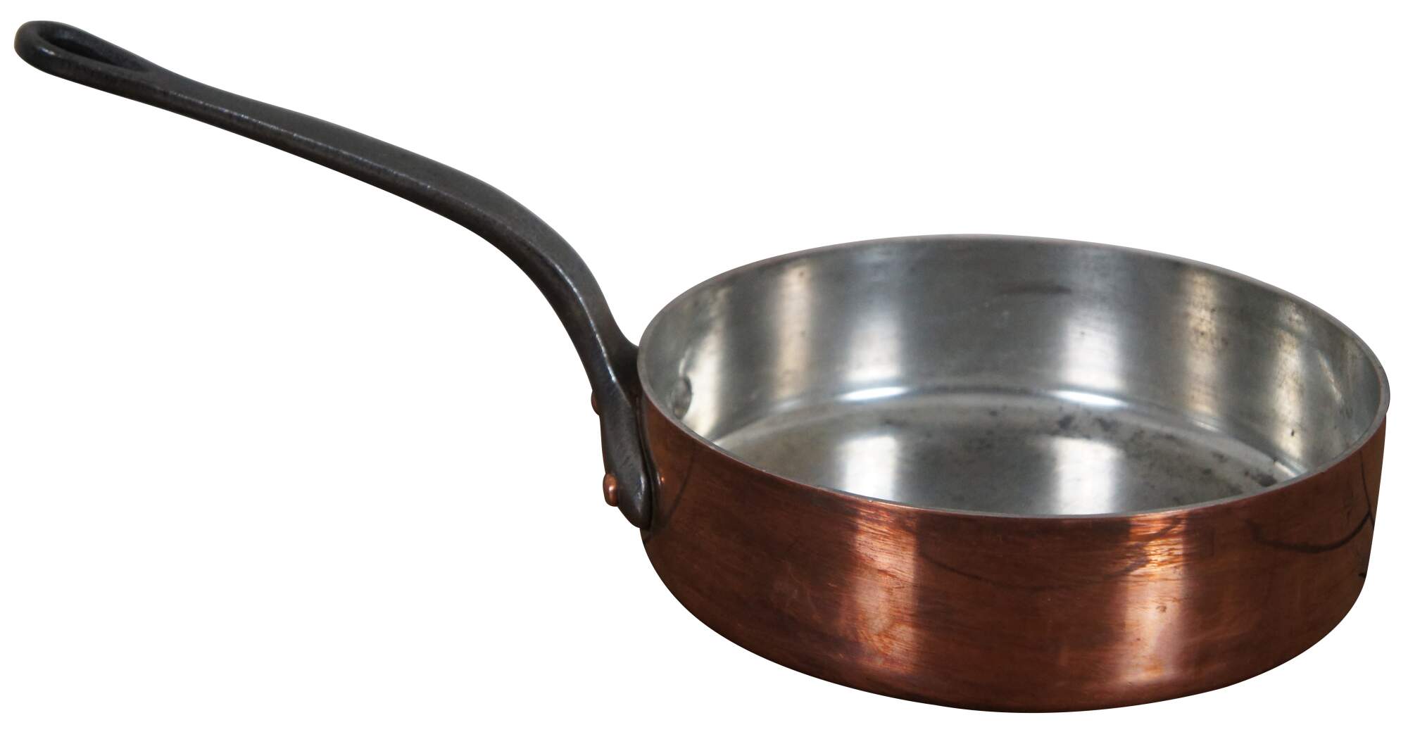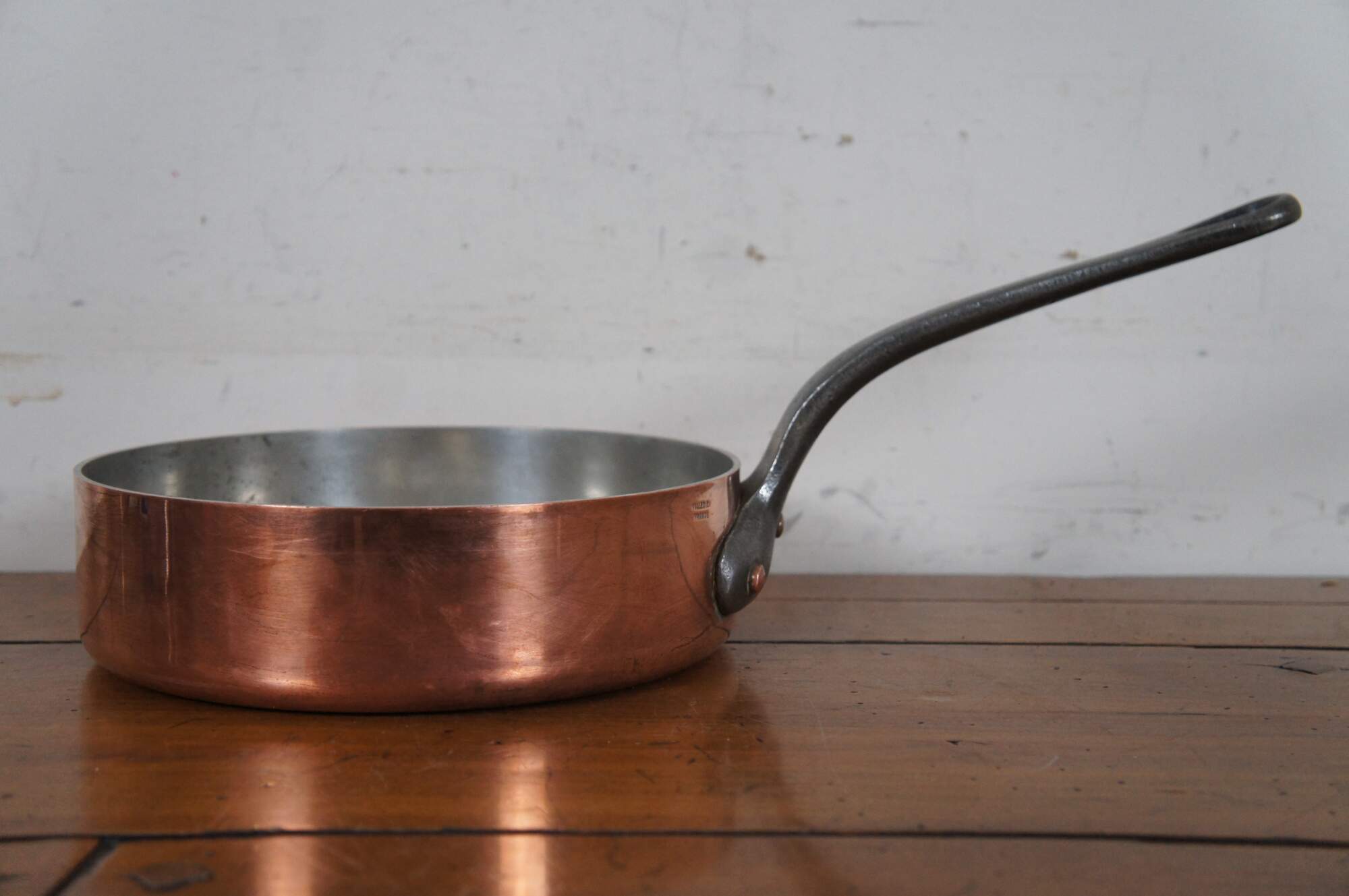 Vintage French copper clad saute pan with heavy iron handle. Made in Villedieu France.
