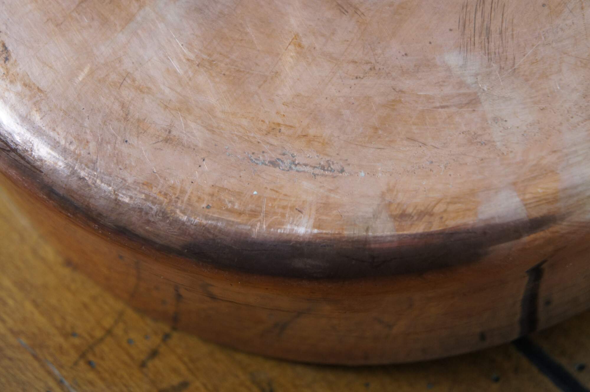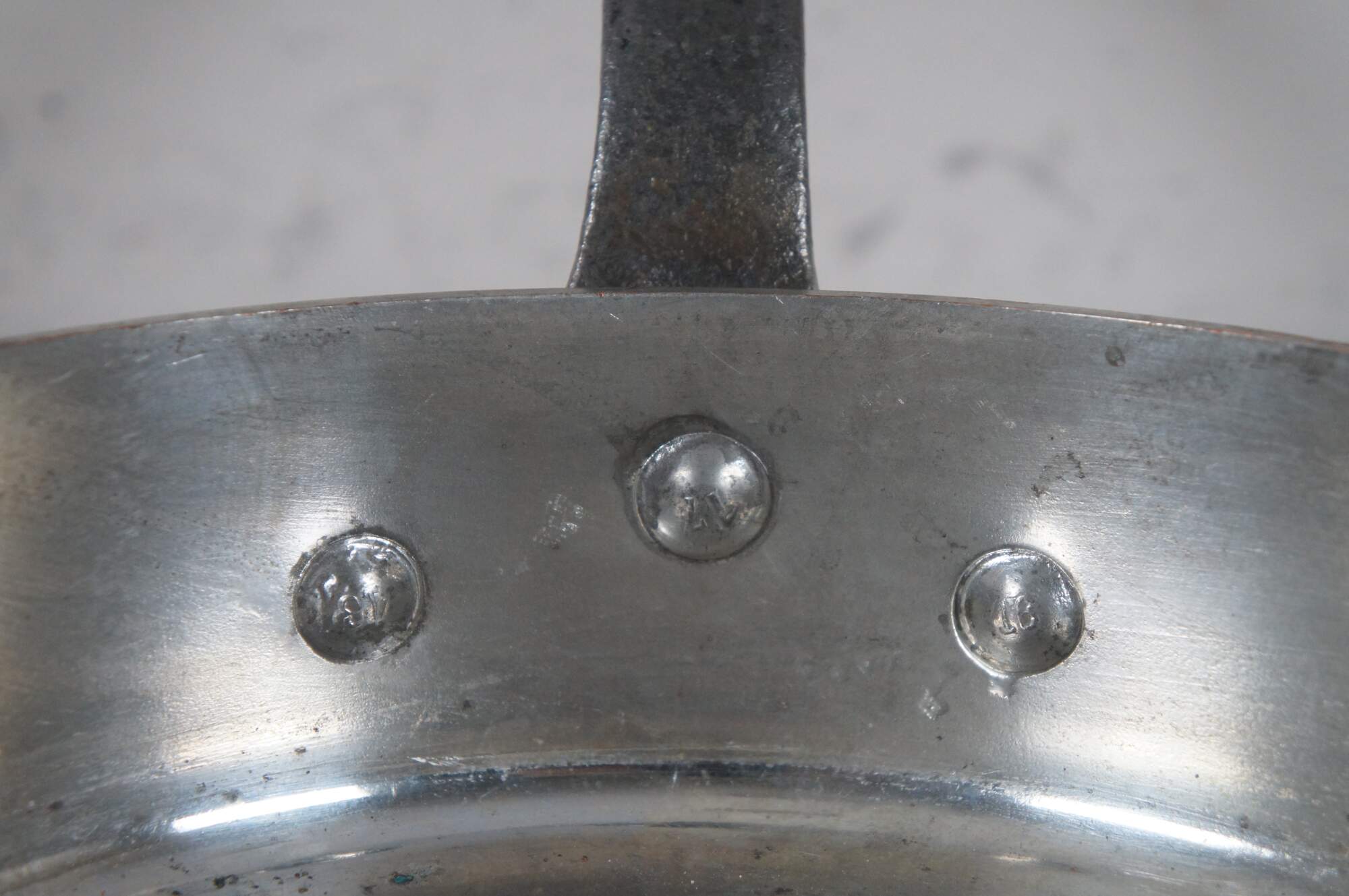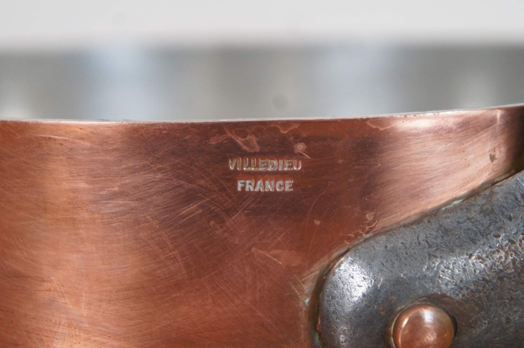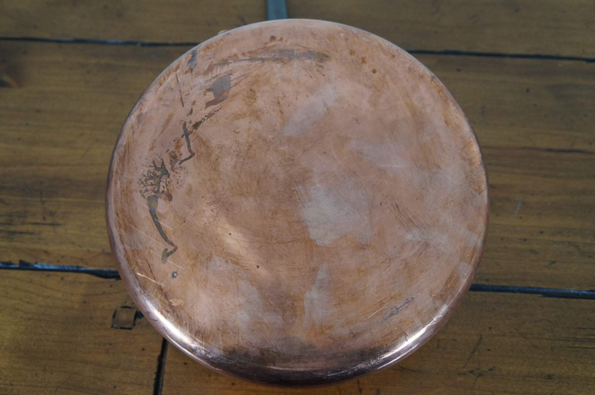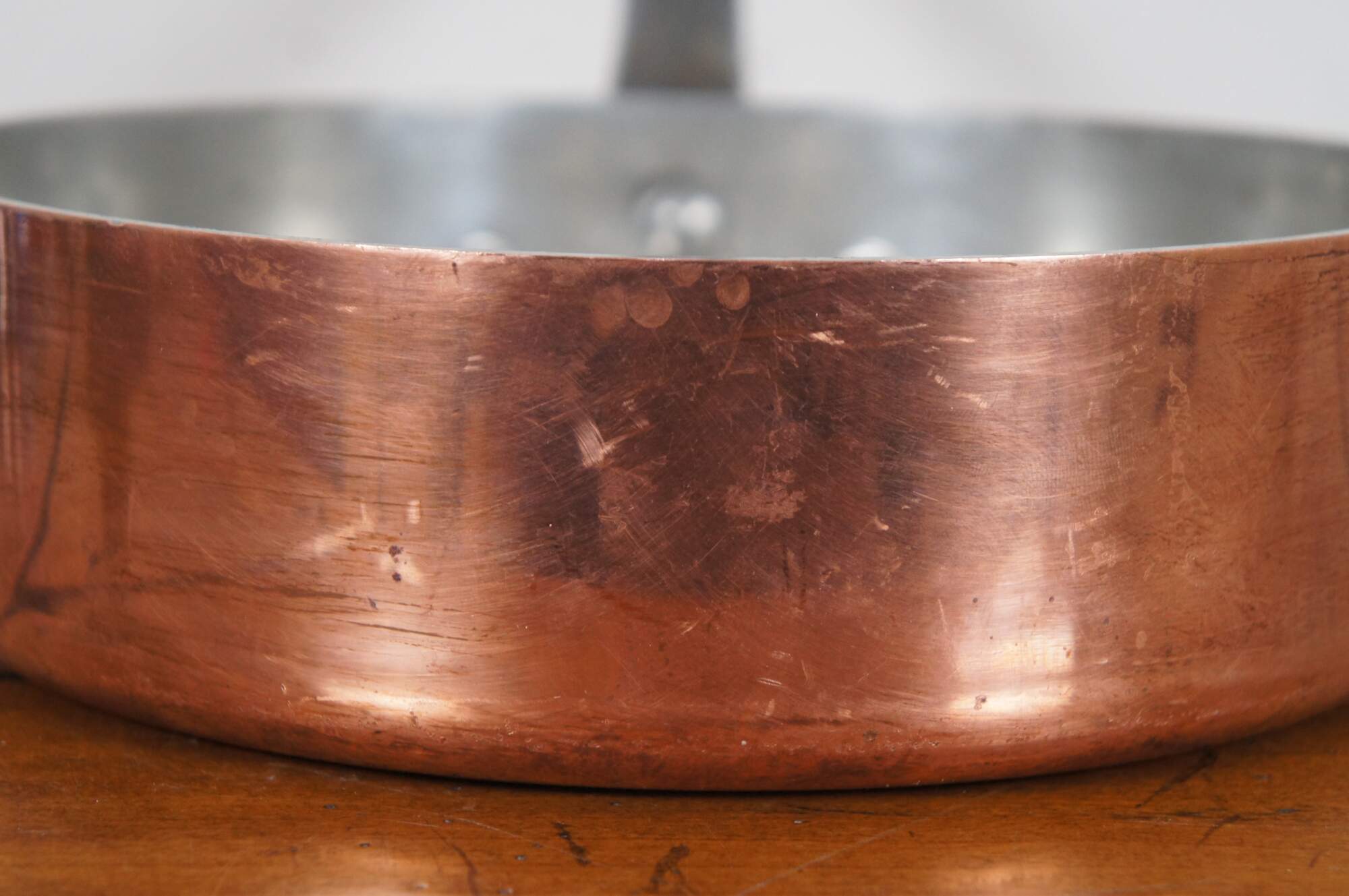 Vintage French copper clad saute pan with heavy iron handle. Made in Villedieu France.