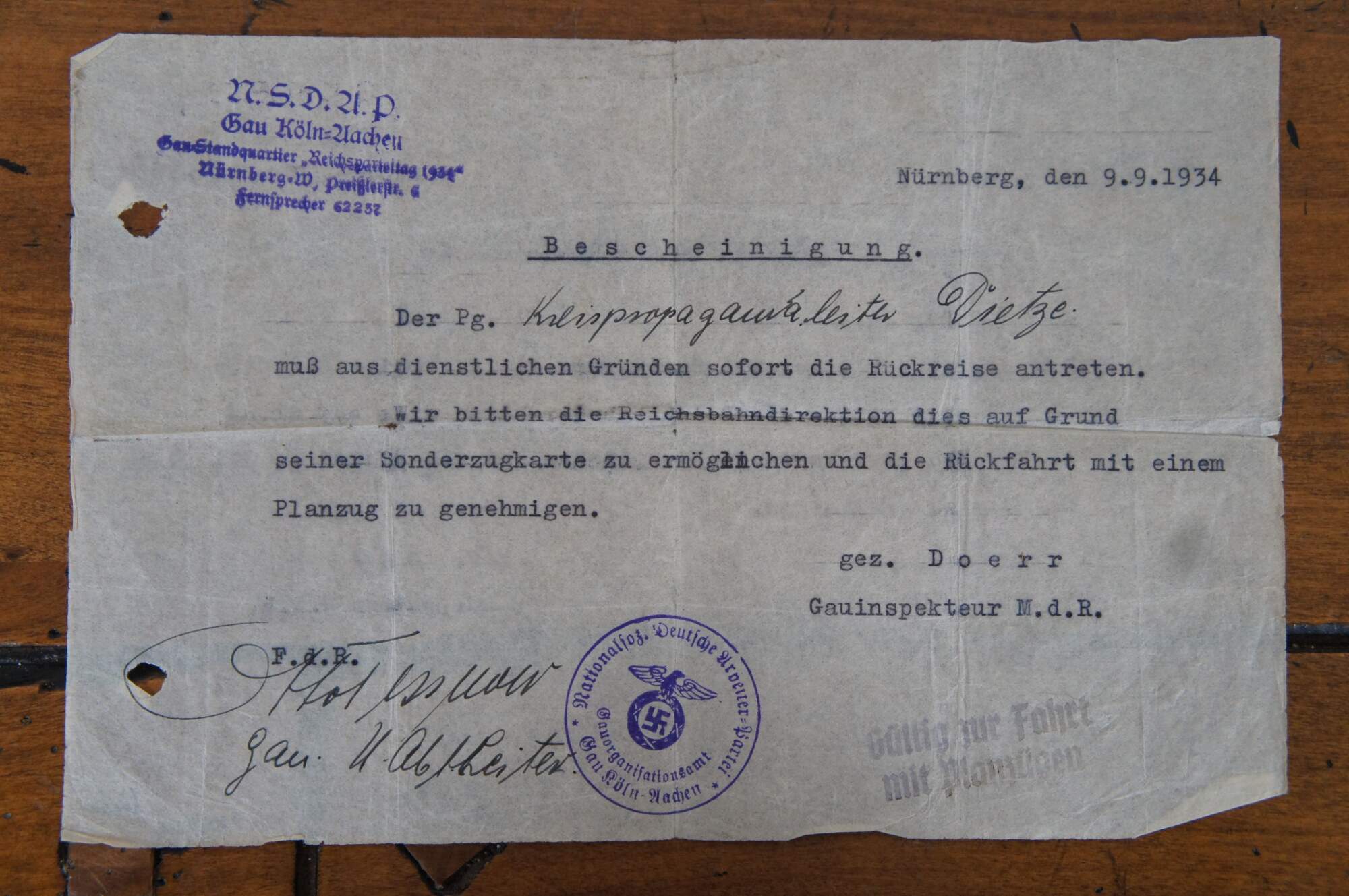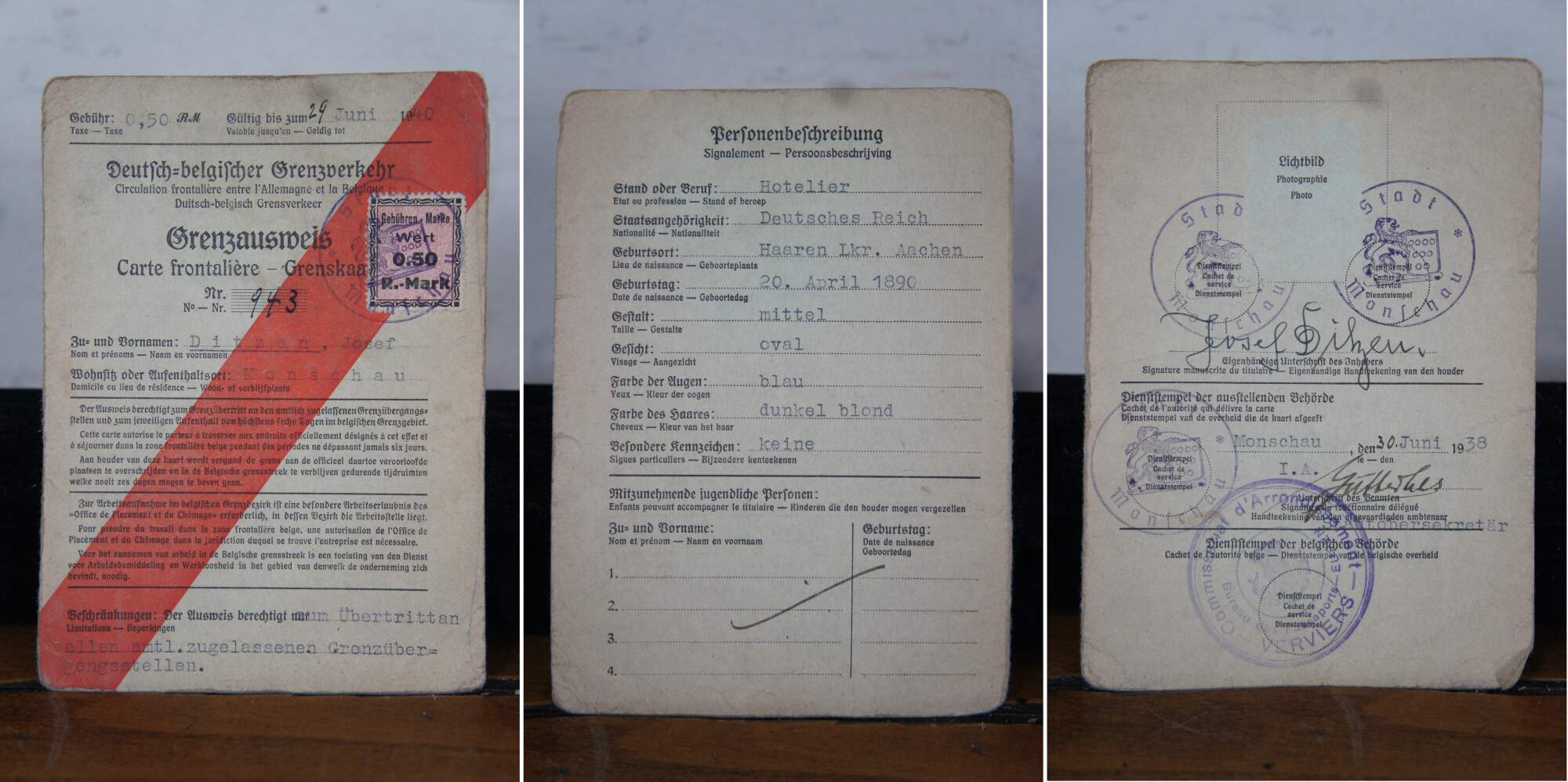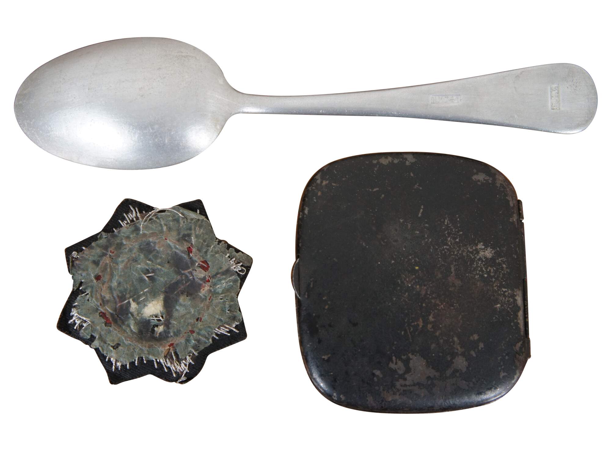 Lot of assorted items from early to mid 20th century Germany including a metal cigarette case engraved to commemorate World War I, 1933 Treaty of Versailles pamphlet / booklet, a certification paper for travel dated 1934, 2 pages of a passport, specifically mentioning travel between Germany and Belgium dated 1940, aluminum Luftwaffe table spoon marked H.M.Z. 41 and Fl.U.V. indicating Flieger Unterkunft Verwaltung (Flight Barracks Administration), and a cloth version of the German Cross badge/medal, Gold Class, 1941.