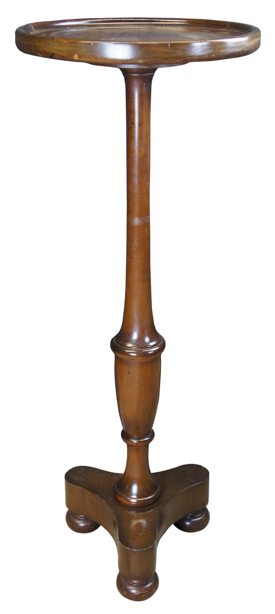 A lovely pair of Georgian style sculpture pedestals or stands, circa 1970s. Made from mahogany with a round inset top over an elongated trophy urn support leading to a tripod base with bun feet.