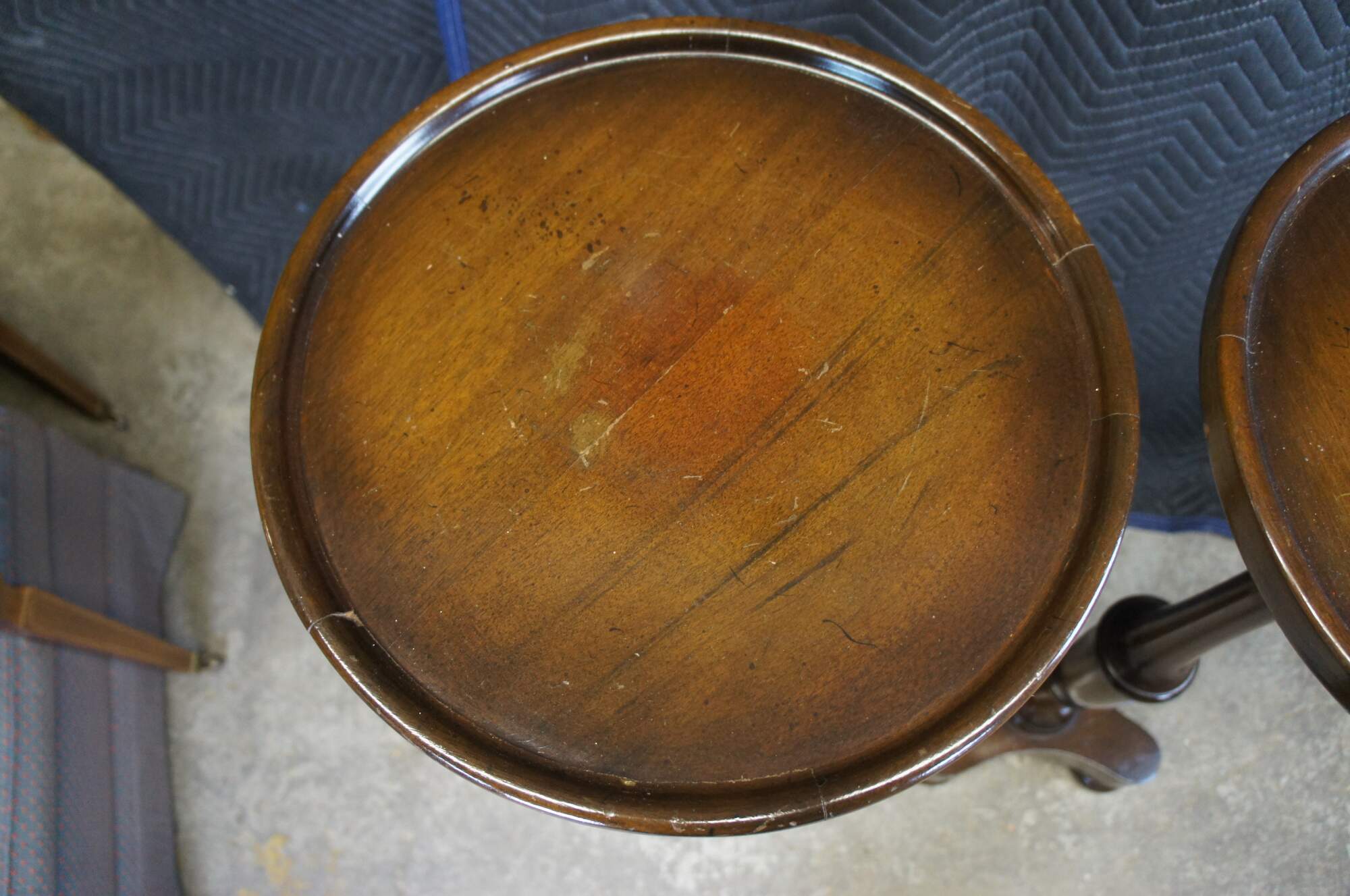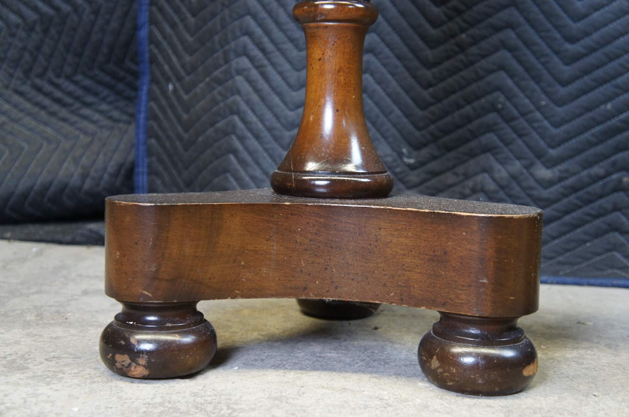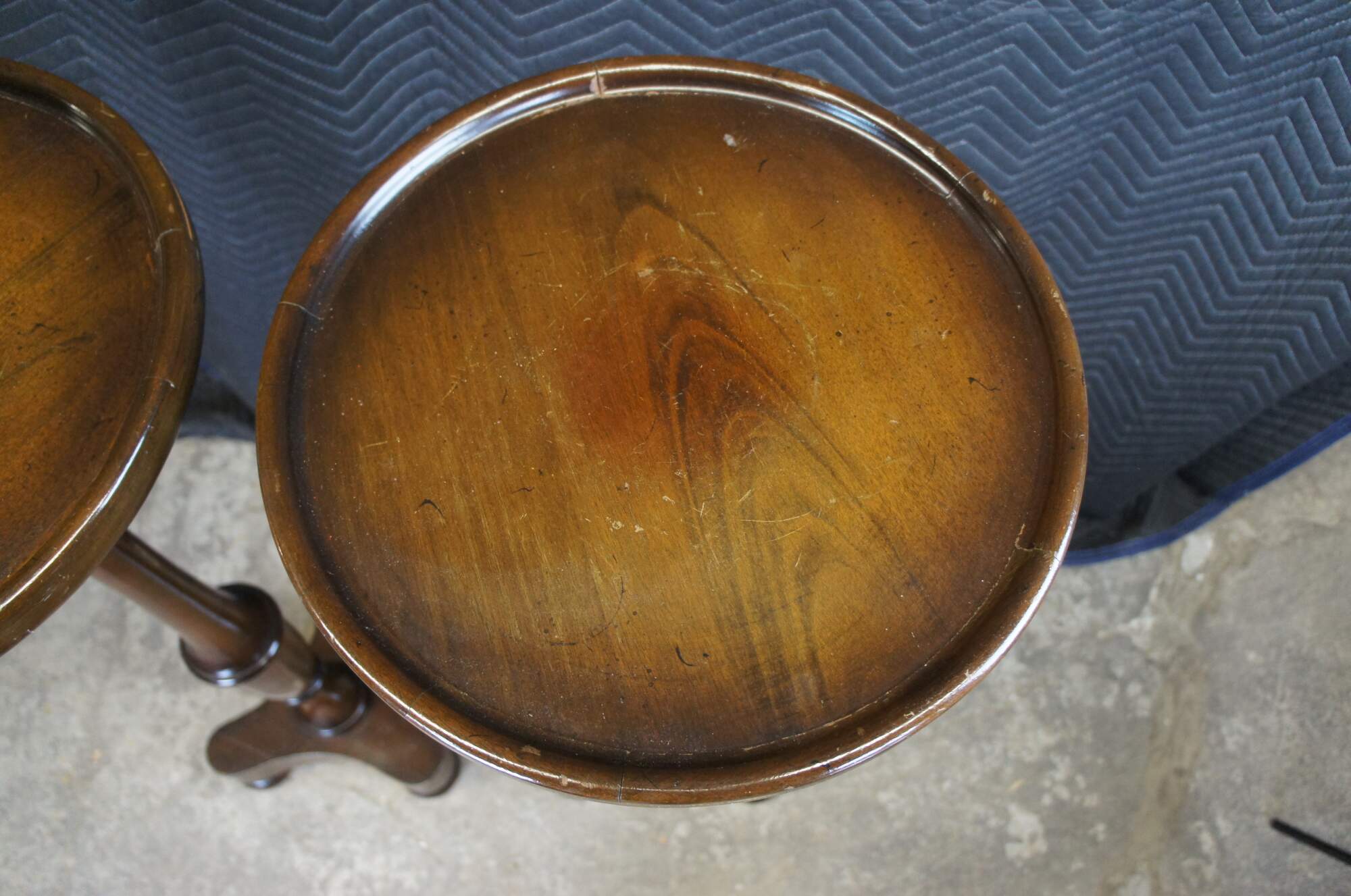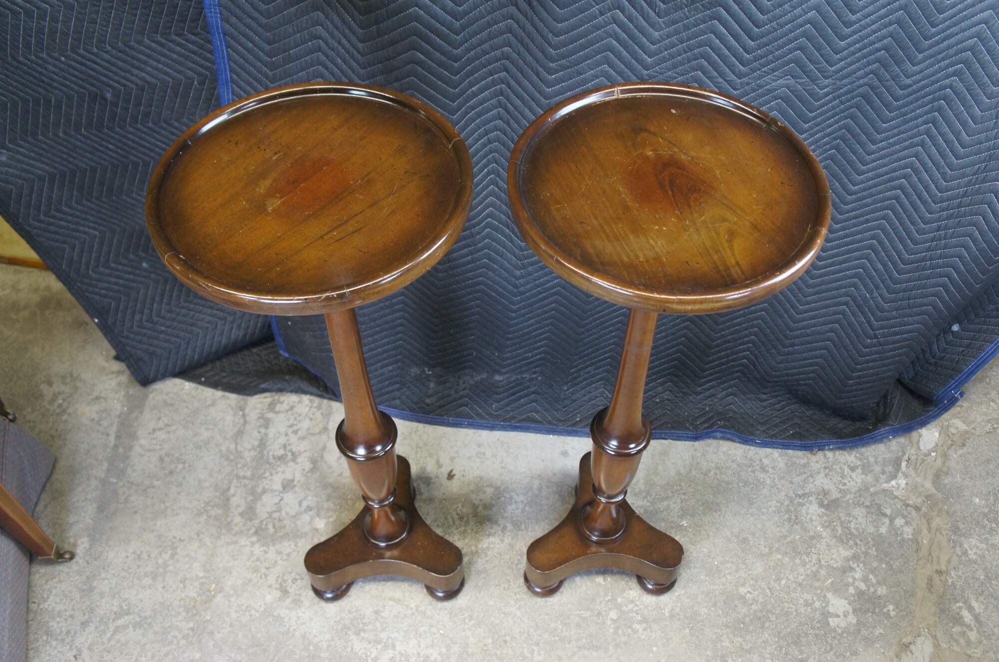 Good Vintage Condition; light rubbing/marking to top as well as bun feet. Round fading mark along center of each top from vases or sculptures.