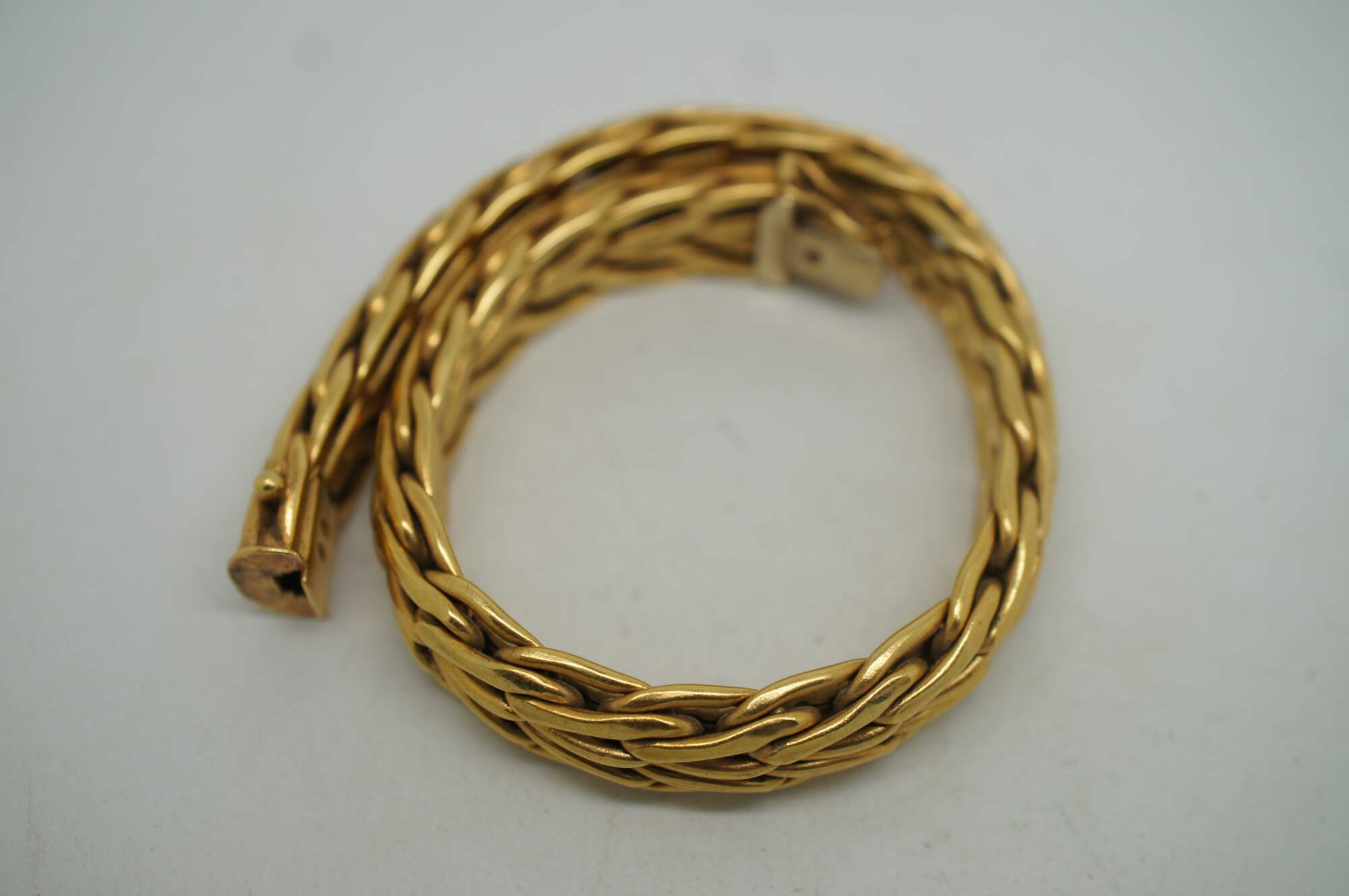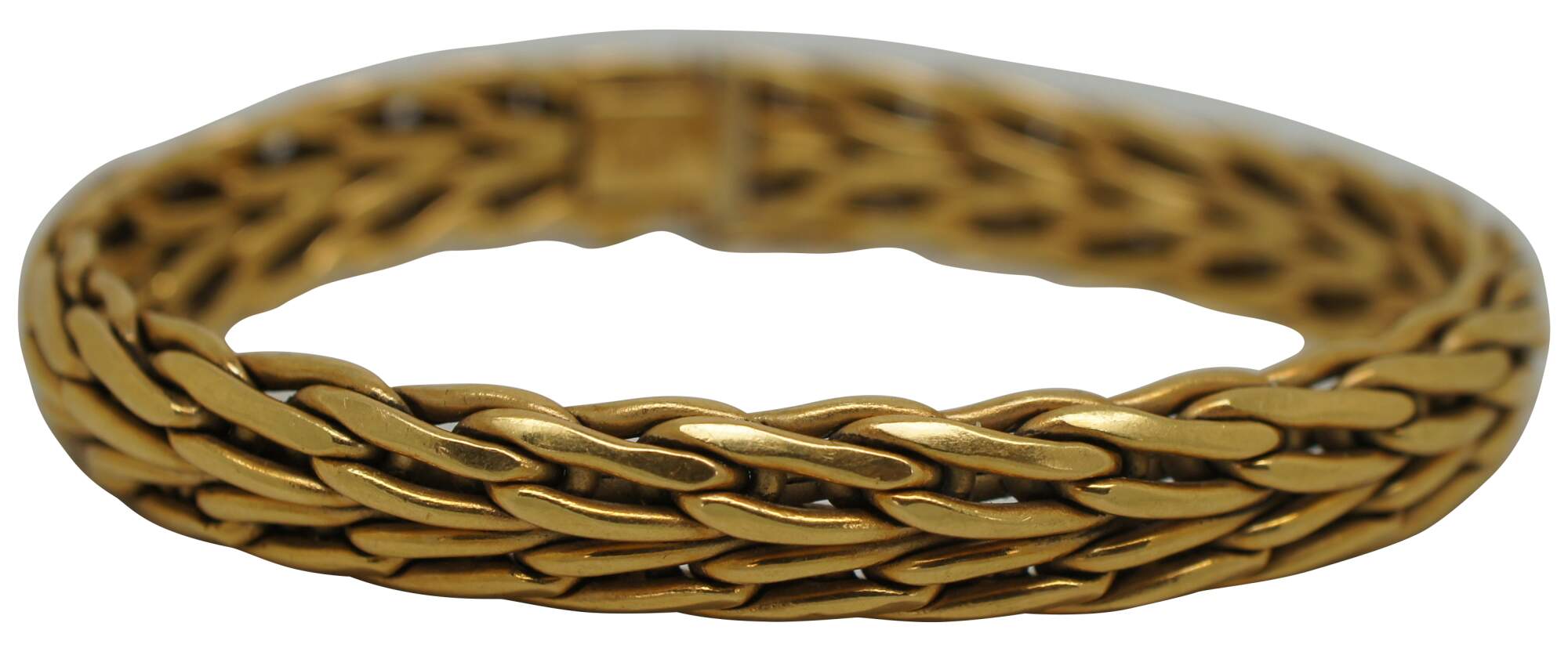 Vintage 18k / 750 yellow gold 9.5mm wide woven chain bracelet with open box clasp. Made in Arezzo, Italy. Marked 1AR which is the identification mark for UnoAErre, which was the first goldsmith company of Arezzo.