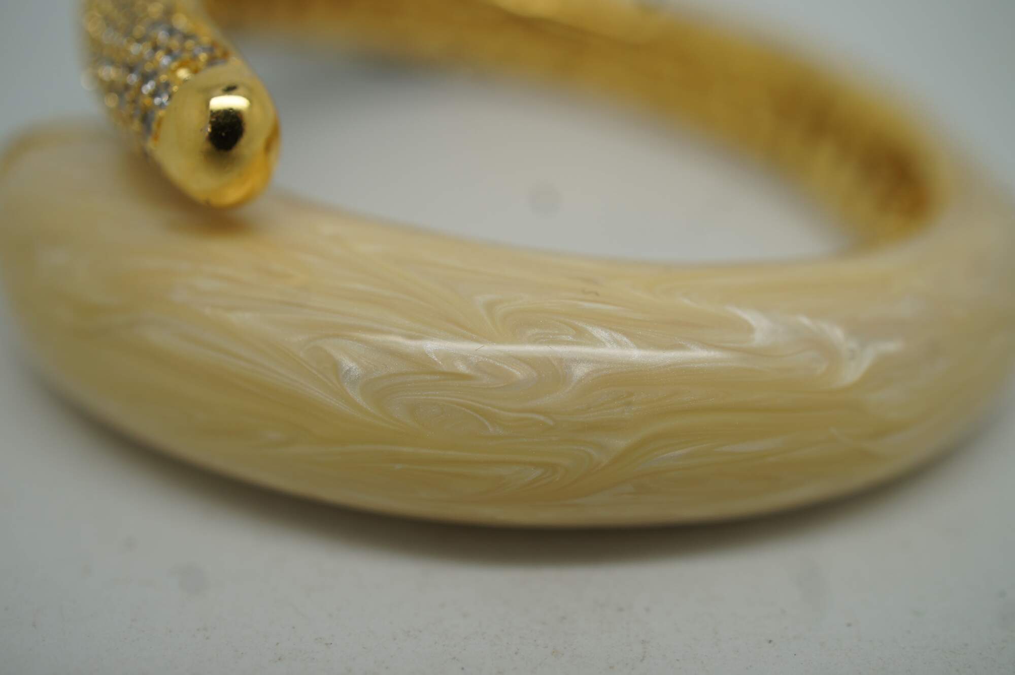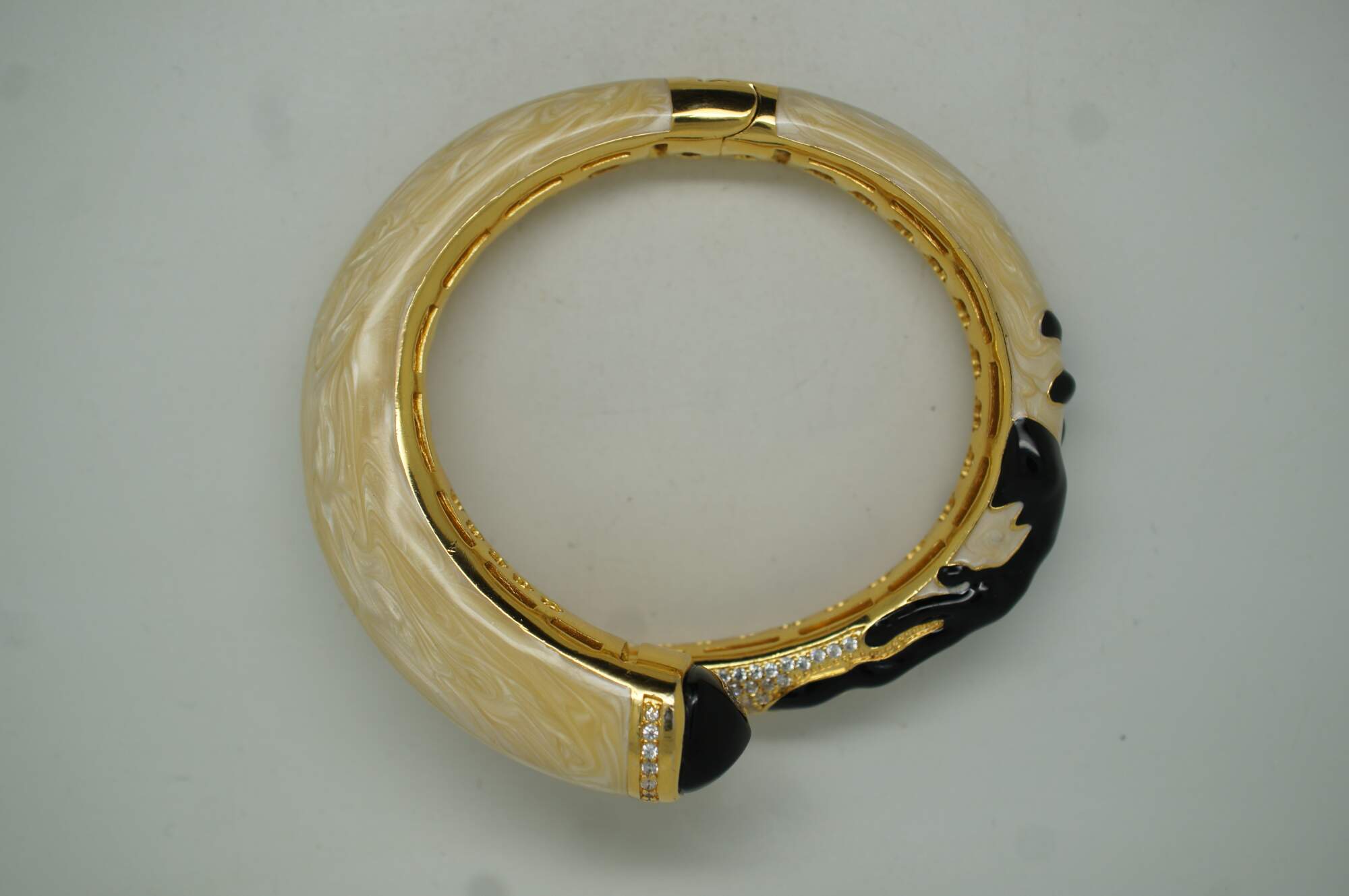 Elegant spring hinge bangle bracelet by Lauren G. Adams featuring swirling off white enamel with coral shaped black enamel accents, encrusted with white pave cubic zirconia and tipped with faceted black onyx on a brass and 18K gold plated frame.