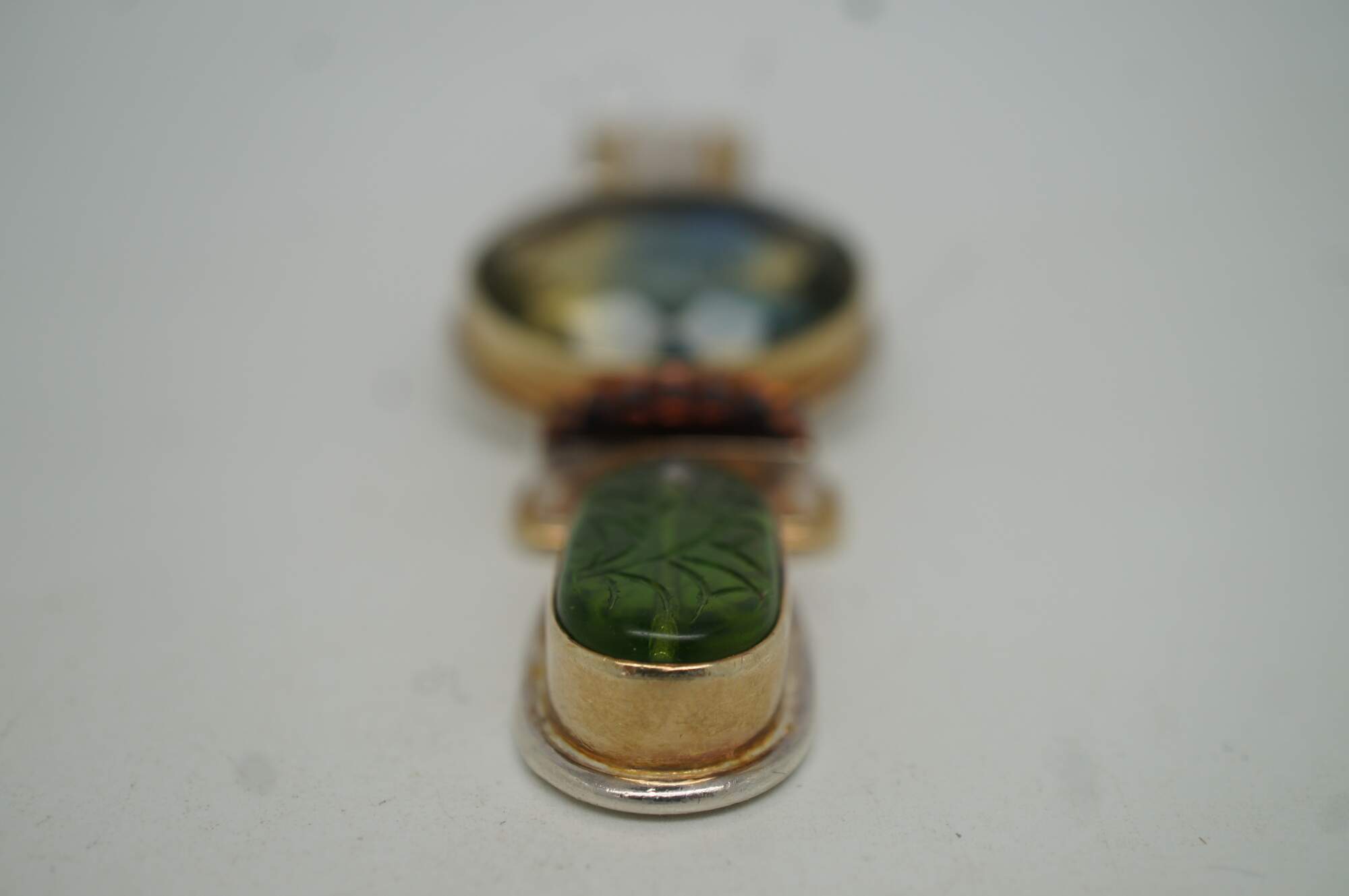 Vintage sterling silver 925 tiered or stacked pendant featuring an oval yellow bluish hue rhinestone, geometric carved amber stone, and green leaf pattern stone. Marked AM.