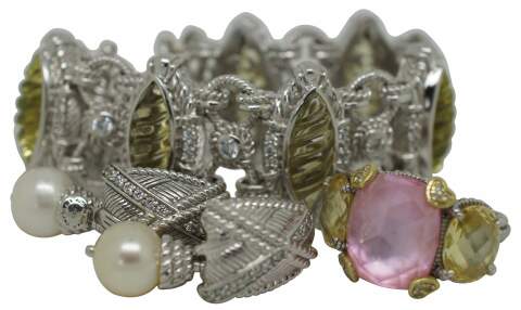 Set of four vintage pieces of jewelry by designer Judith Ripka. Set includes one sterling silver toggle clasp, chain linked bracelet featuring rope twisted accents and alternating white cubic zirconia and pale green, almond shaped, swirl carved gems; pair of clip on sterling silver earrings with crossed rope twist pattern accented with white cubic zirconia and cultured pearl dangles; and a sterling silver and 18K gold cocktail ring featuring a beaded band set with a large pink gem flanked by pale yellow gems, accented at the corners with golden hearts with white cubic zirconia.