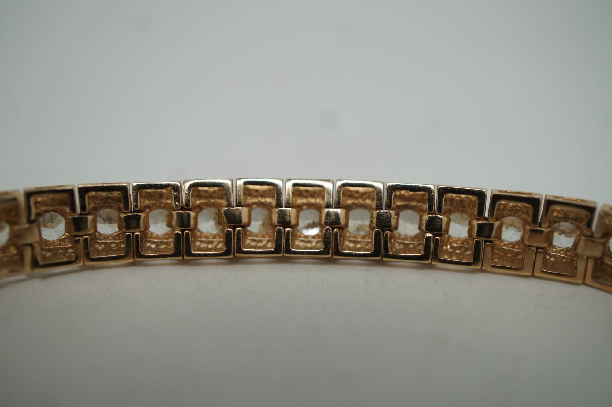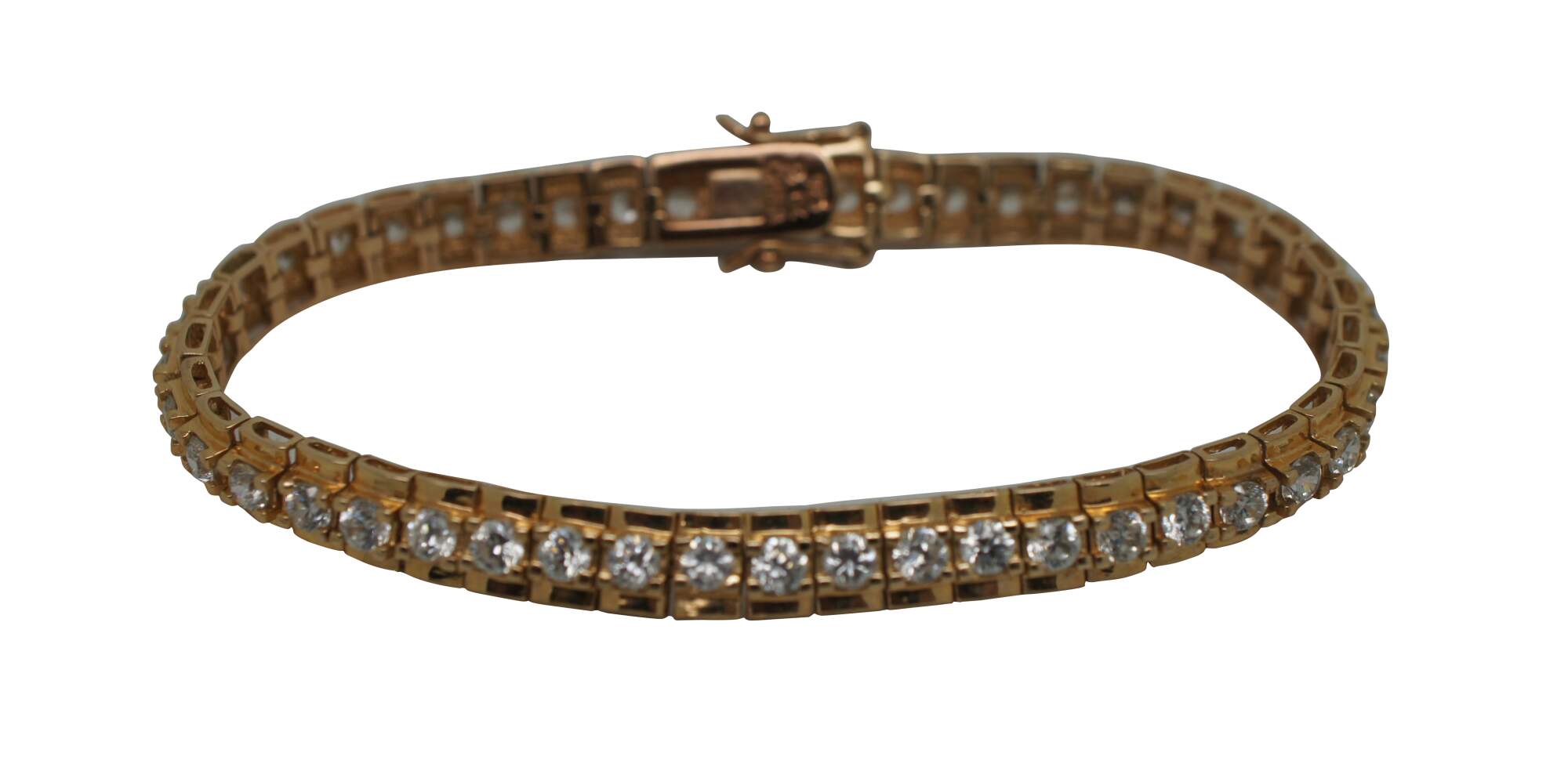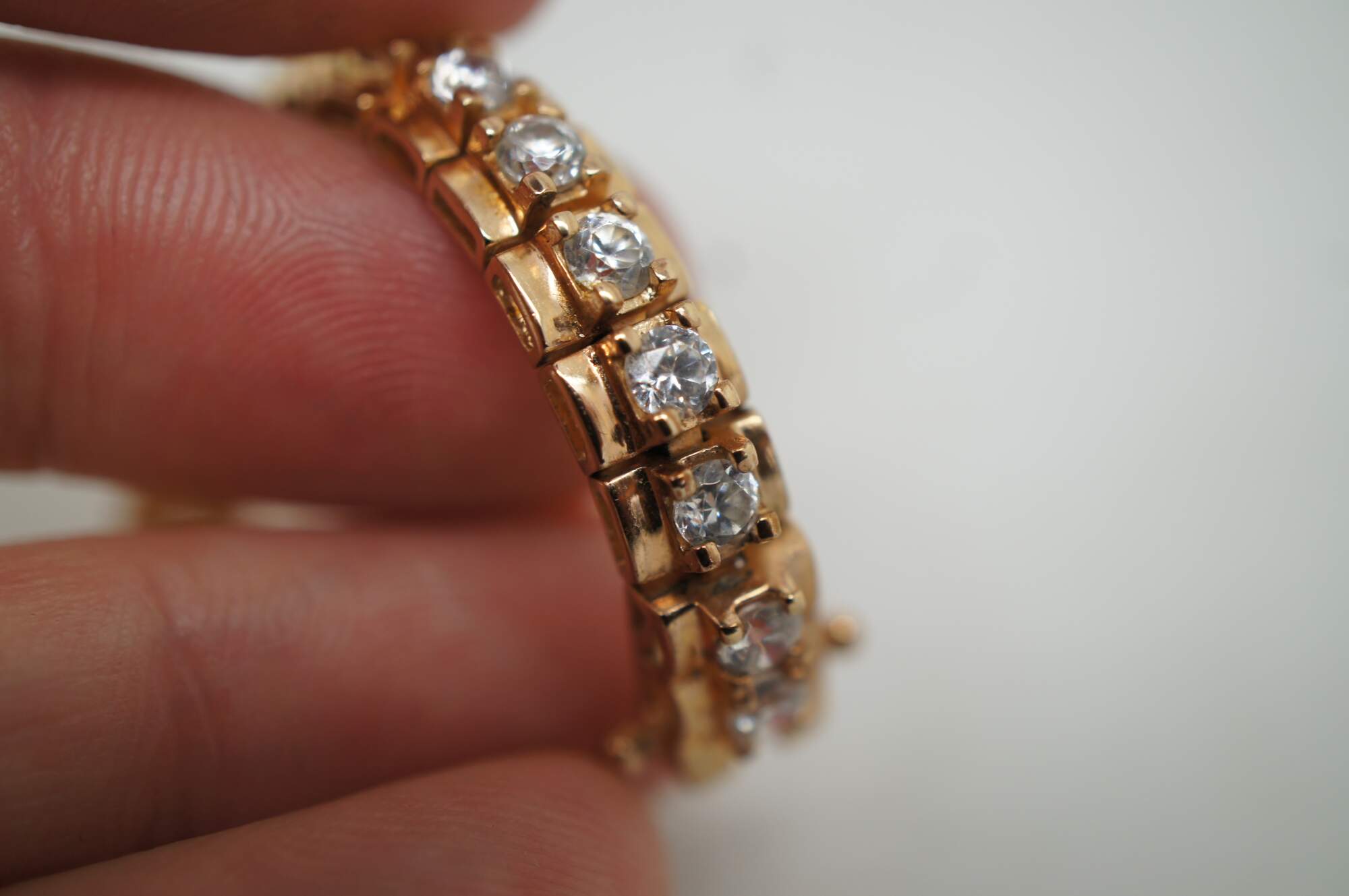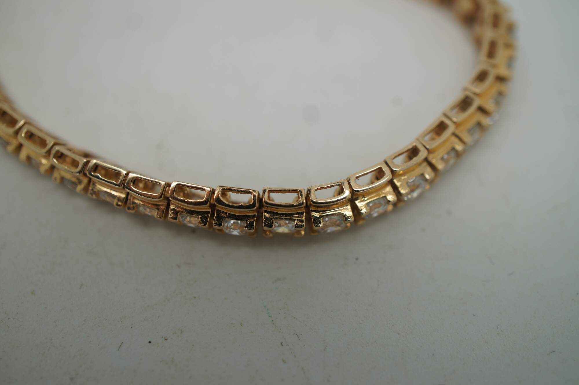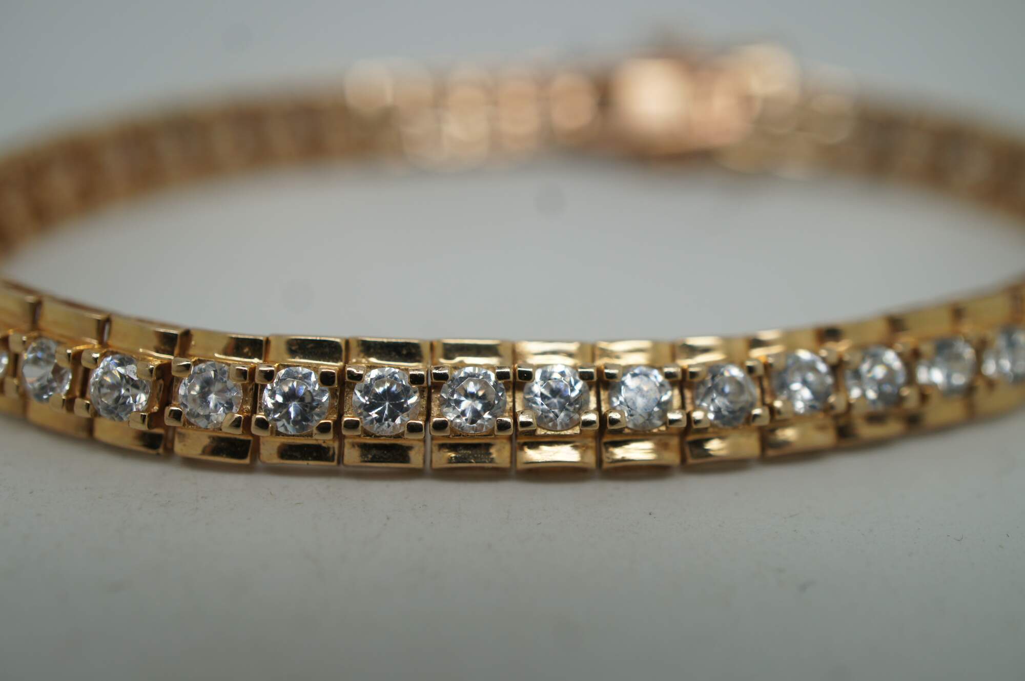 Vintage gold toned 925 sterling silver and white cubic zirconia tennis bracelet with open box clasp. Marked 925 R CZ China.