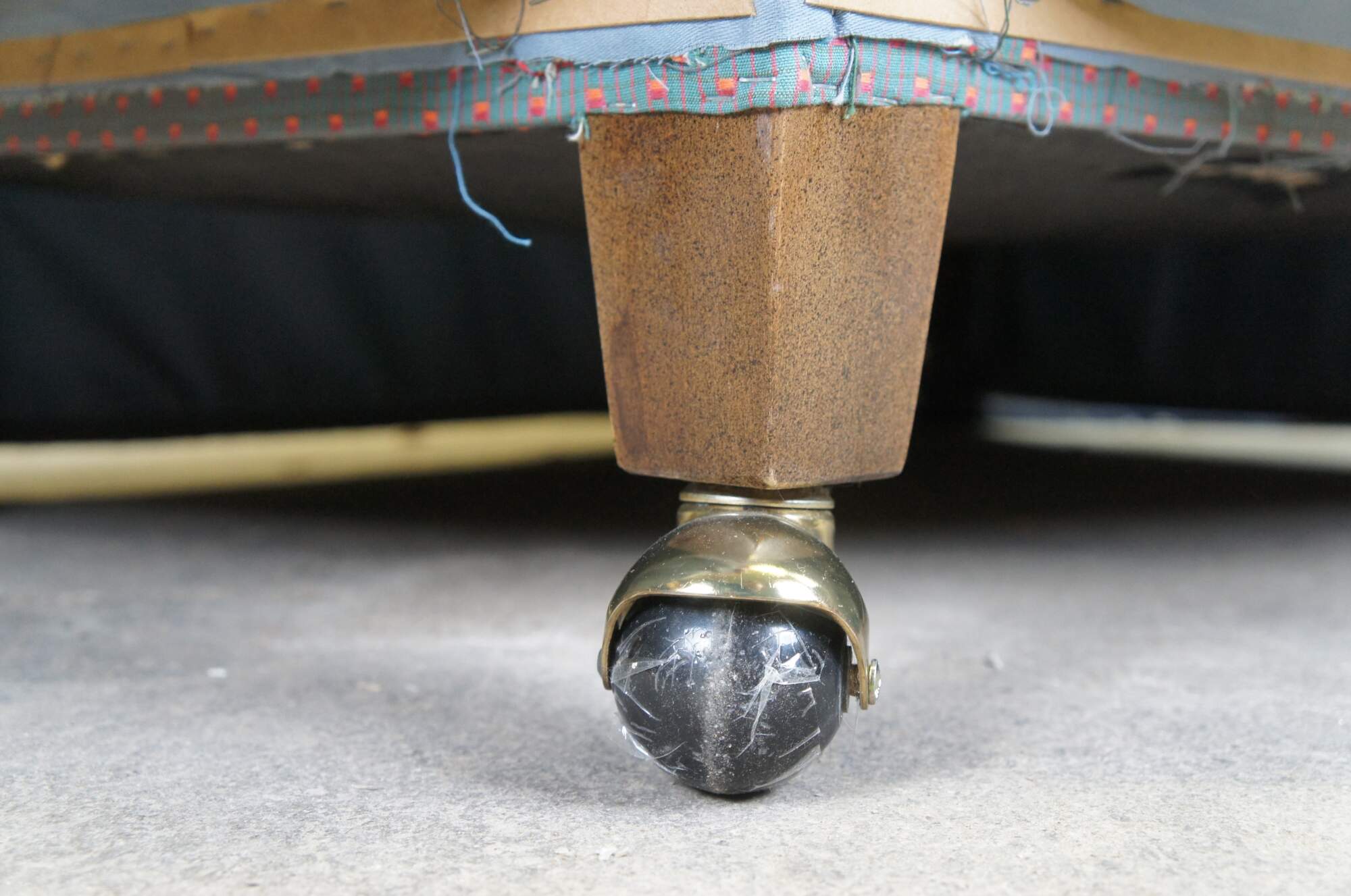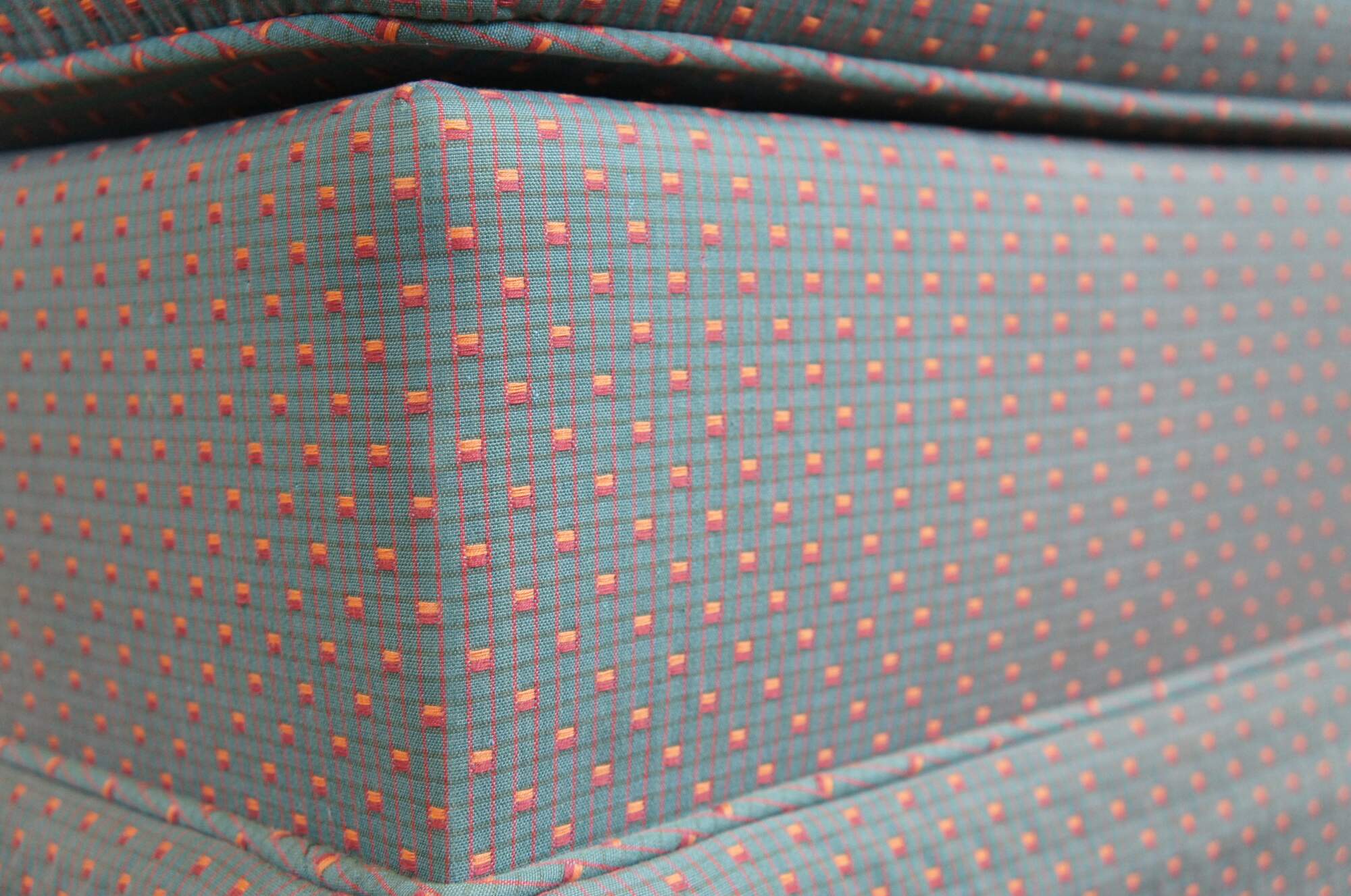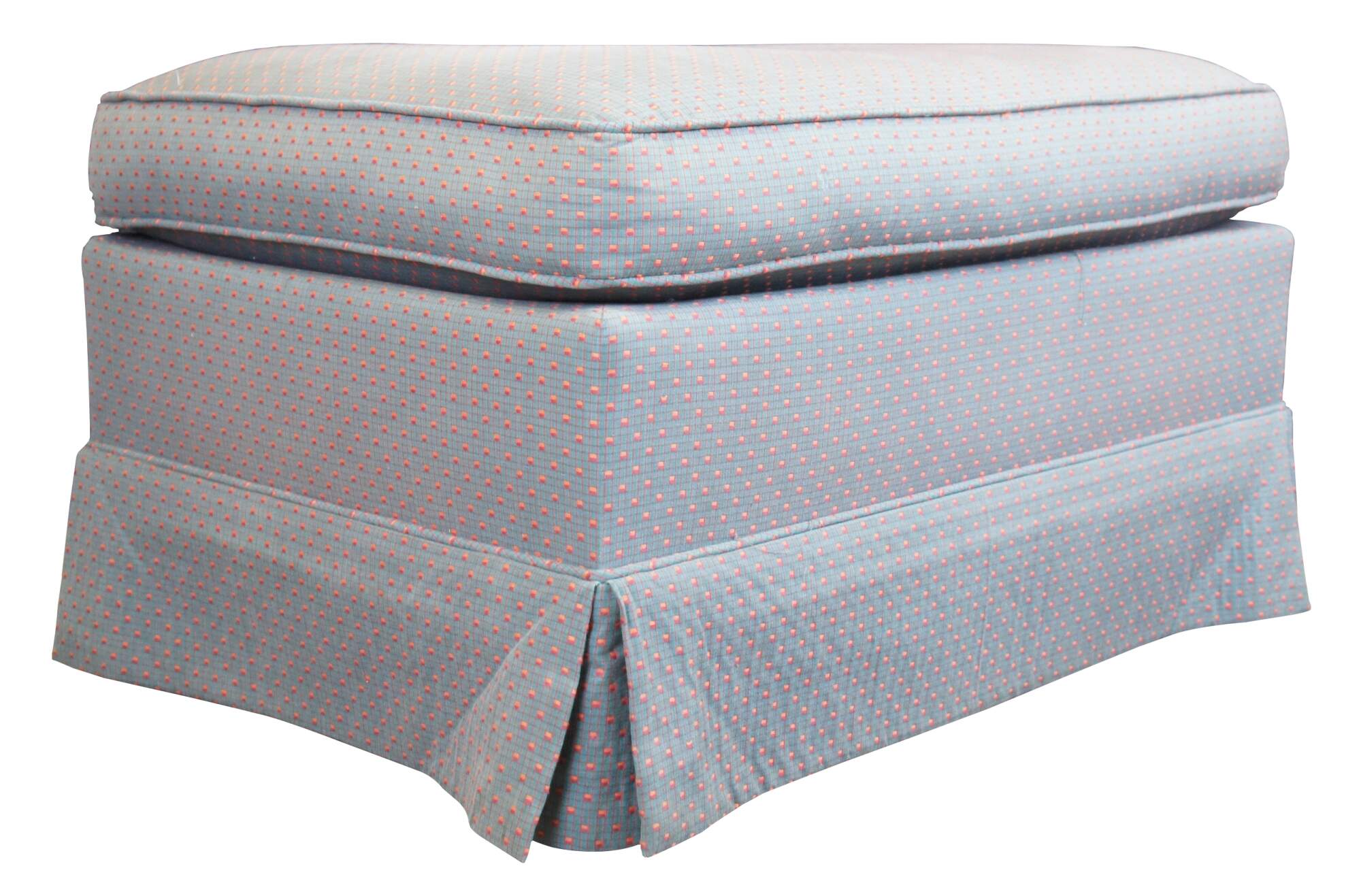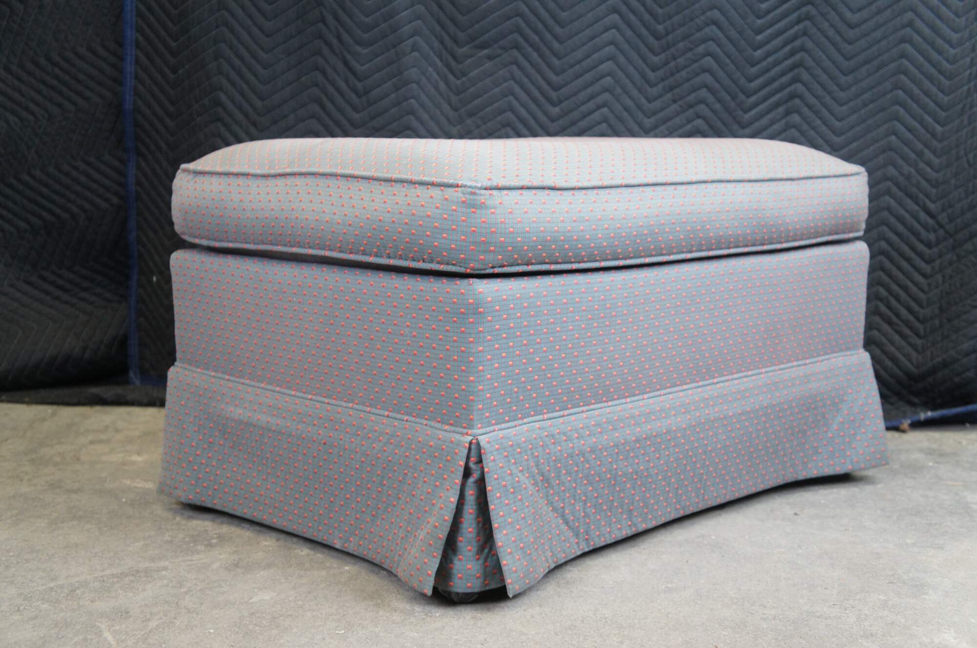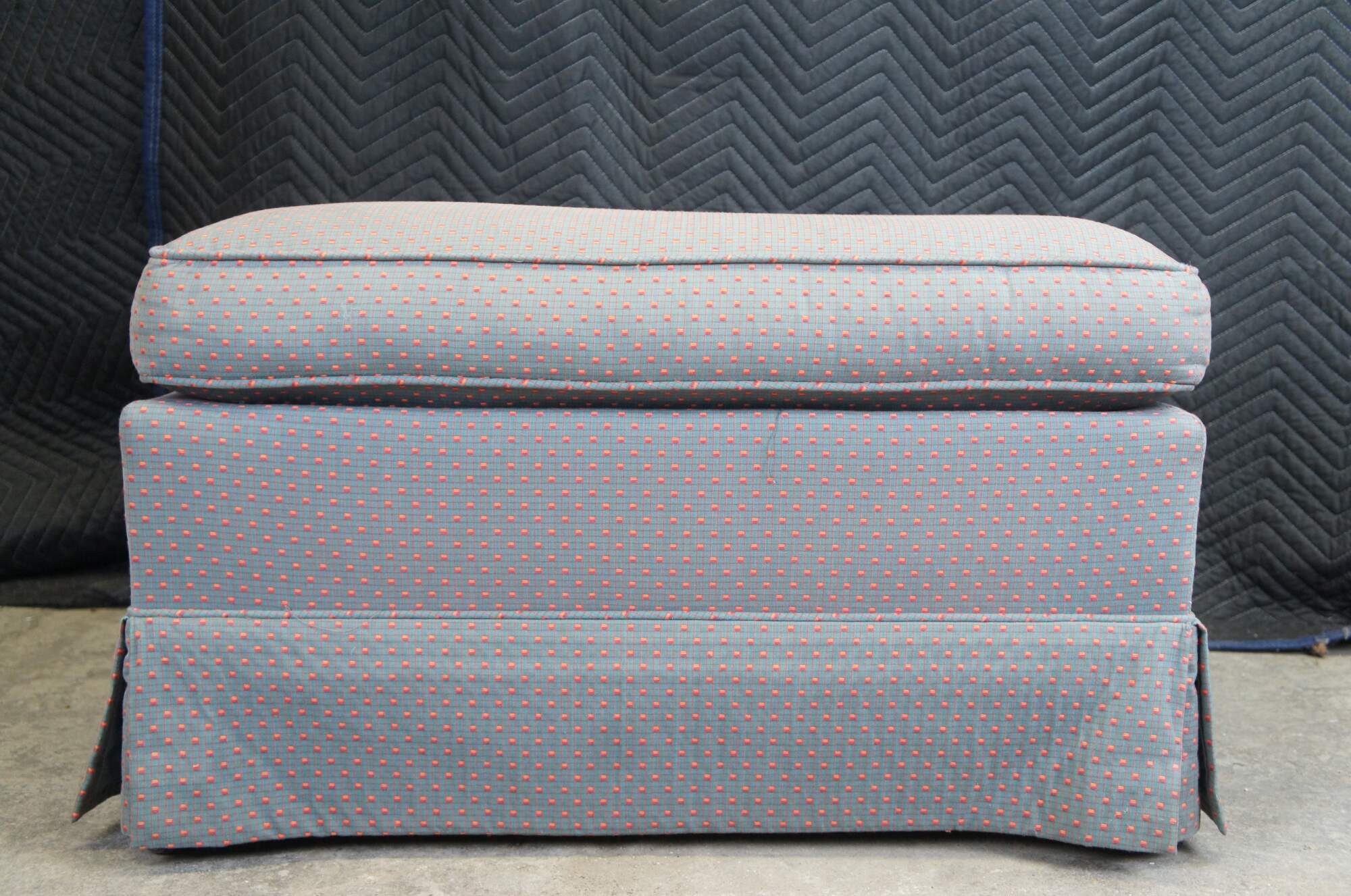 1970s Heirloom Furniture "Emphasis of Excellence" Upholstered Ottoman. Features a rectangular form with plush seat, square check/ polka dot style fabric and square tapered feet leading to casters. Made in High Point, N.C.