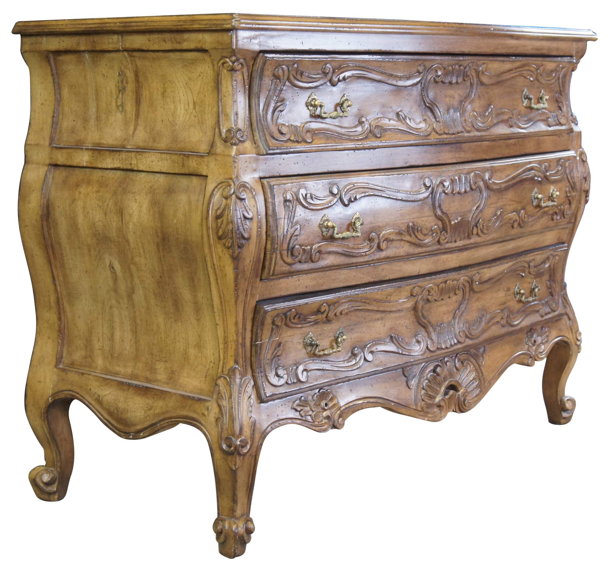 Vintage Italian Lewis Mittman chest of drawers or bombe style dresser. Made of walnut featuring rectangular serpentine form with carved Provincial / Louis XV styling. Made in Italy.