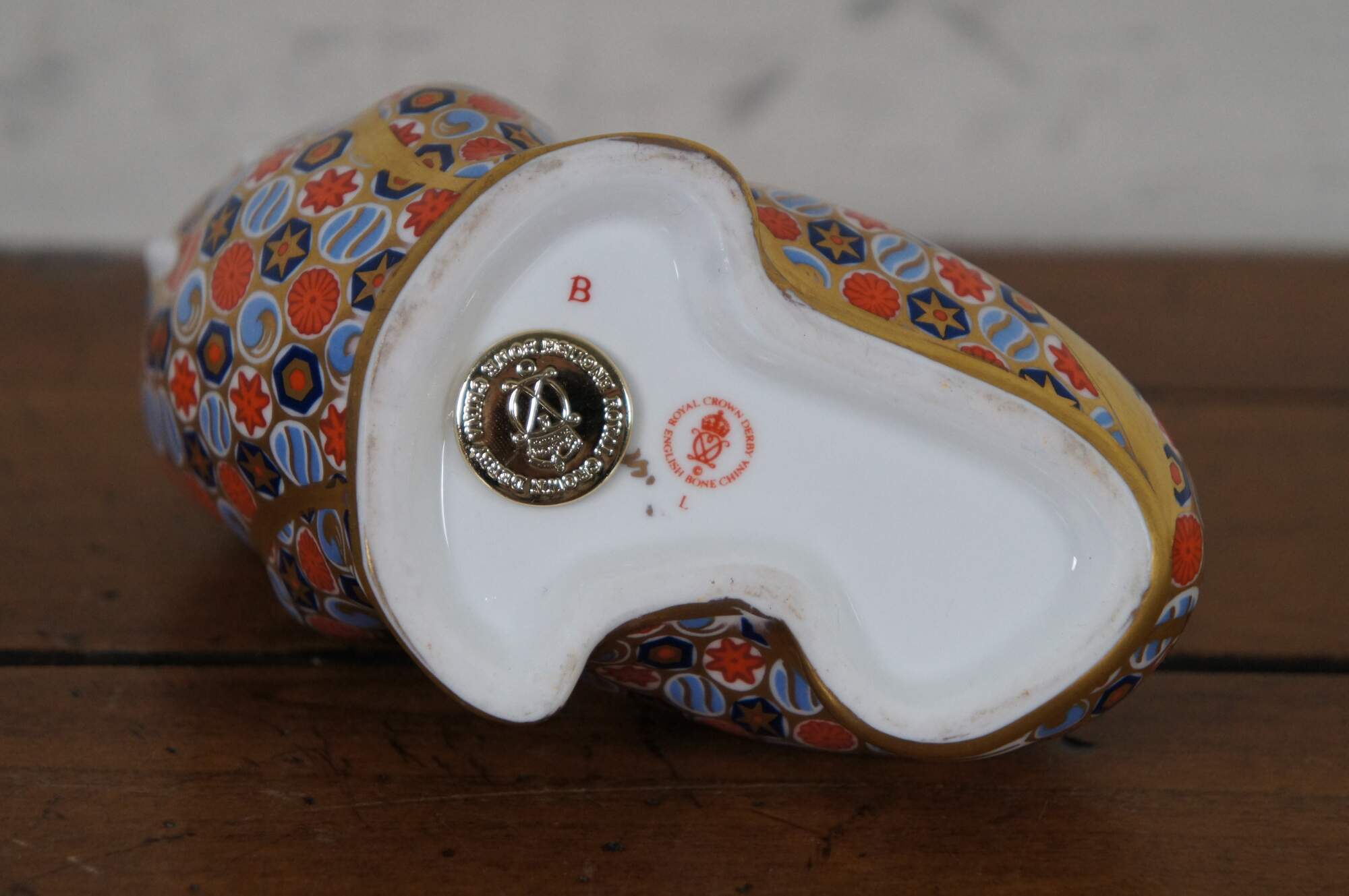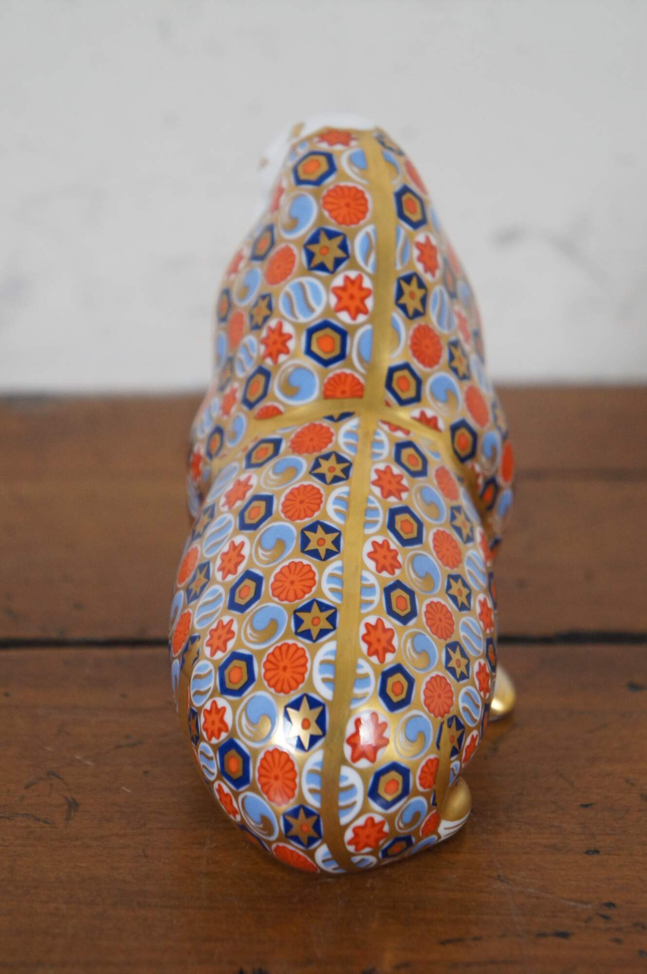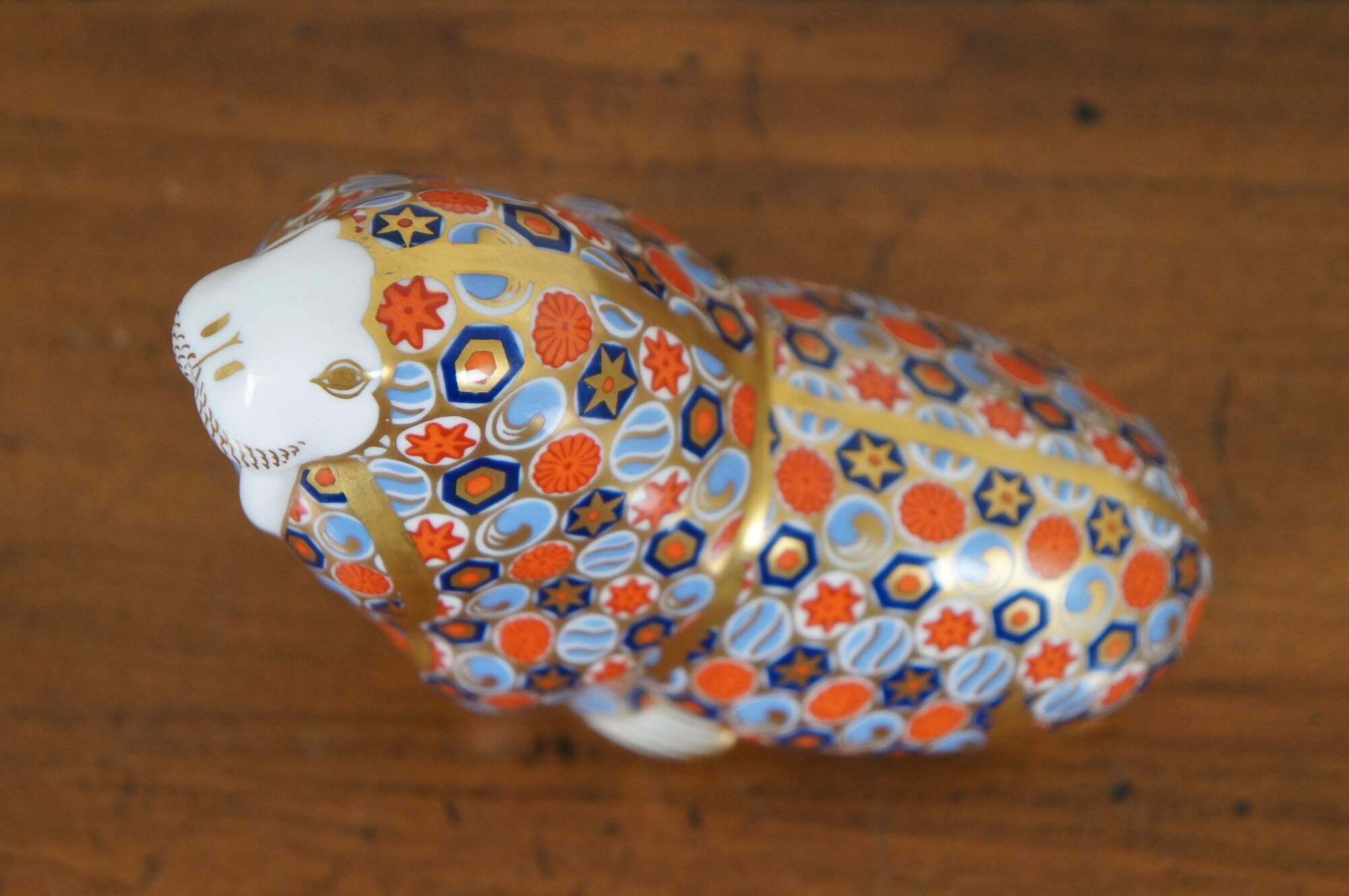 Vintage 1st edition Royal Crown Derby Engliah Bone China porcelain walrus figurine / paperweight, painted with rust, cobalt and gold imari inspired designs, marked with gold stopper.