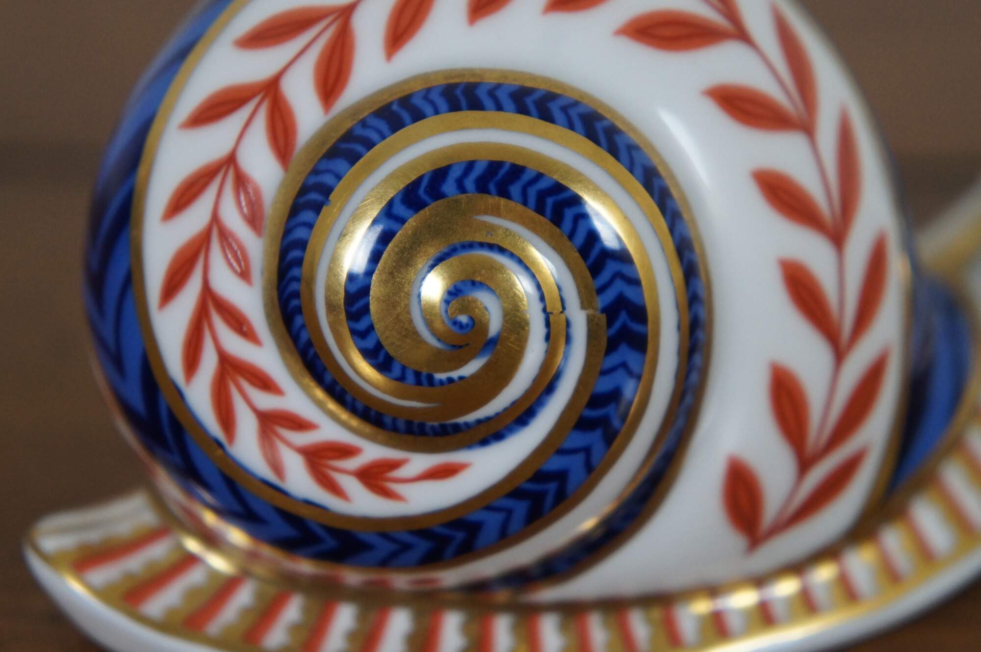 Vintage 1st edition Royal Crown Derby English Bone China porcelain snail figurine / paperweight, painted in rust, cobalt, and gold with imari inspired designs, marked with ceramic stopper.