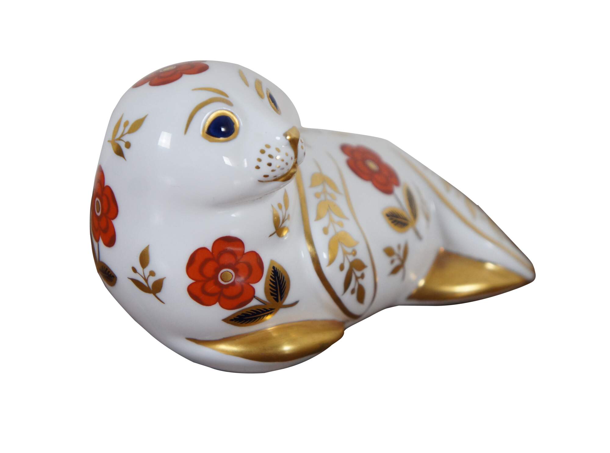 Vintage 1st edition Royal Crown Derby English Bone China porcelain seal figurine / paperweight, painting in rust, gold and cobalt with imari inspired designs, marked with gold stopper.