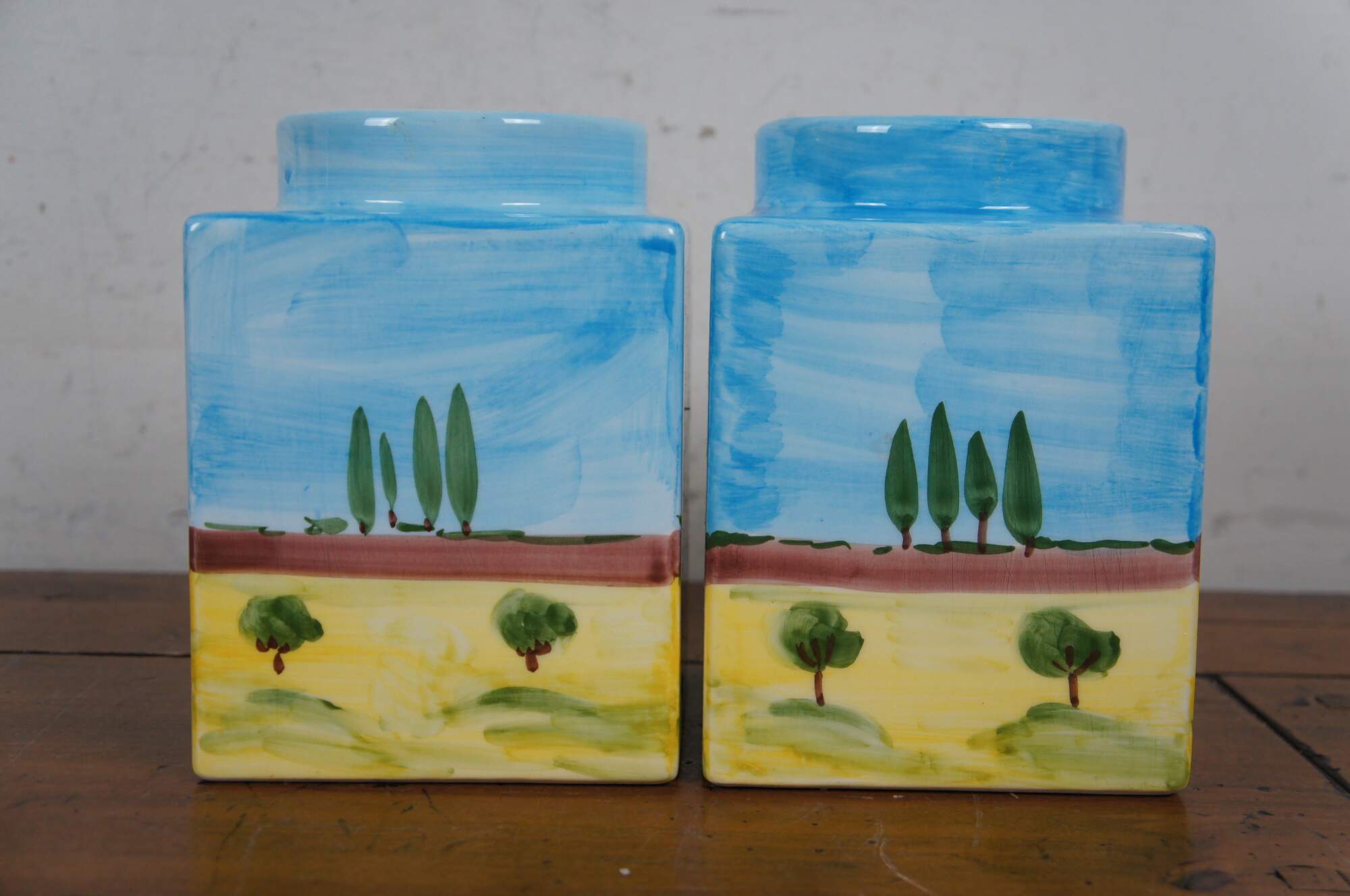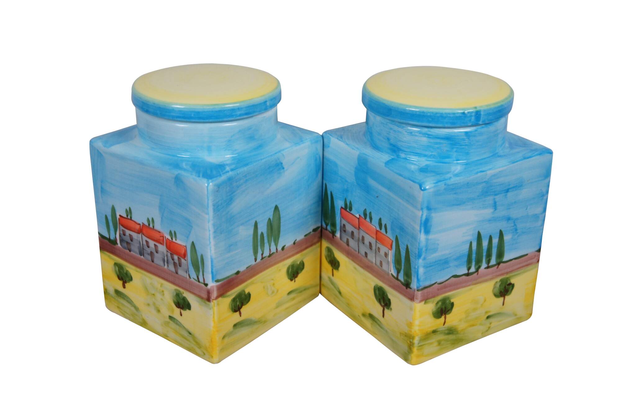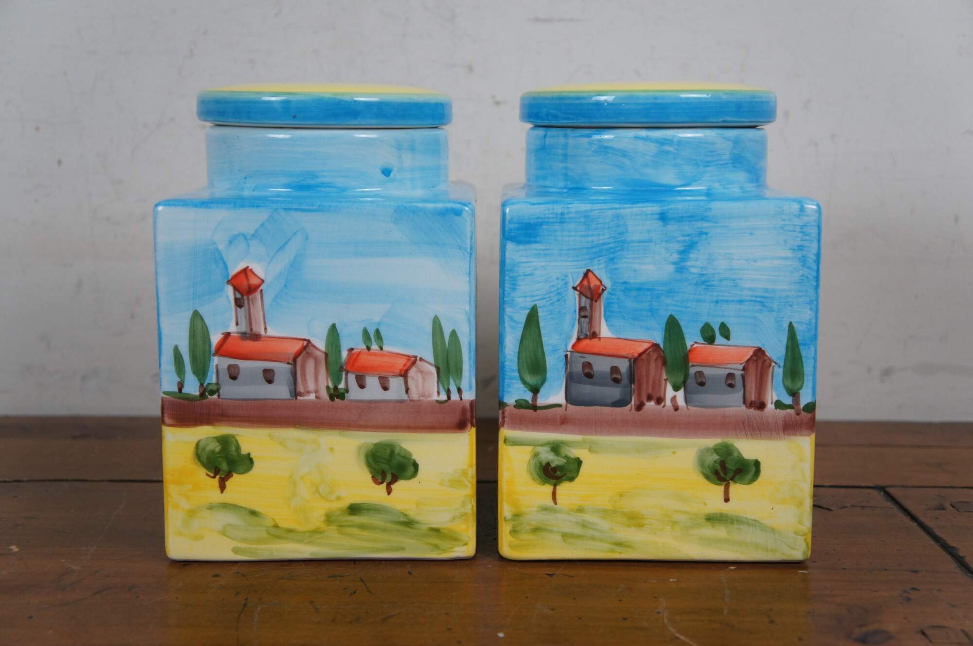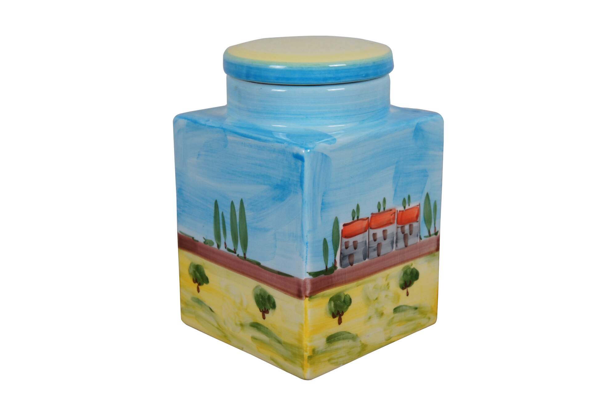 Late 20th century hand painted porcelain jar by Cosimo Primo - Historiae Florentinae, pattern number 20. Square form with round lids, hand painted with an Italian country farmhouse scene with cypress trees, a church and small villas / cottages. Made in Italy.