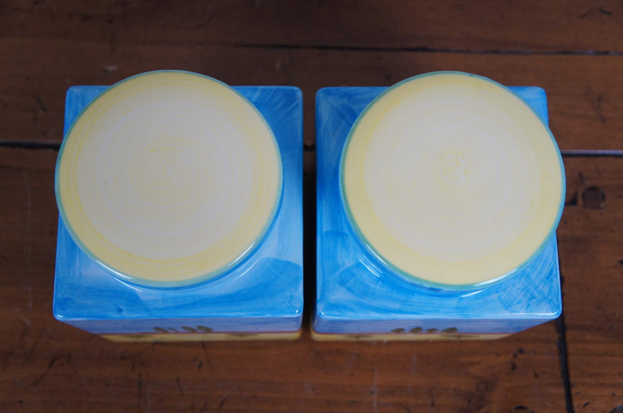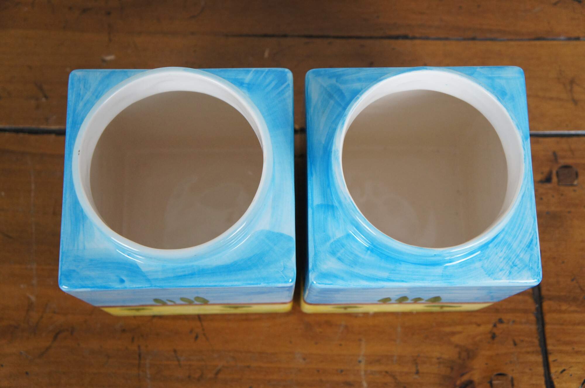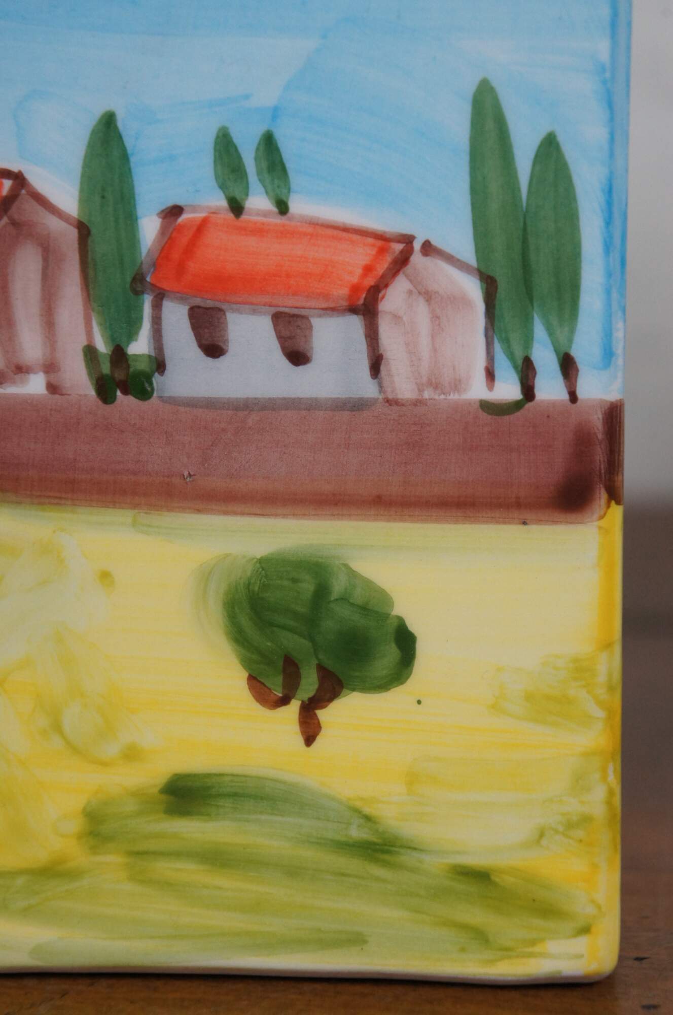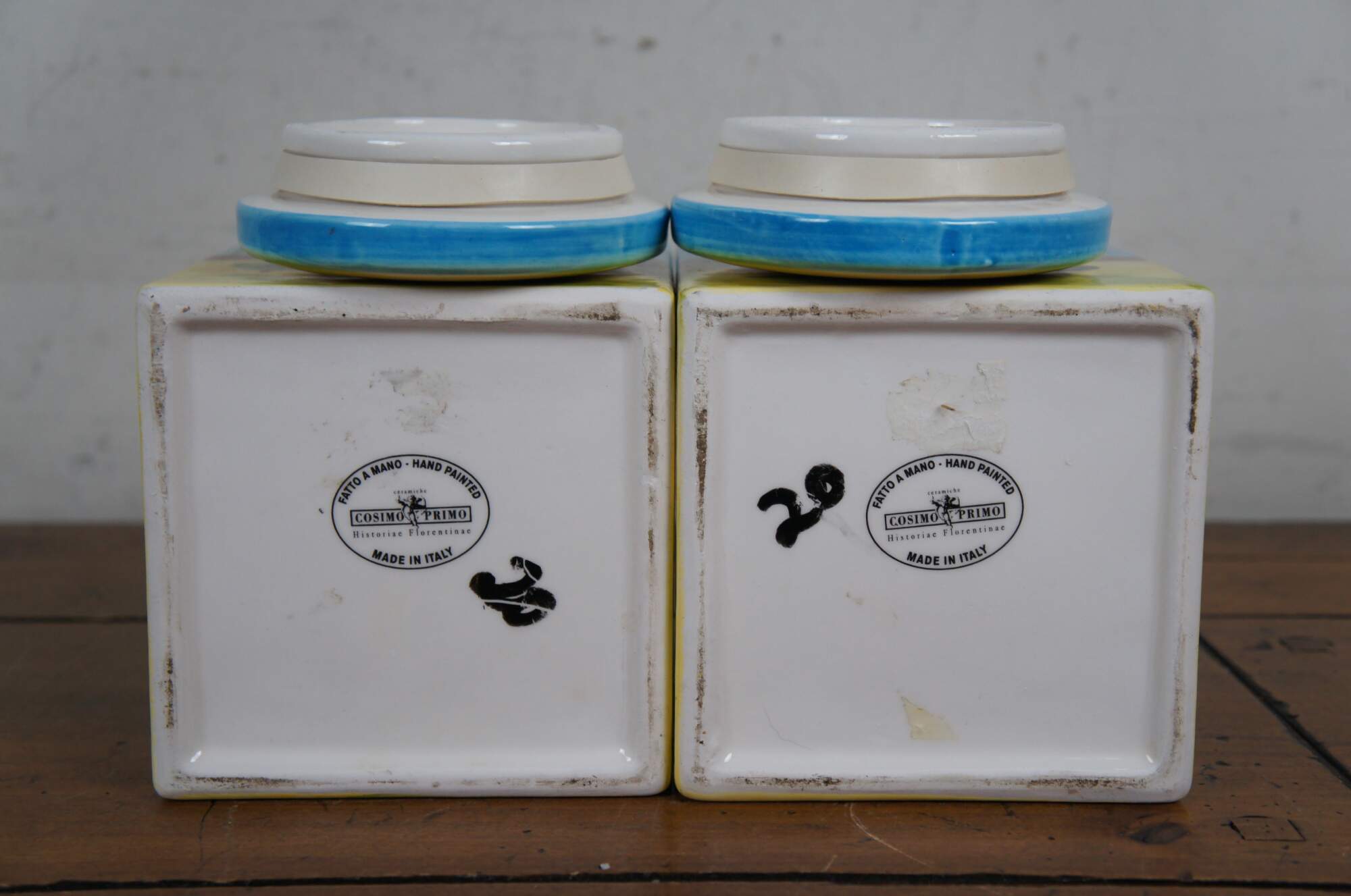 Late 20th century hand painted porcelain jar by Cosimo Primo - Historiae Florentinae, pattern number 20. Square form with round lids, hand painted with an Italian country farmhouse scene with cypress trees, a church and small villas / cottages. Made in Italy.