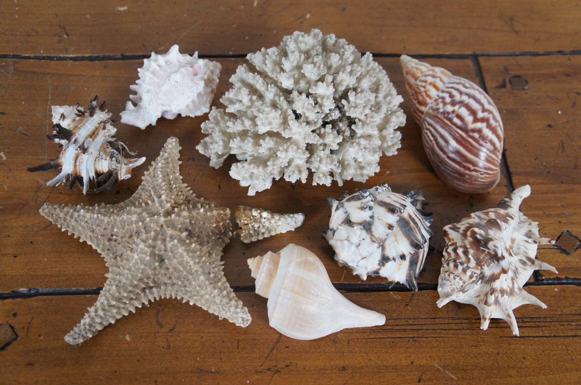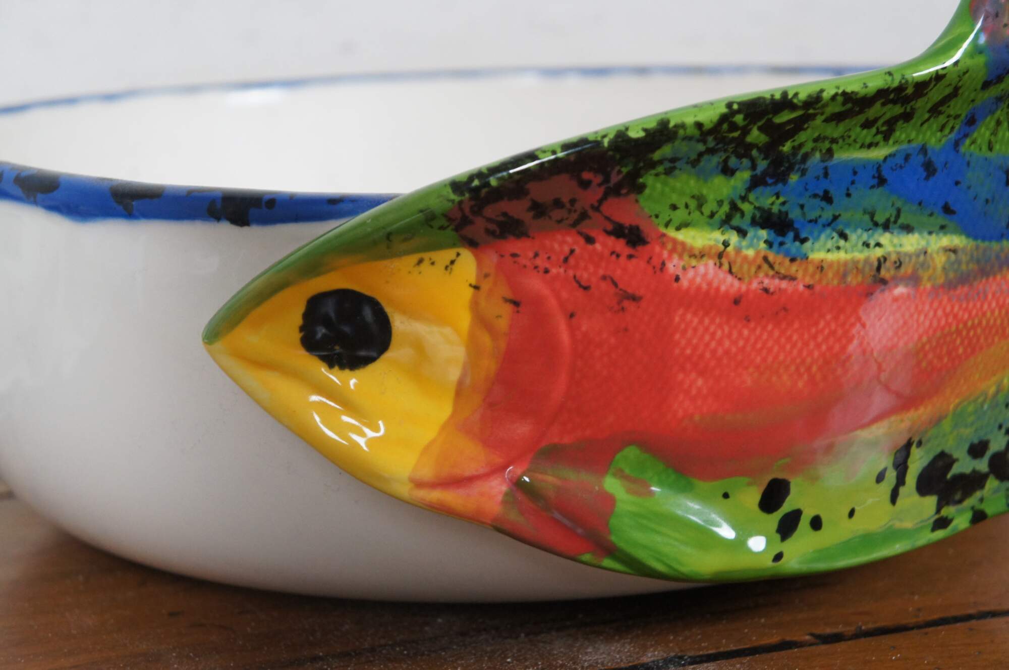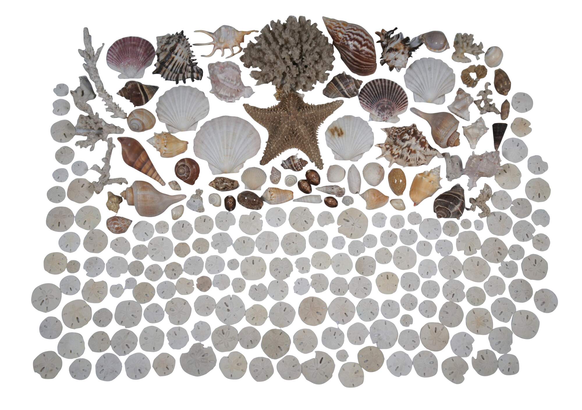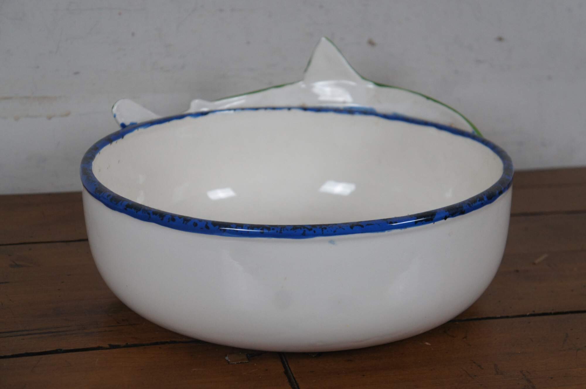 Vintage Amen Wardy Home ceramic centerpiece / salad bowl, white with applied multicolor salmon and blue rim. Filled with a mid to late 20th century collection of assorted sea shells, collected by a diving enthusiast. Includes approximately 165 sand dollars and 67 other shells including star fish, scallops, coral, clam, spiral, cowrie, and spider conch.