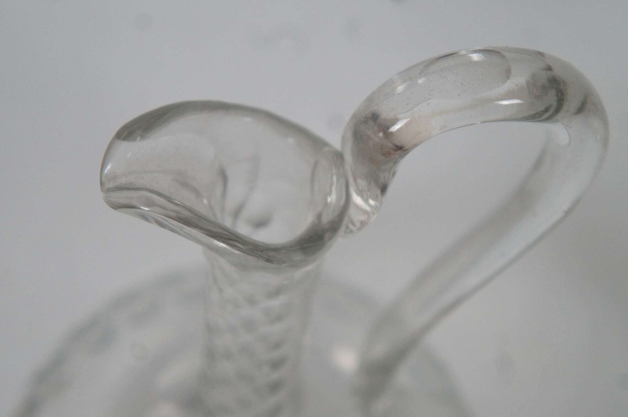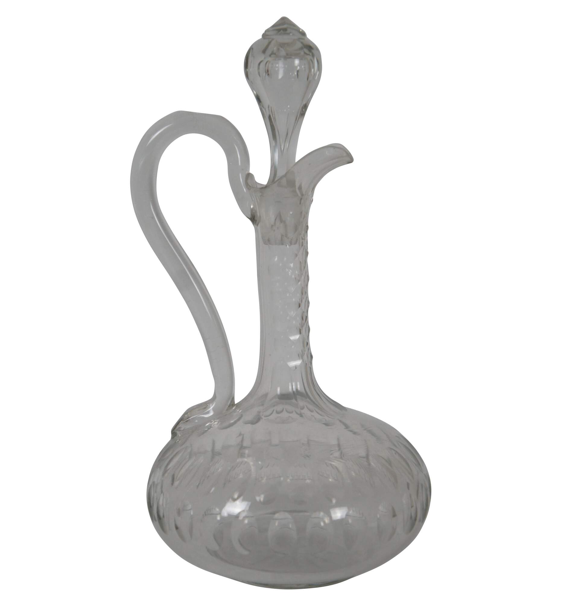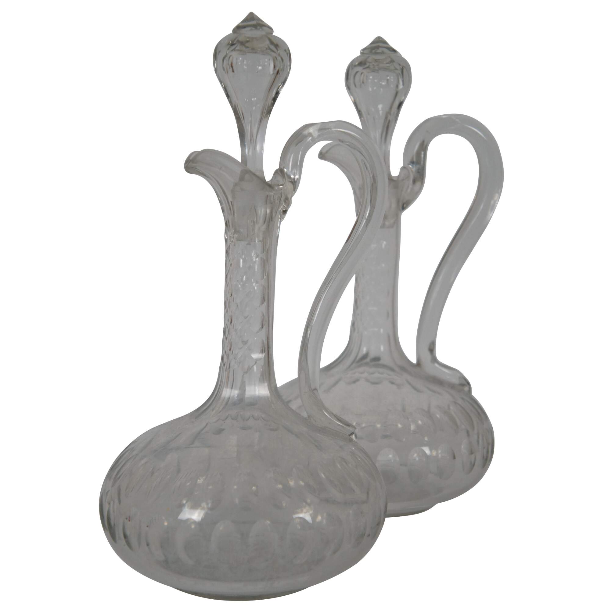 A pair of 20th century glass decanters or ewers. Features a bulbous bottom with cut glass orbs, a wing shaped handle and long neck leading to spout with handle.