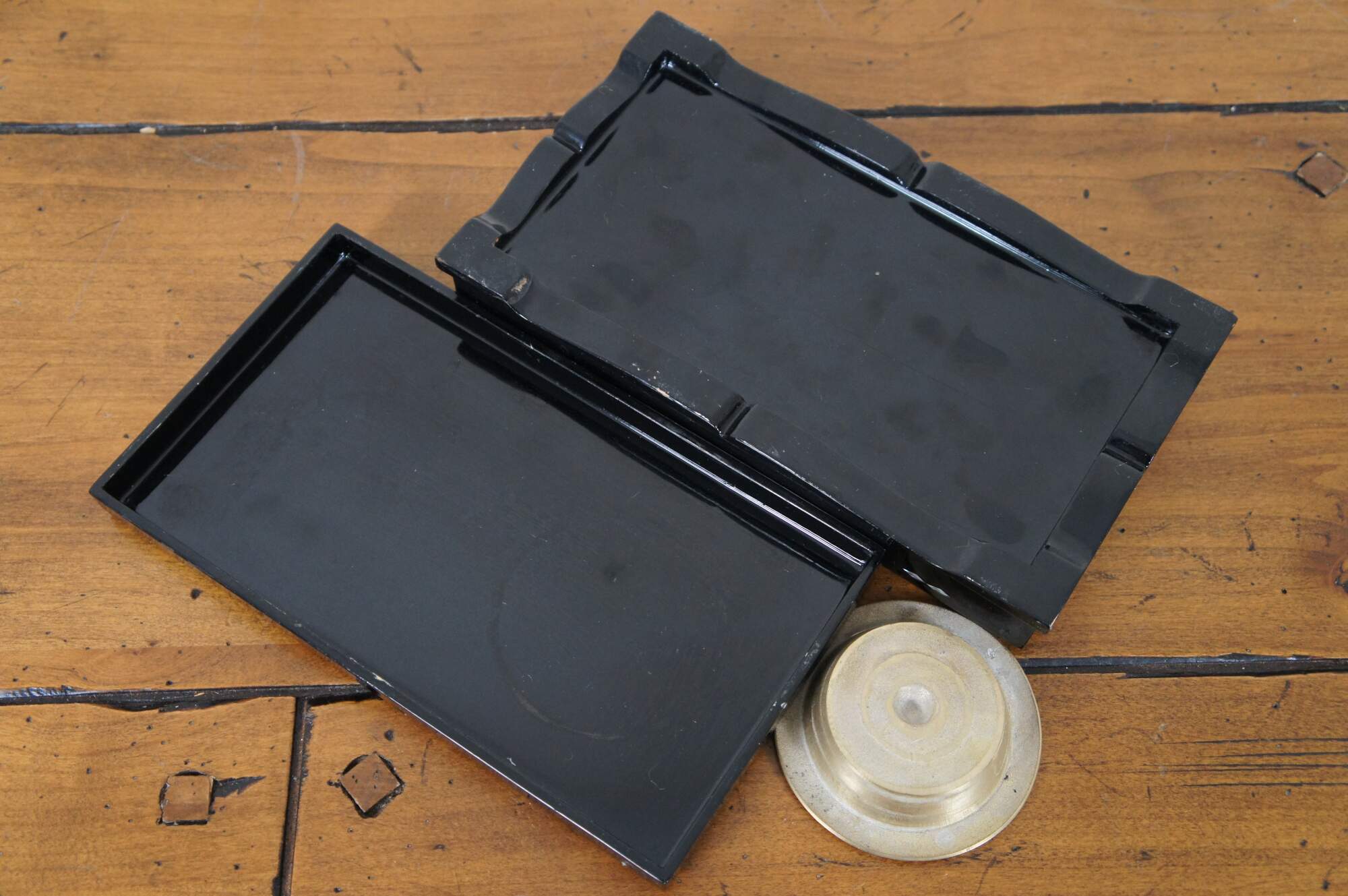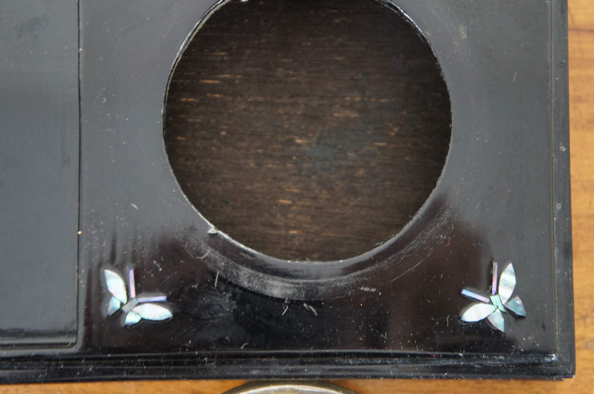 Mid century Japanese Chinoiserie black lacquered cigarette box decorated with mother of pearl flowers and butterflies, opening to reveal compartment for cigarettes / tobacco and a brass ashtray. Circa 1950s.