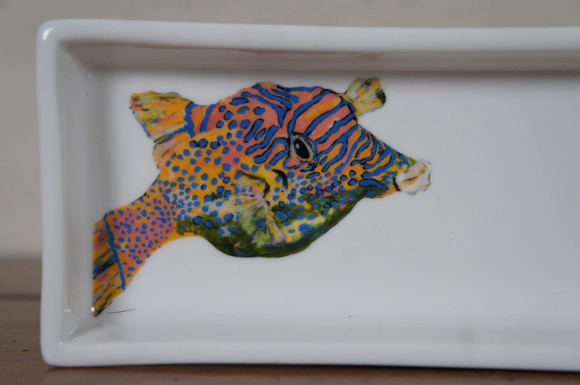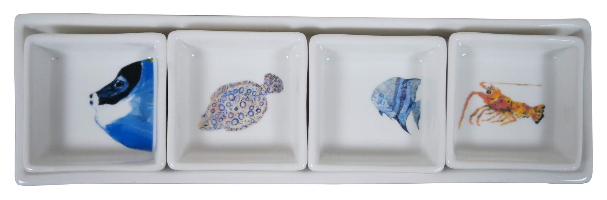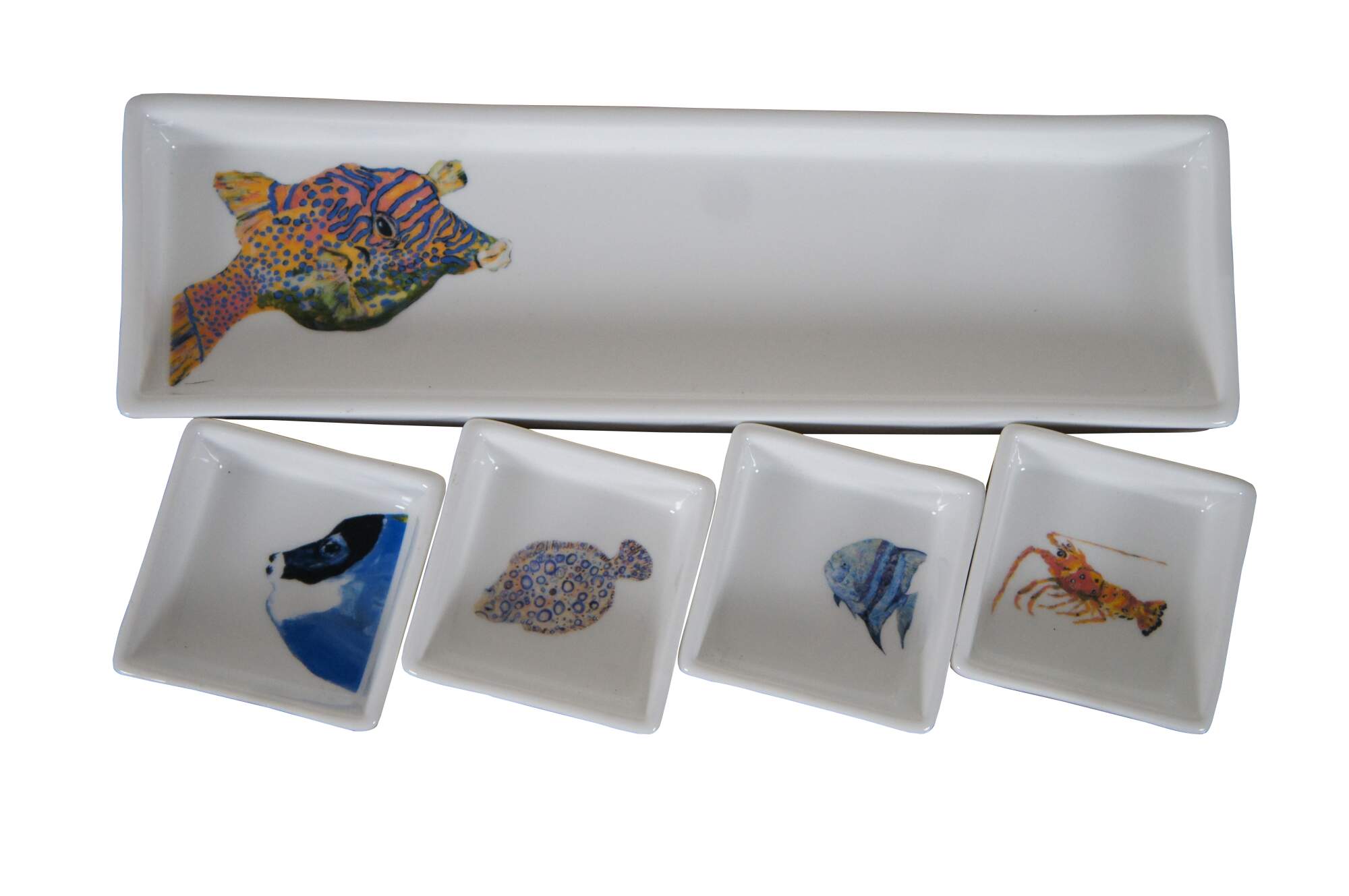 Kim Rody Creations Fisartista cracker and dip divided dish set including rectangular porcelain tray and four square mini bowls, each decorated with a different tropical sea creature / fish. Microwave and dishwasher safe.