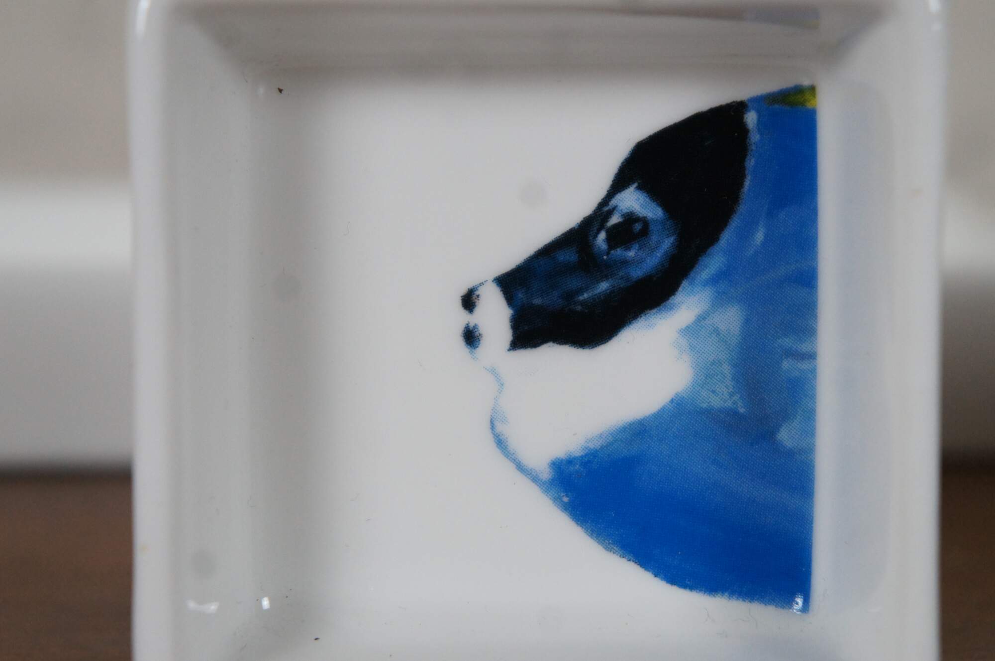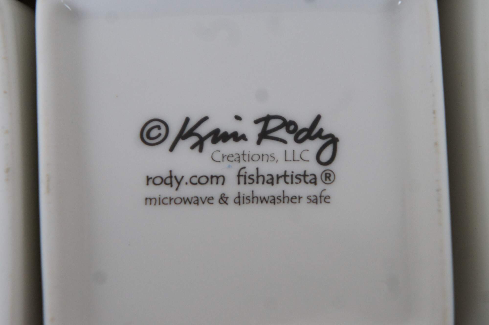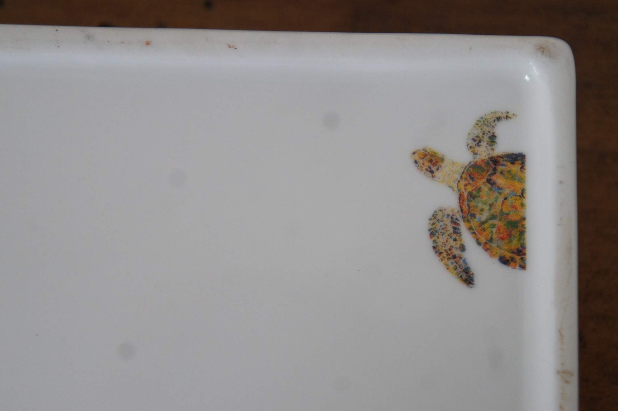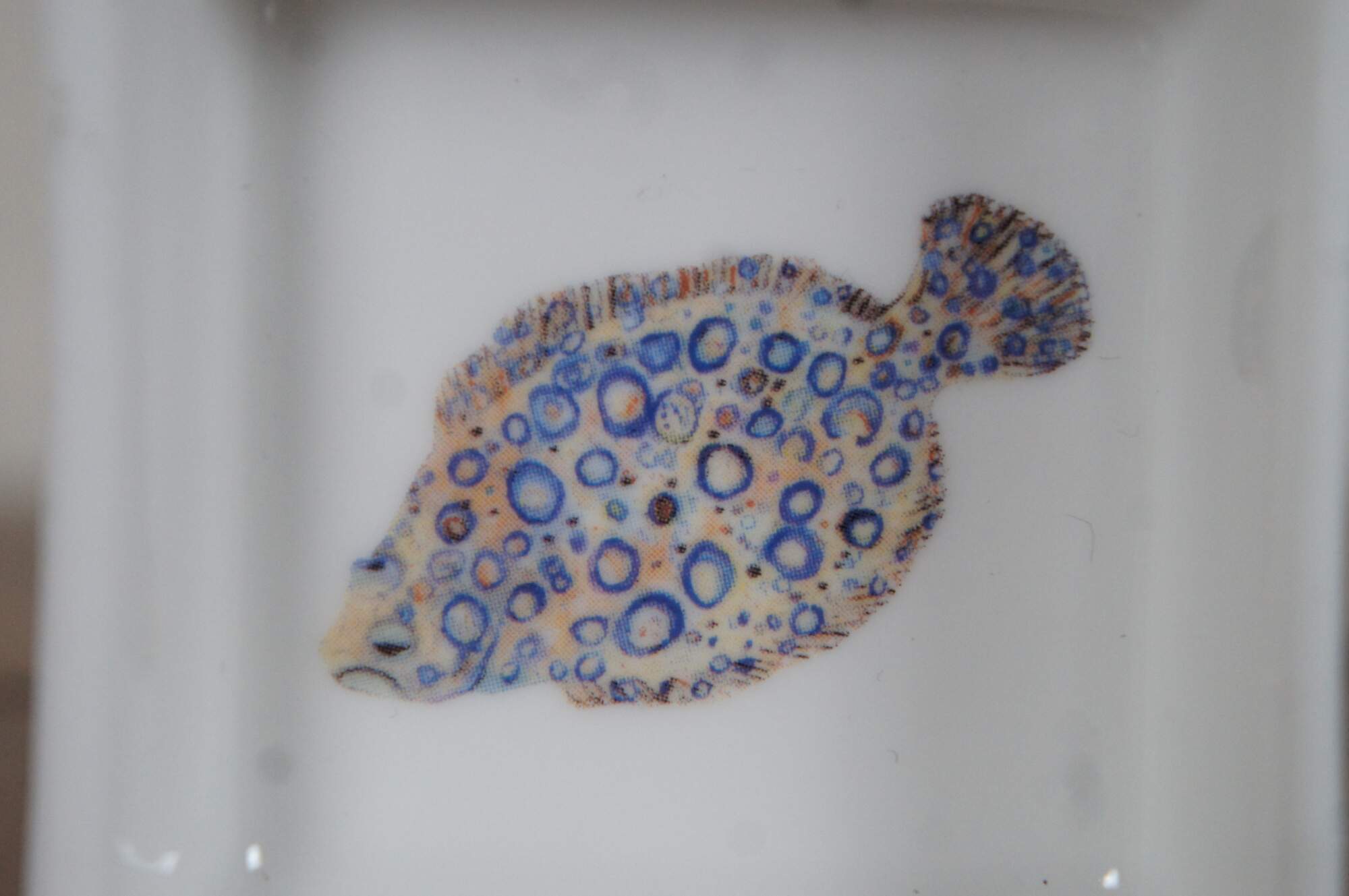 Kim Rody Creations Fisartista cracker and dip divided dish set including rectangular porcelain tray and four square mini bowls, each decorated with a different tropical sea creature / fish. Microwave and dishwasher safe.