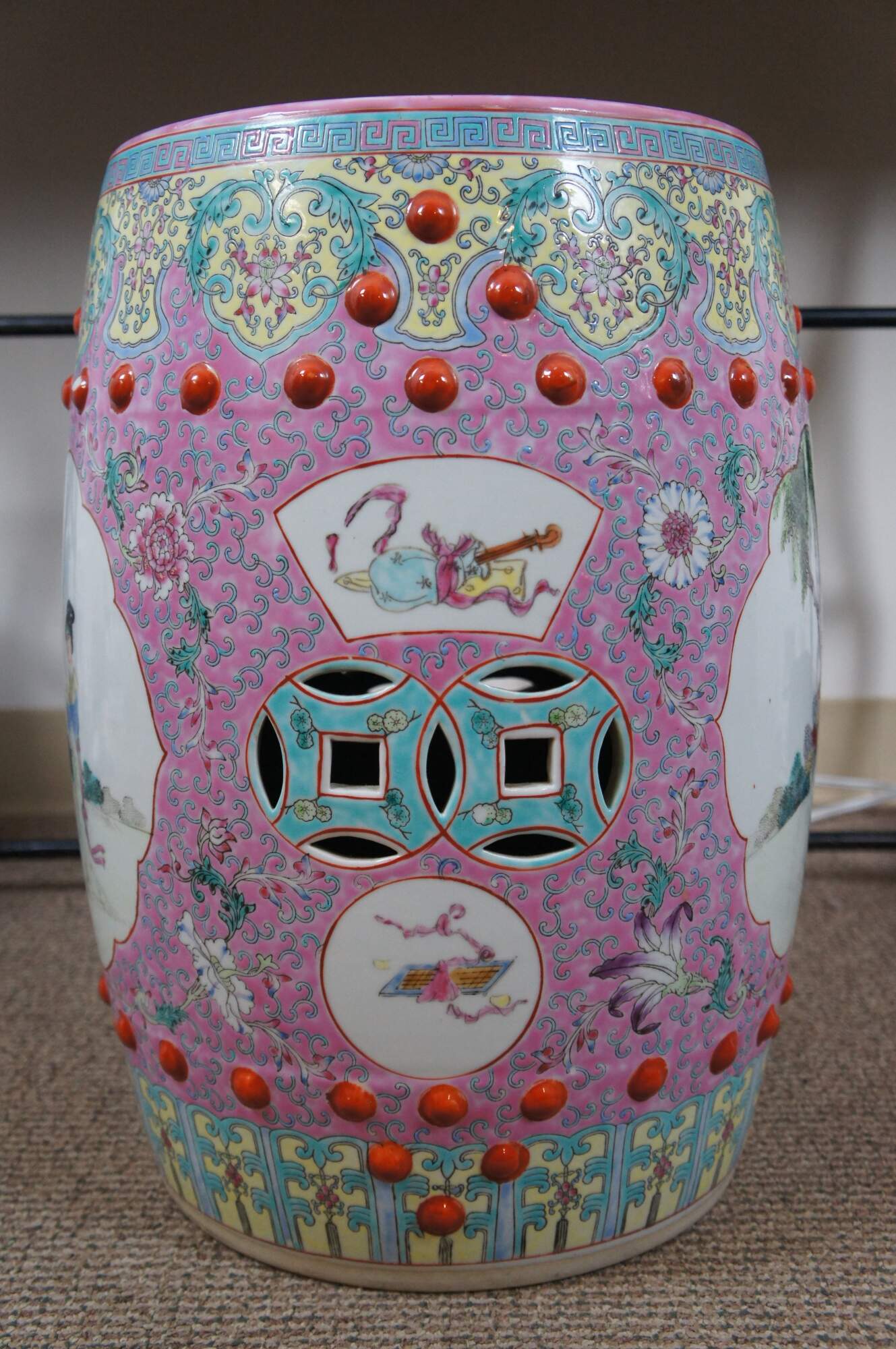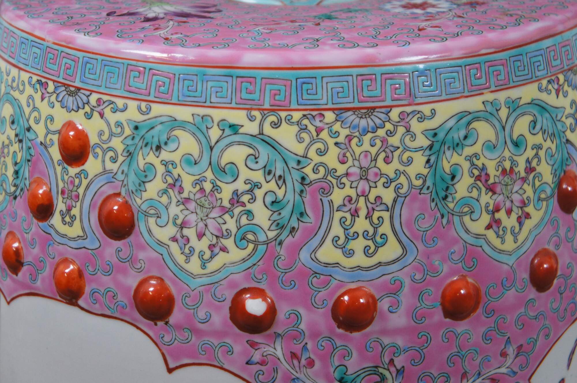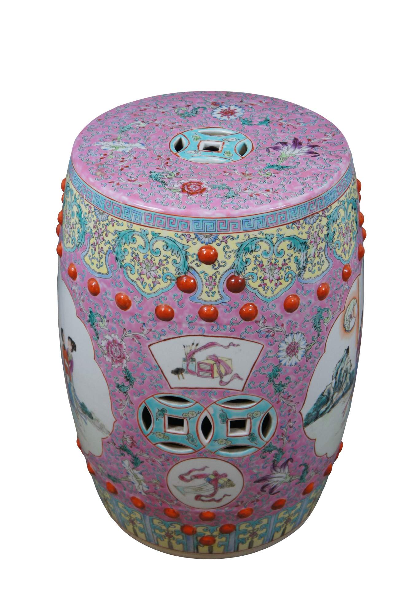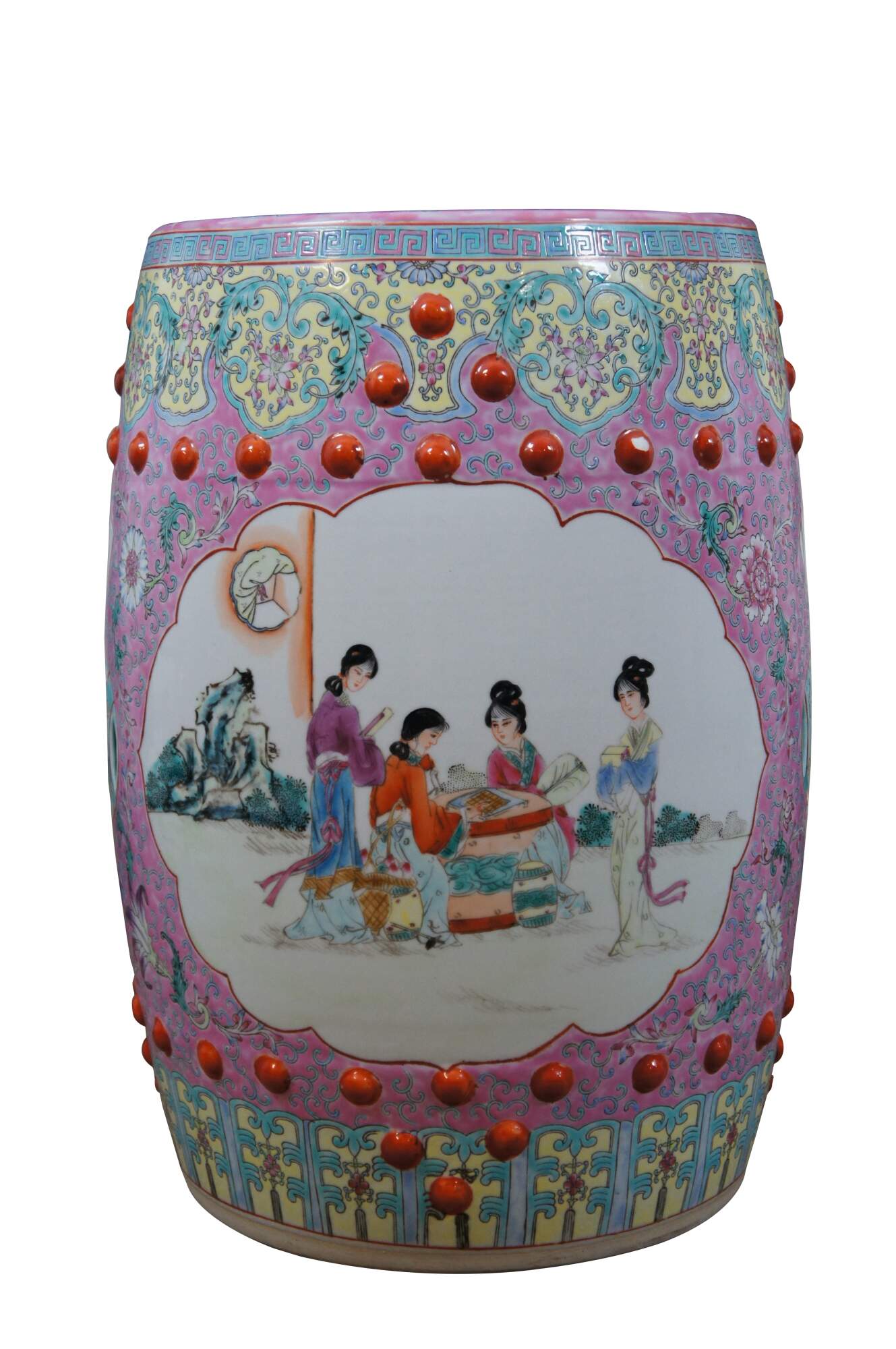 The sides of this garden stool feature Asian scenes of women or geishas. One depicts them gathered around a table playing mahjong, while the other shows them dancing by a bridge with colorful trees in the background. The women are wearing bright colorful robes in yellow, pink, red and green. Each scene is framed by a red or pink scalloped frame. Outside the scalloped frame, are highly decorated hand-painted Famille rose floral and cabbage type foliage in both green, yellow, pink and white. The top is accented by a vibrant greek key design.