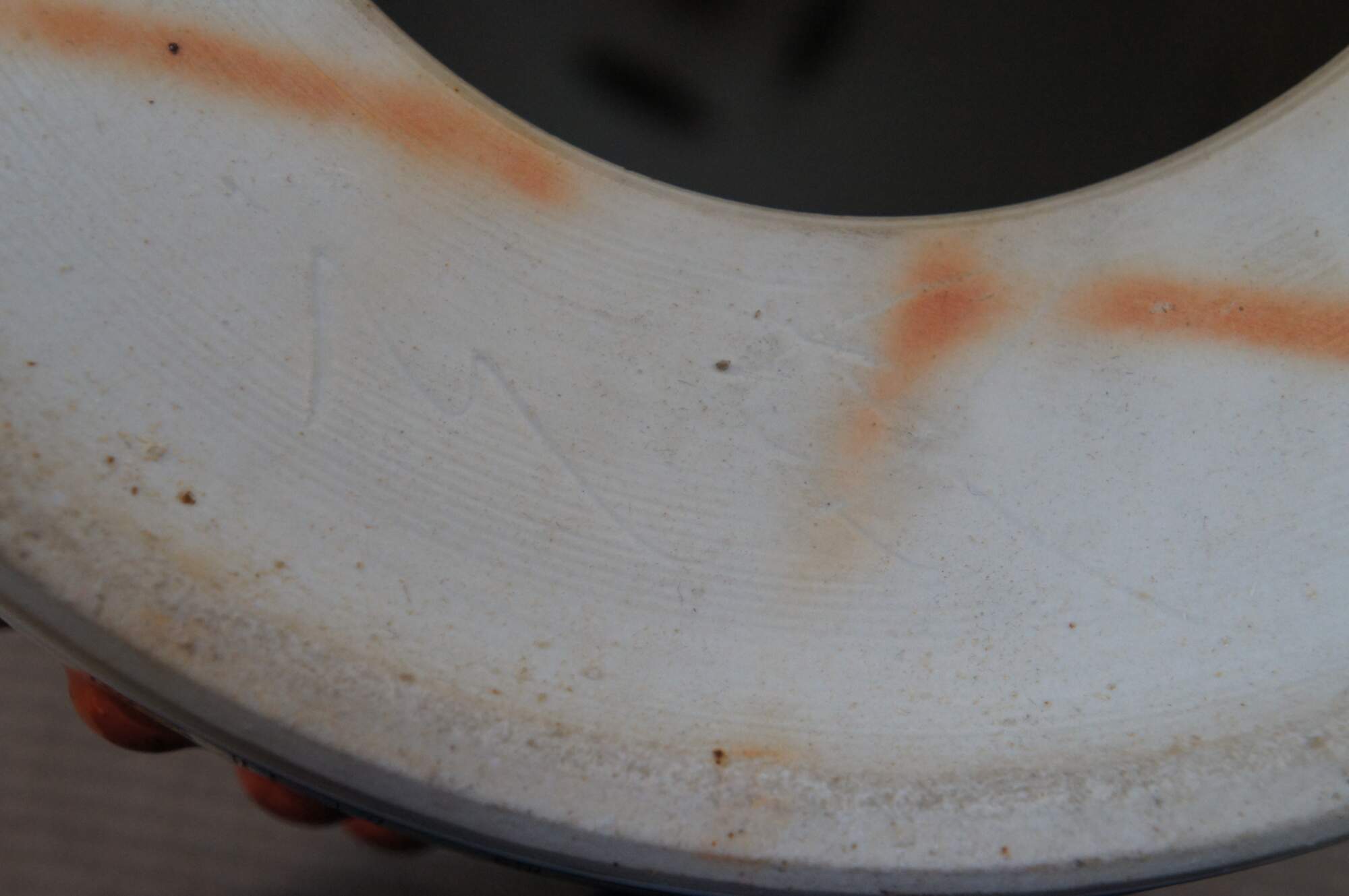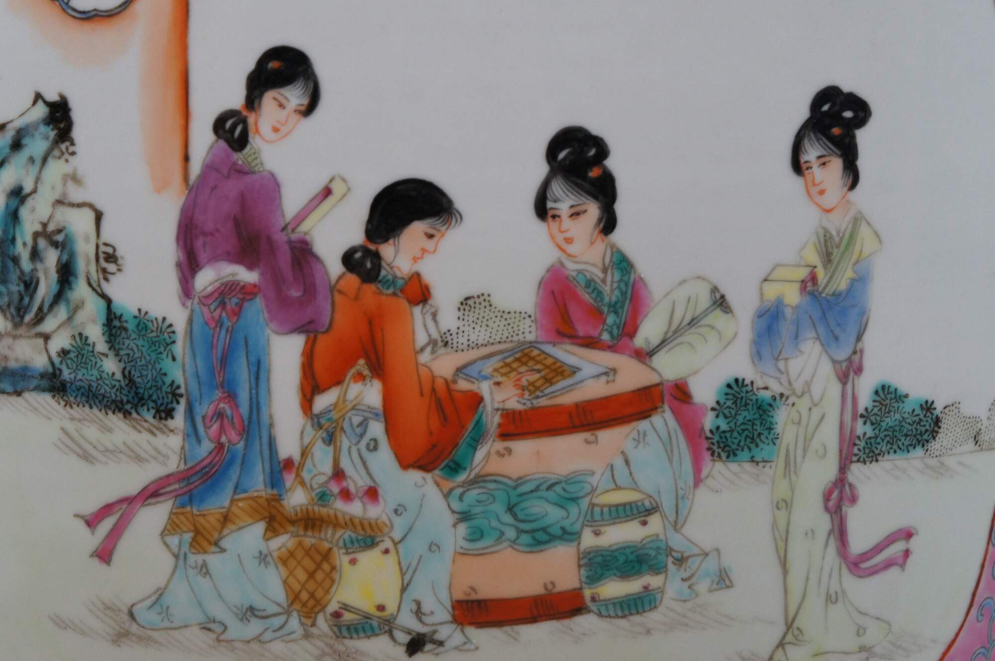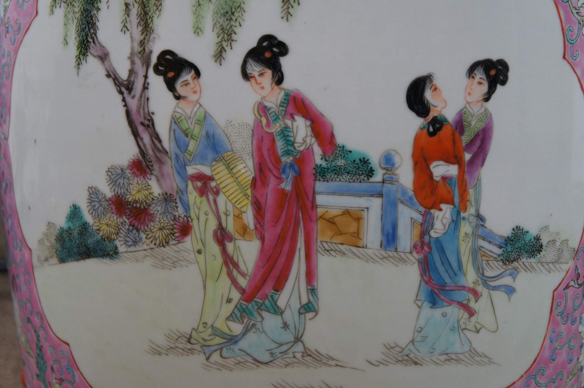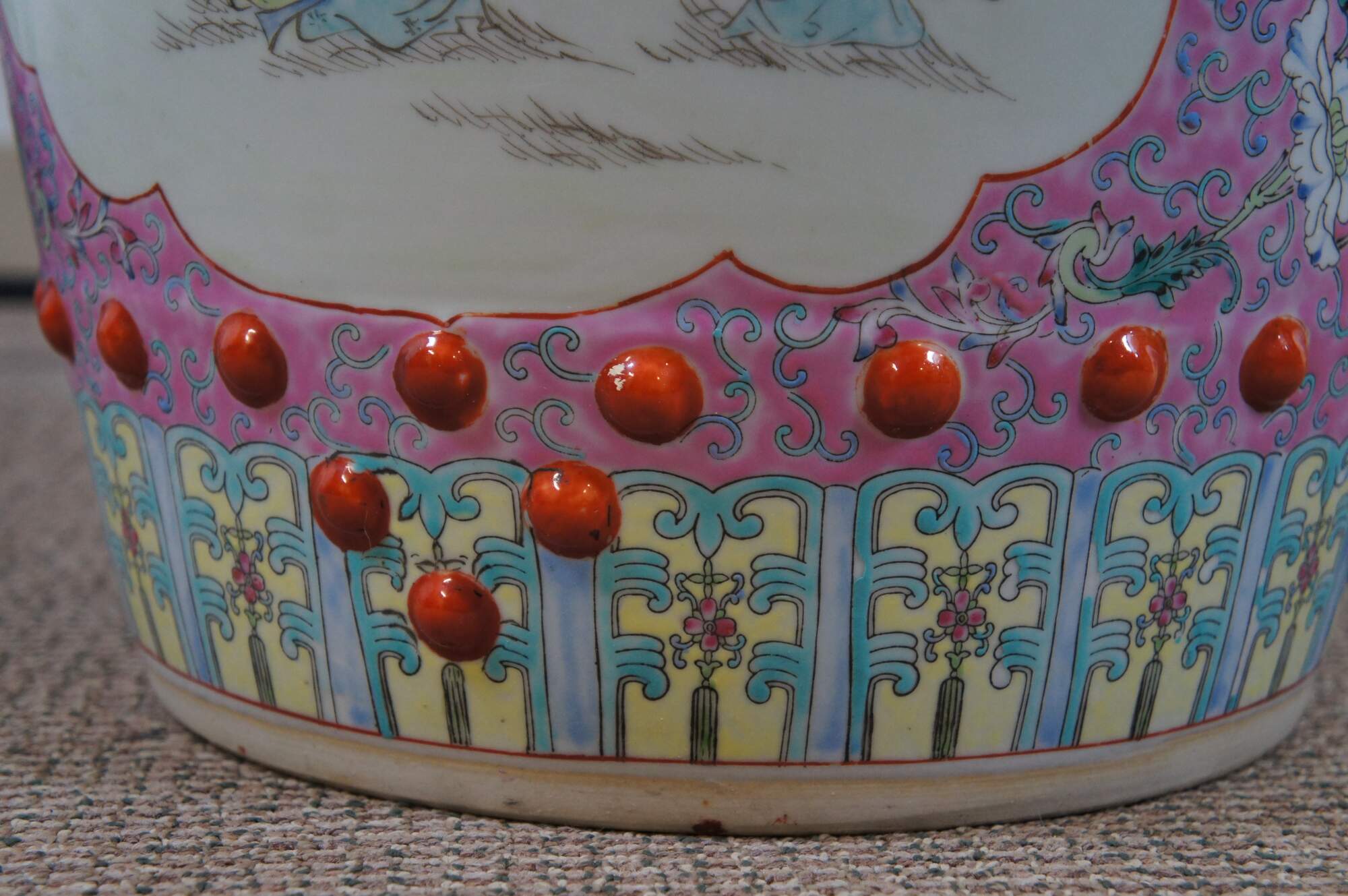 The sides of this garden stool feature Asian scenes of women or geishas. One depicts them gathered around a table playing mahjong, while the other shows them dancing by a bridge with colorful trees in the background. The women are wearing bright colorful robes in yellow, pink, red and green. Each scene is framed by a red or pink scalloped frame. Outside the scalloped frame, are highly decorated hand-painted Famille rose floral and cabbage type foliage in both green, yellow, pink and white. The top is accented by a vibrant greek key design.