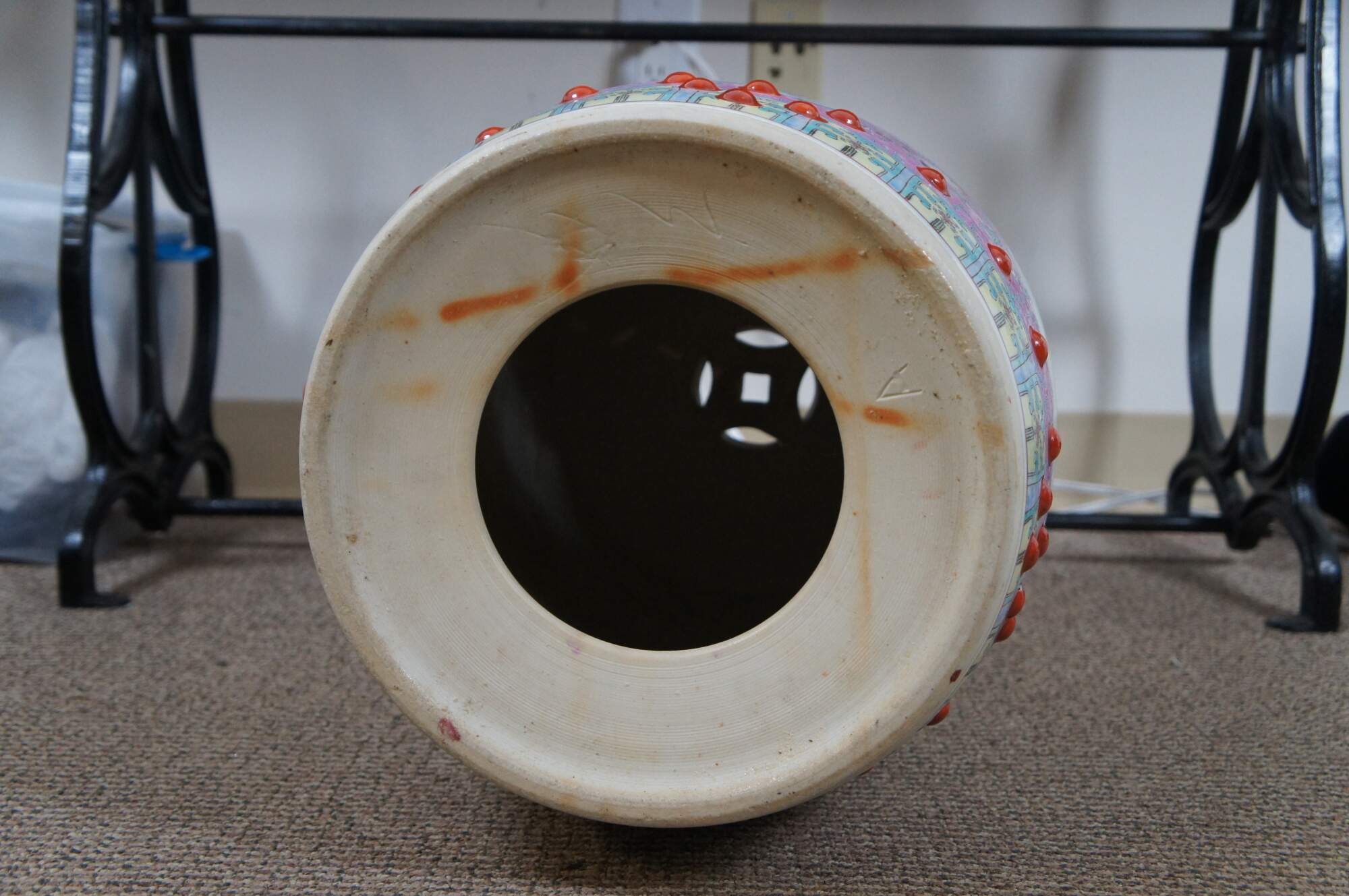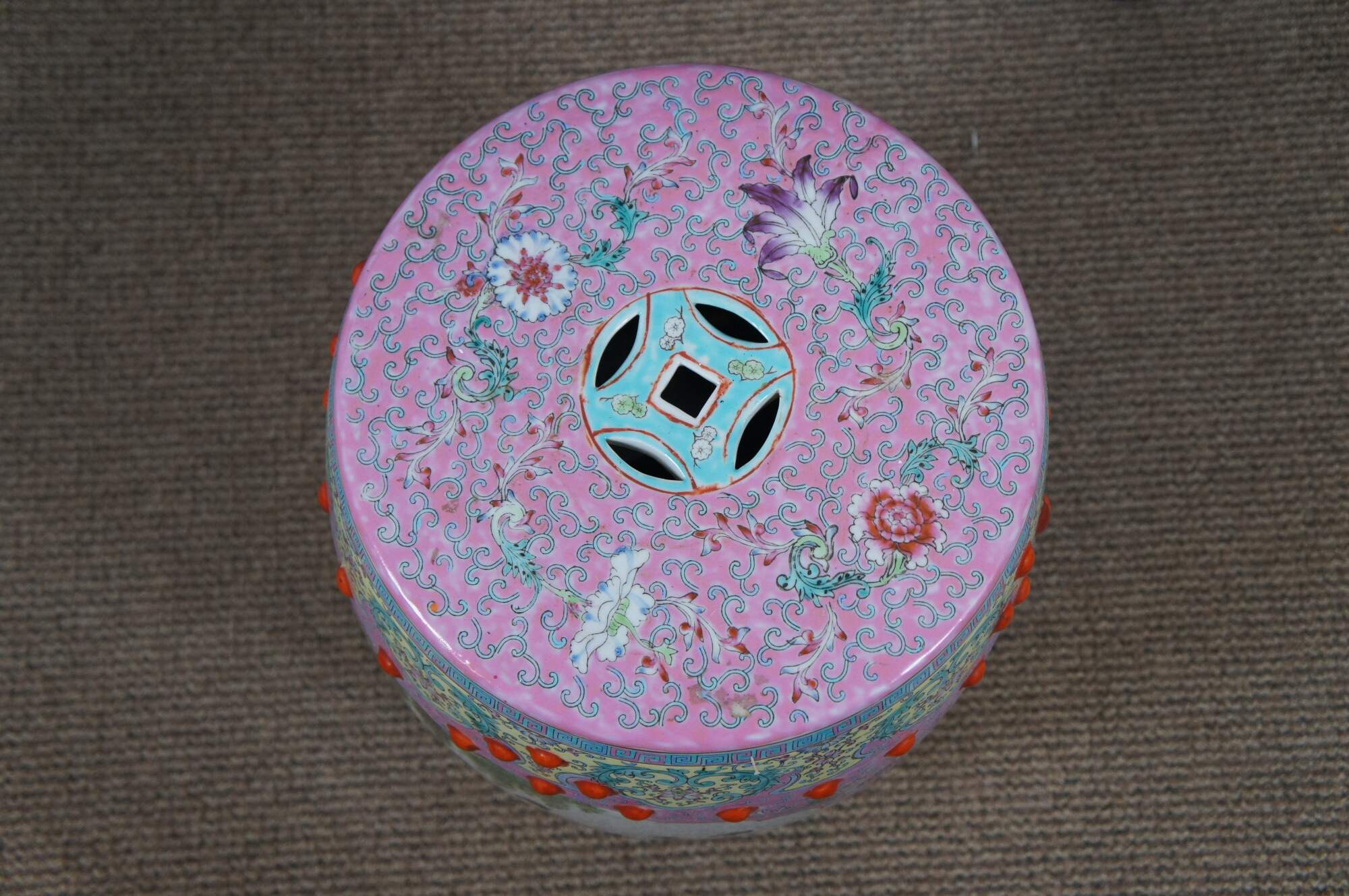 Vintage Chinese Famille Rose bright colorful ceramic garden seat, stool or occasional side table. Features a round and oblong body with the overall shape tapering slightly at the top as well as the bottom. The top of the stool features a pierced medallion with four long diamond-shaped piercings surrounding a square or diamond. This is accented by hand painted wild flowers and scolling designs.