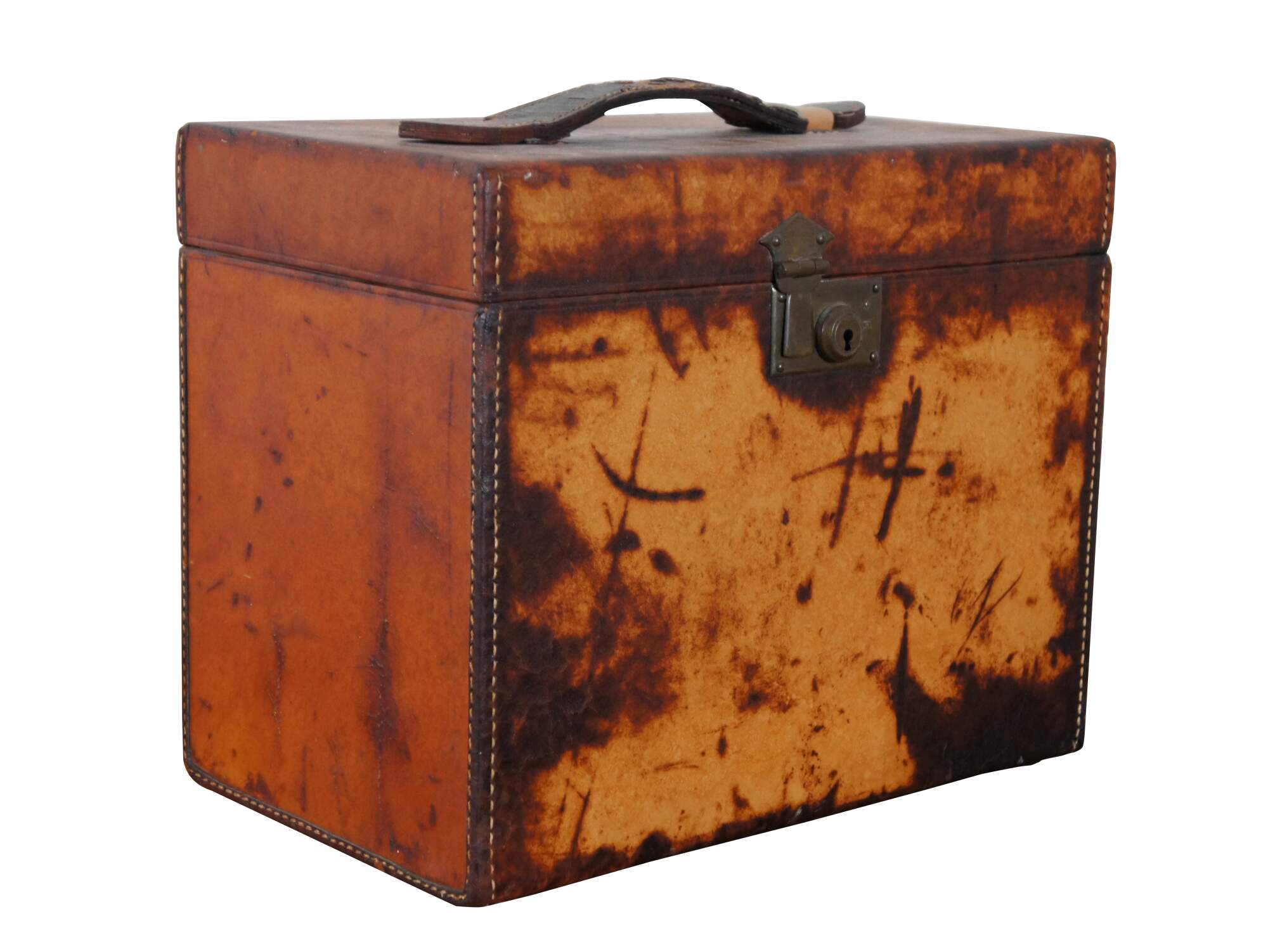 Fair Condition - Lid split from base; stains/bleaching/discoloration/dings/scuffs/peeling to leather; interior pretty good - a couple stains