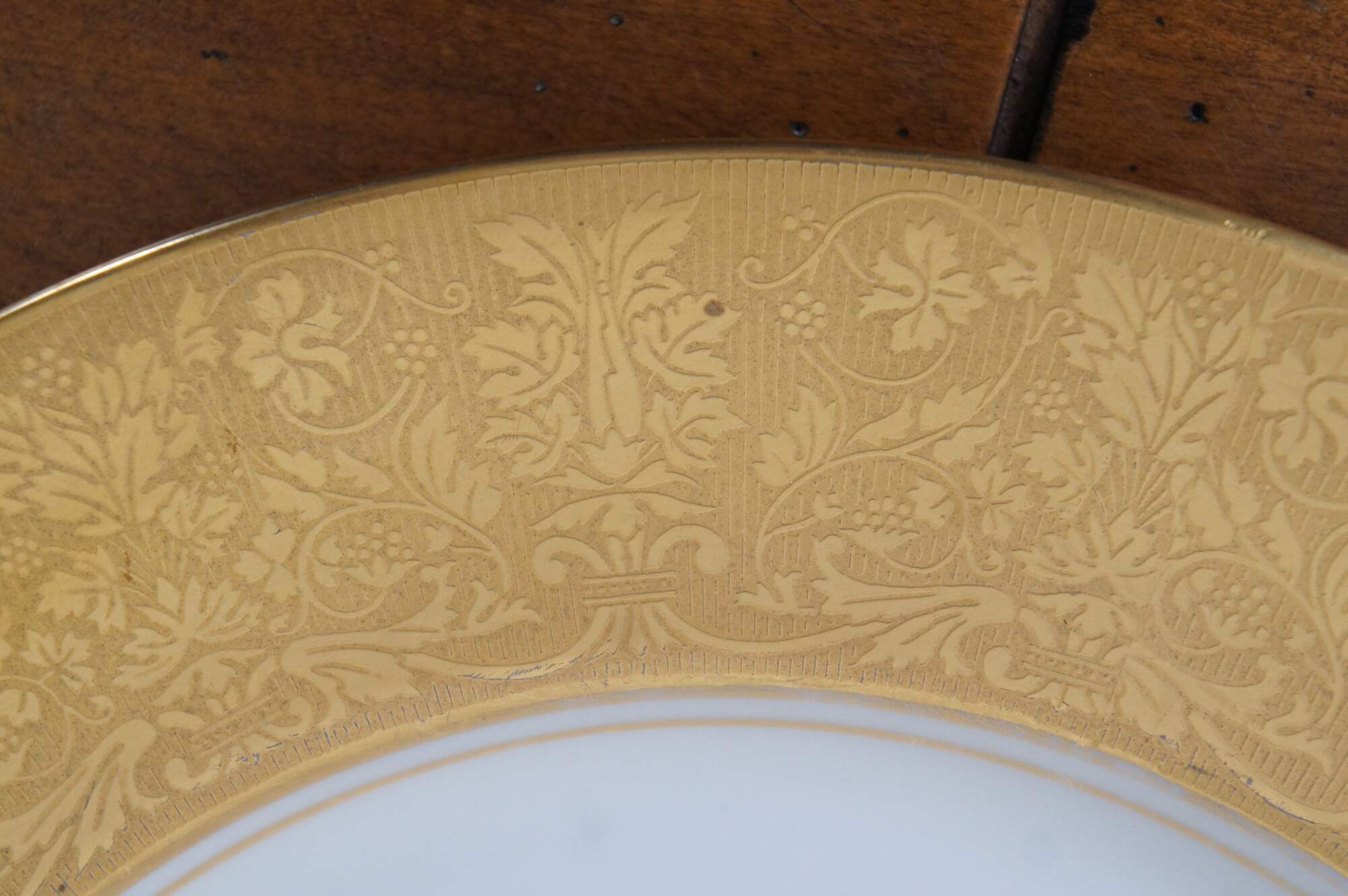 Set of 16 Heinrich & Company porcelain china dinner plates with broad edges encrusted in gold, embossed with florals, urns and grape vines.