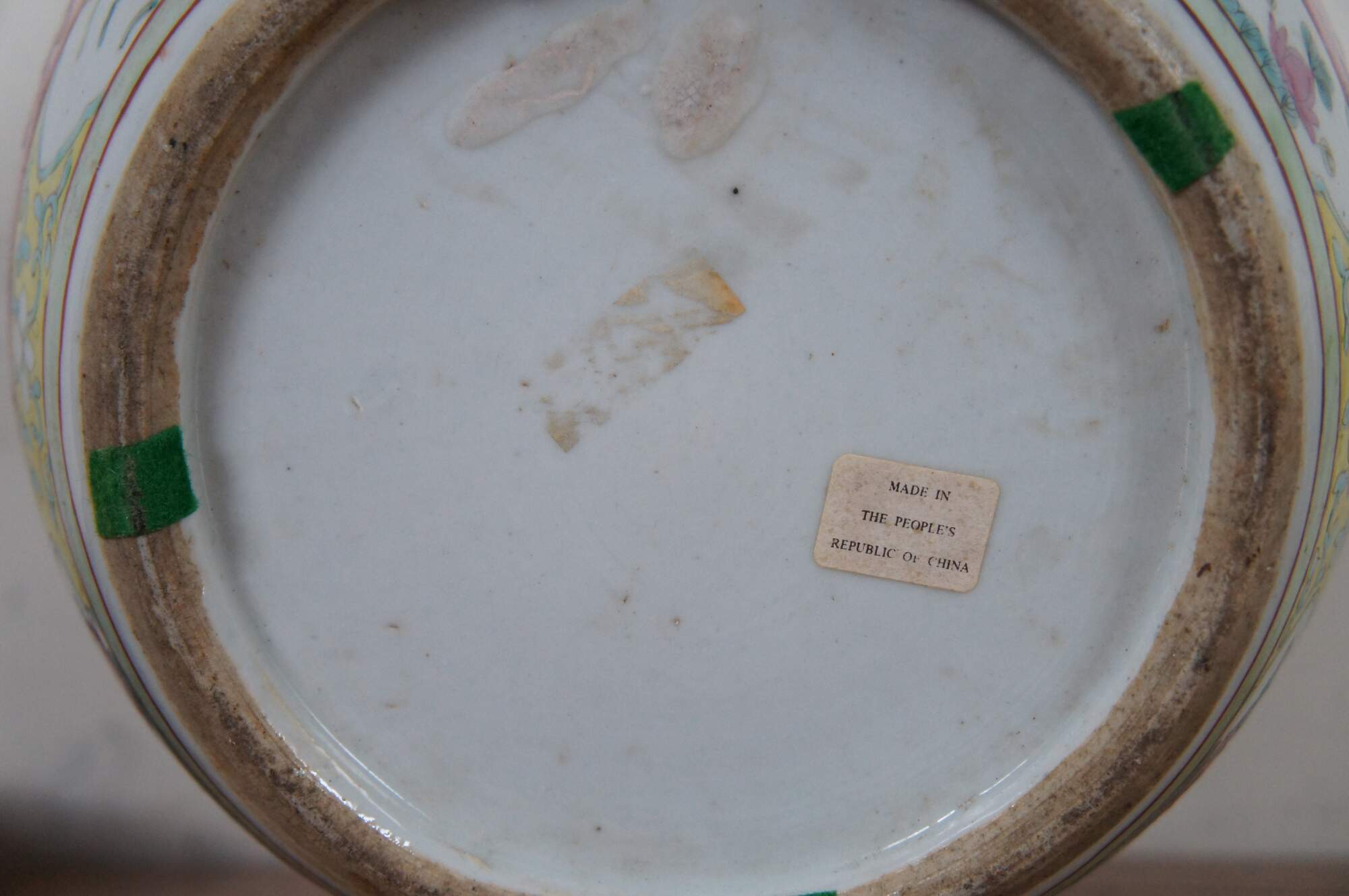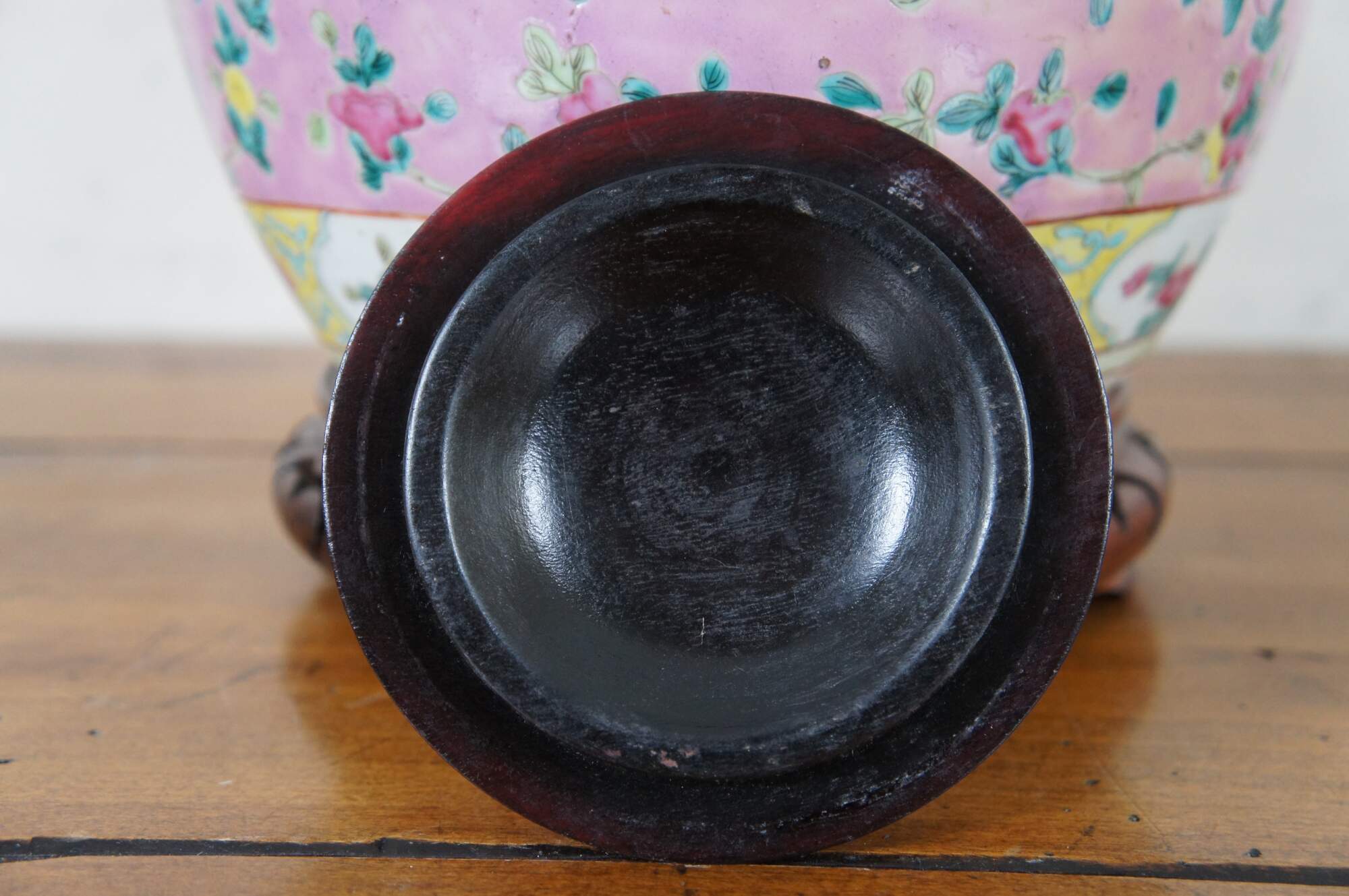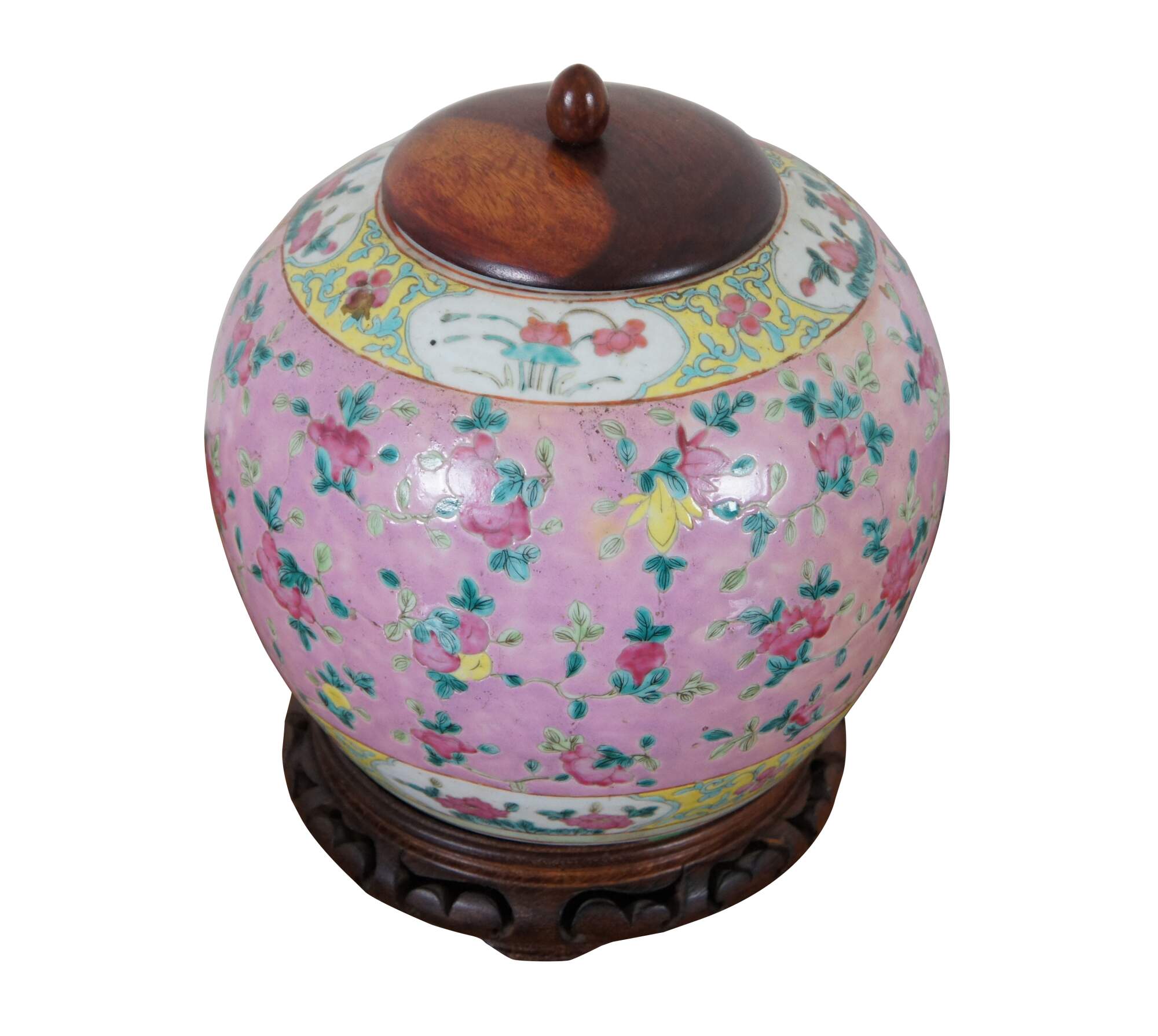 Vintage Chinese famille rose porcelain ginger jar featuring flowers and a bird on a pink and yellow background with wooden lid and stand. Made in the People’s Republic of China.