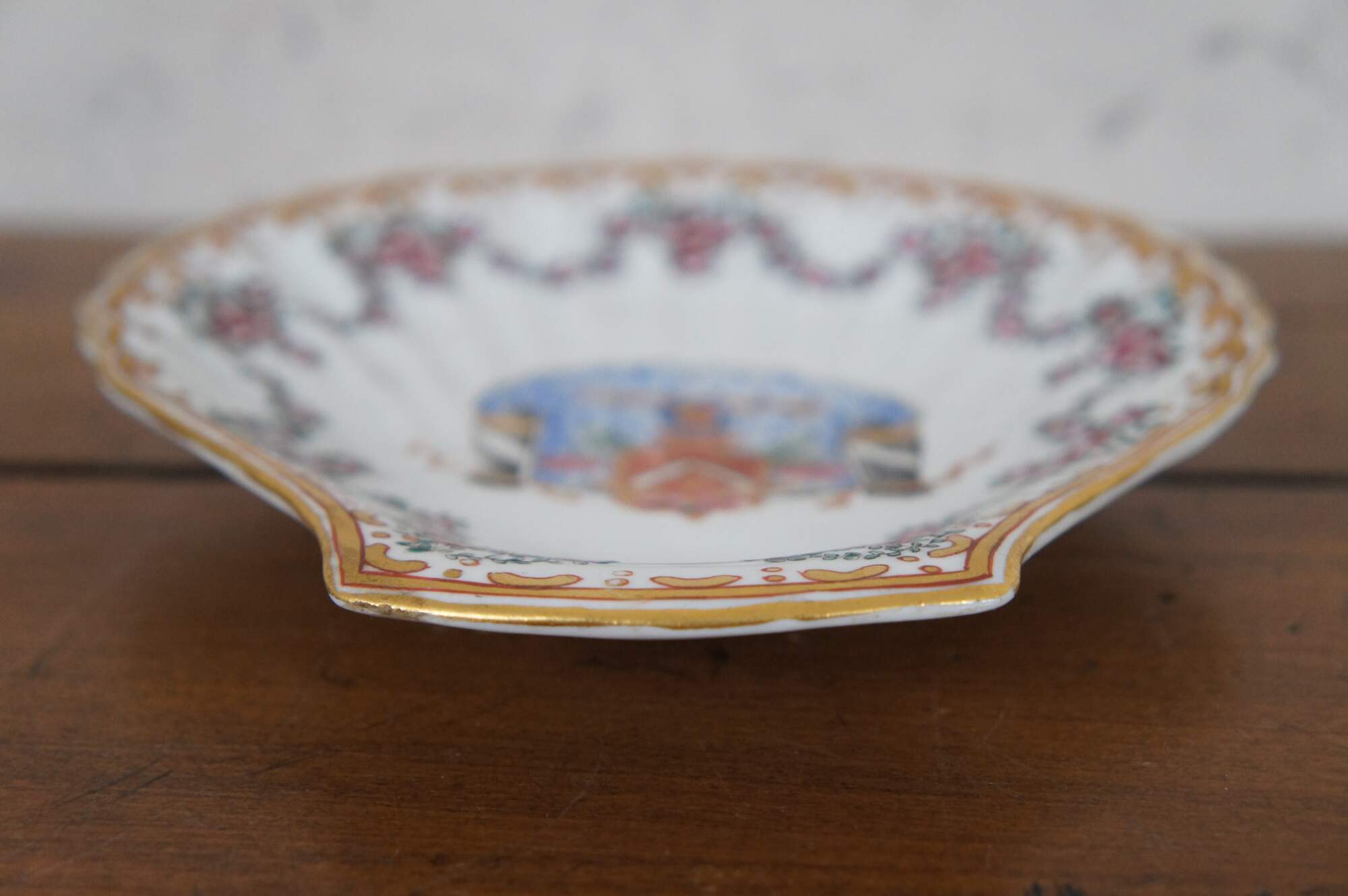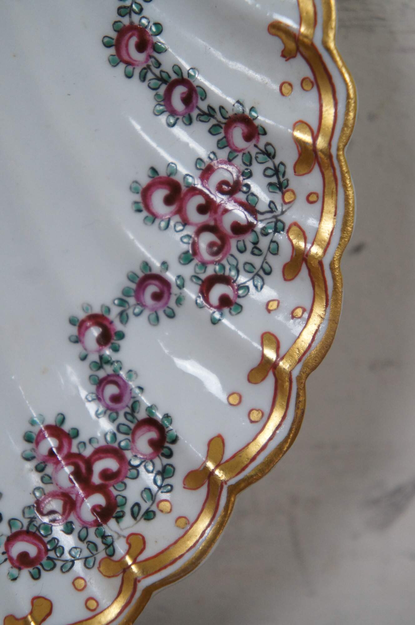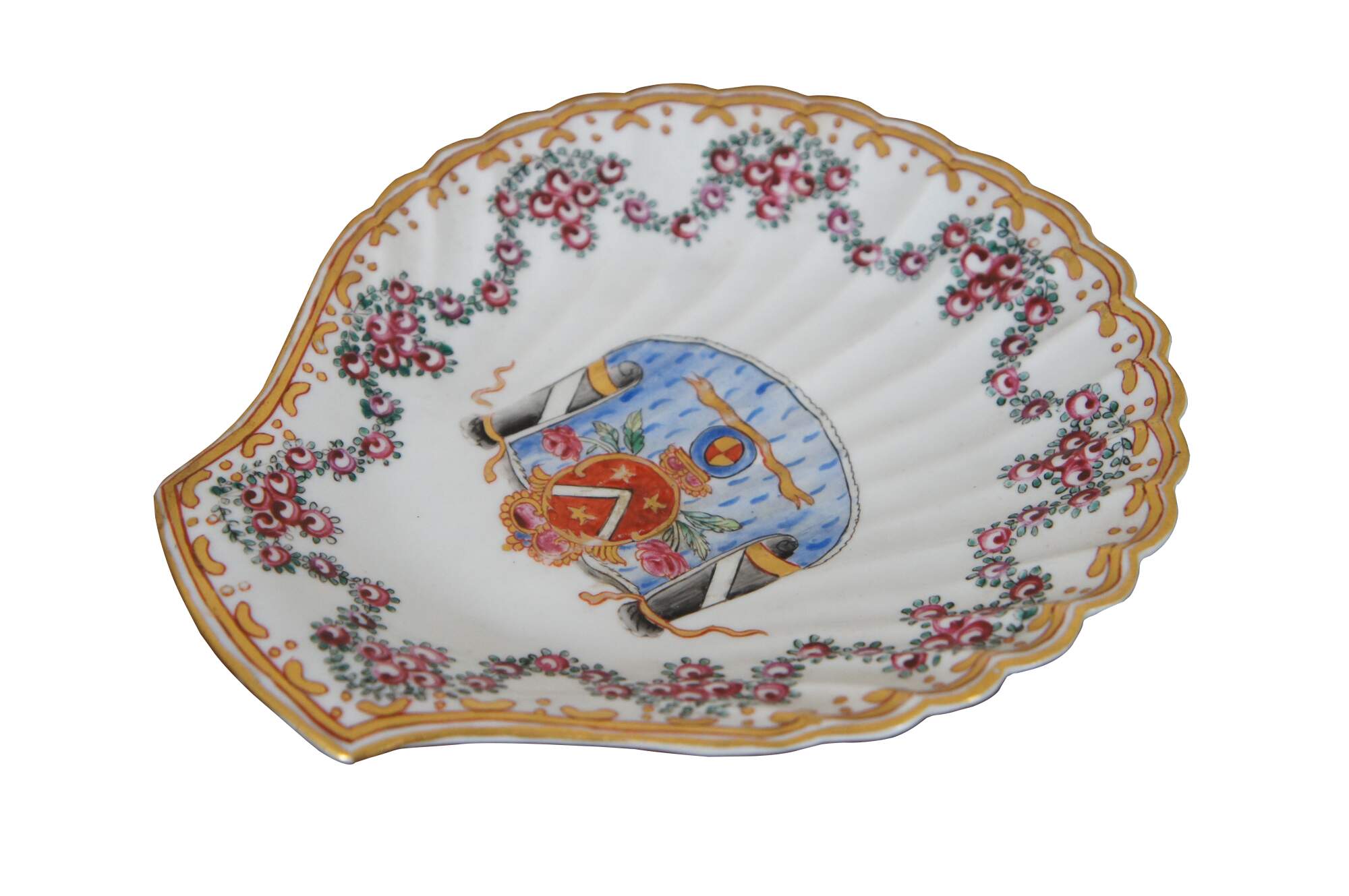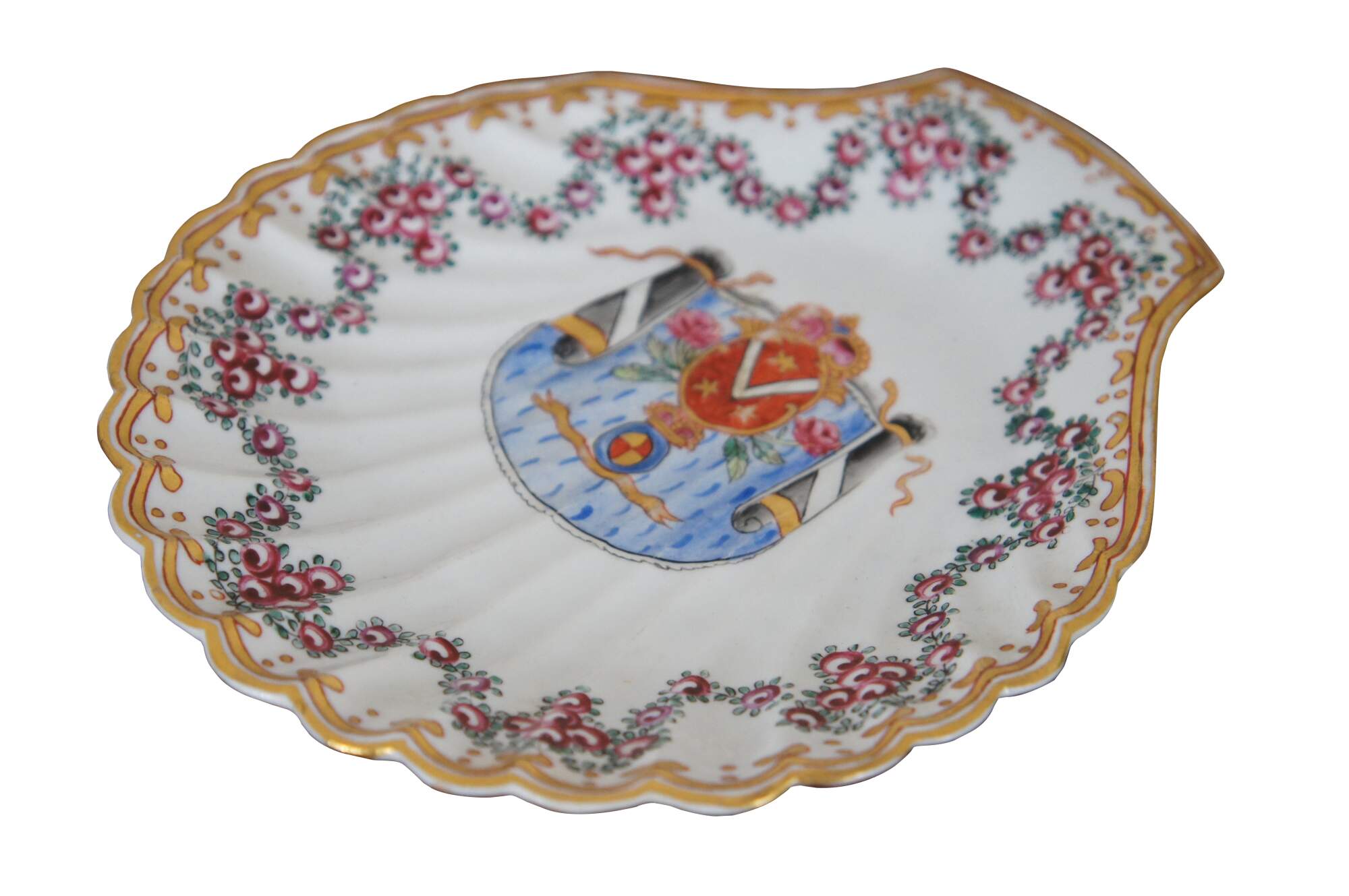 Mid 20th century (circa 1941-1957) hand painted Chinese Export style scallop shell porcelain dish, featuring gilded edges, a wreath of roses and an armorial central coat of arms / shield / crest motif, produced by Samson Edme et Cie.