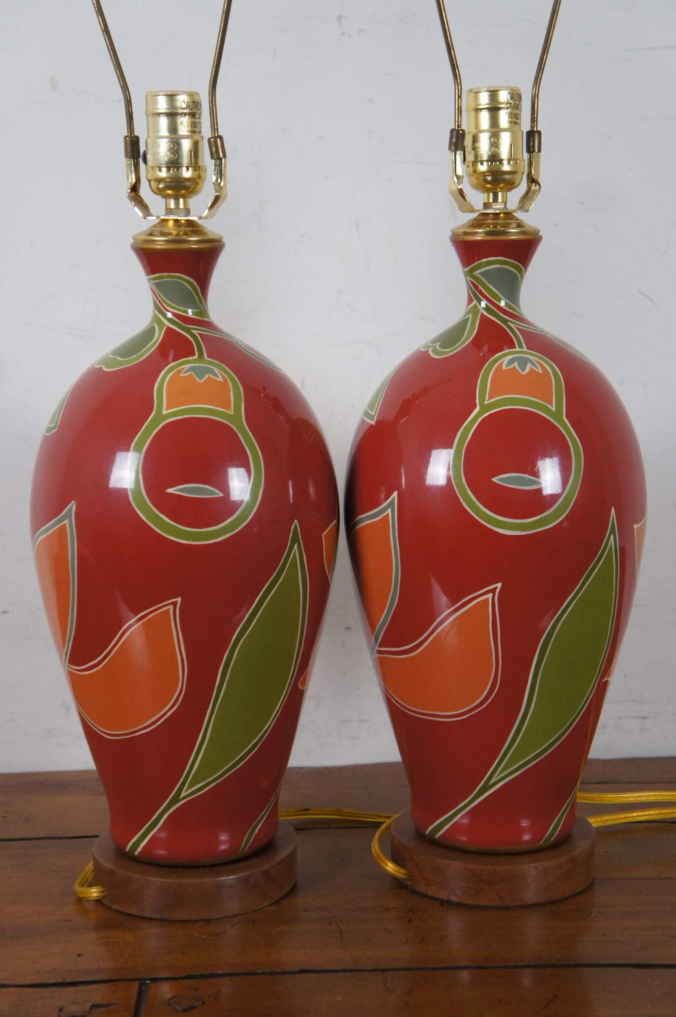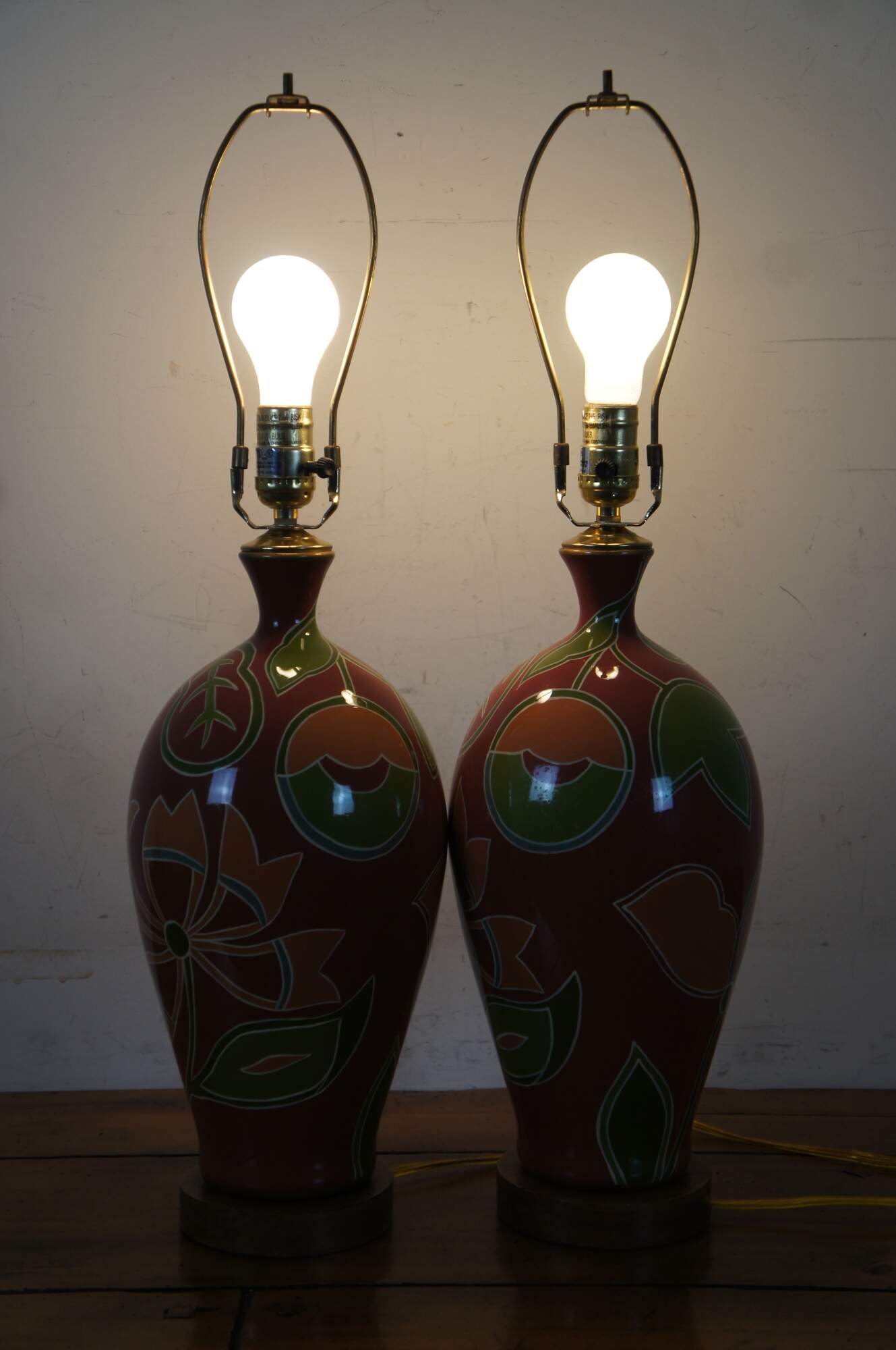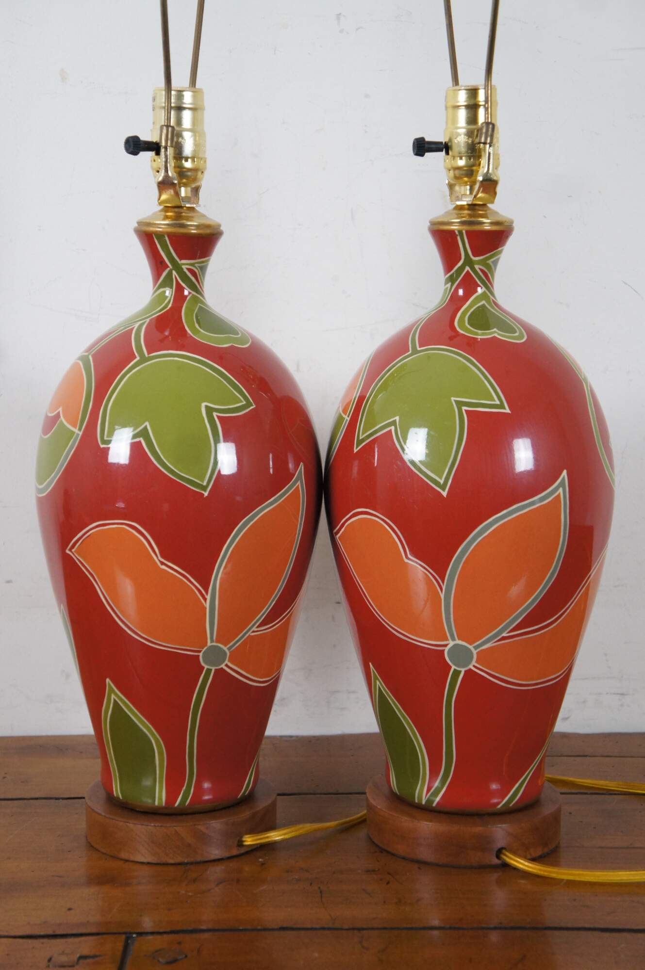 A beautiful pair of ceramic table lamps. Each features a tropical deisgn in red orange and green.
